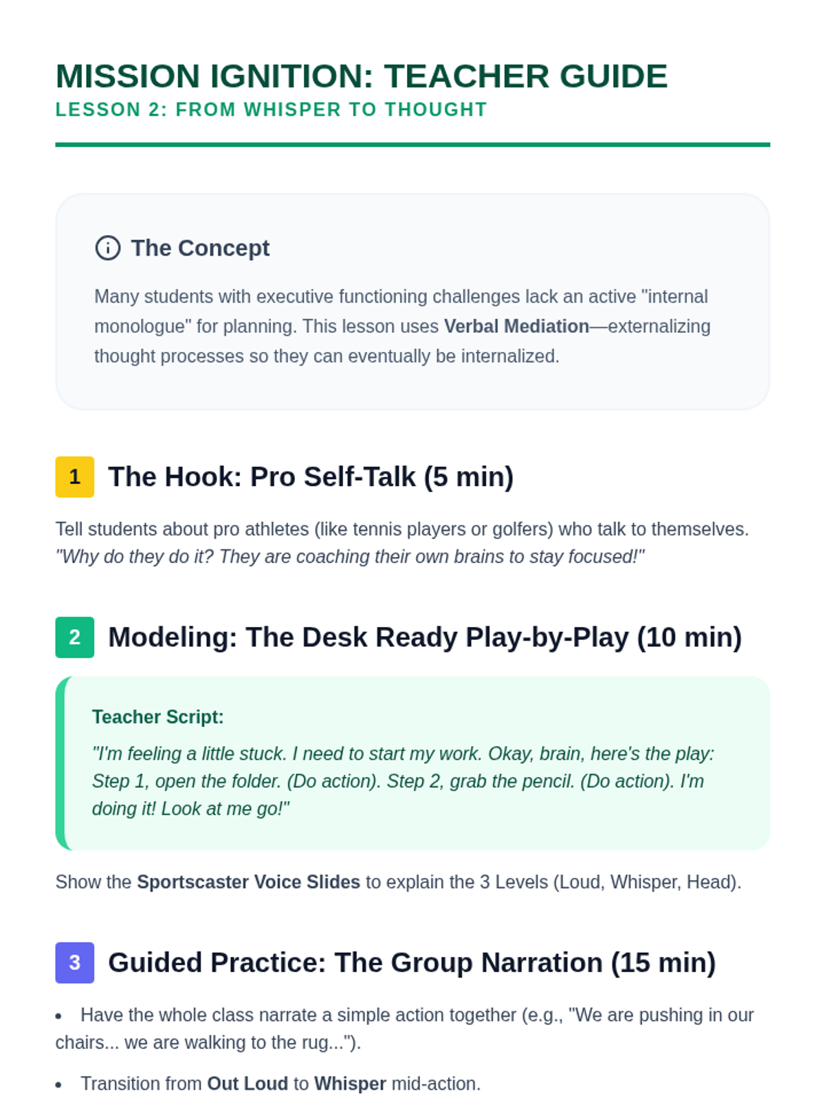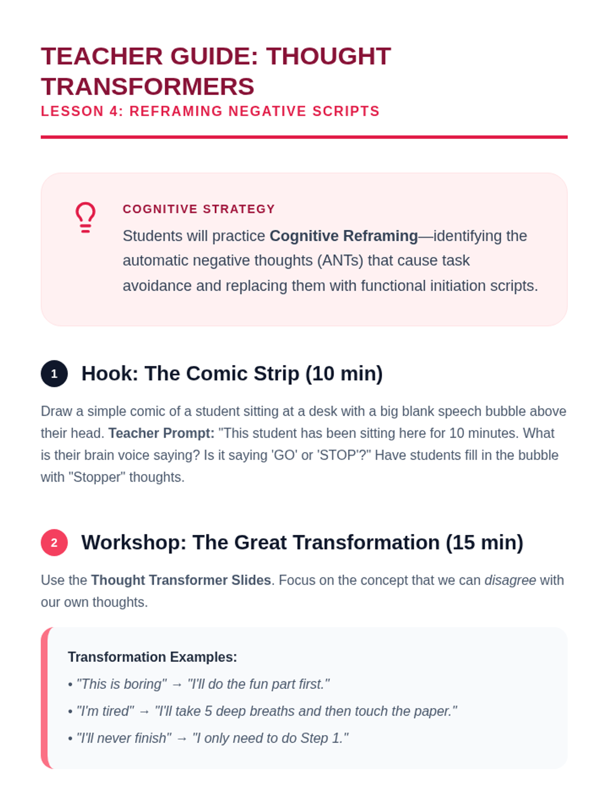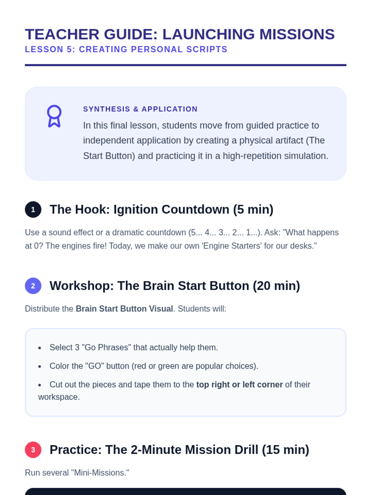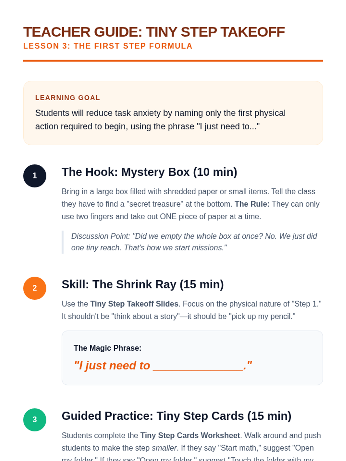 This sequence teaches 3rd-grade students how to use internal self-talk to overcome task initiation barriers. Students progress from recognizing the physical feeling of being 'stuck' to developing and using personalized 'Go Phrases' to start independent work.