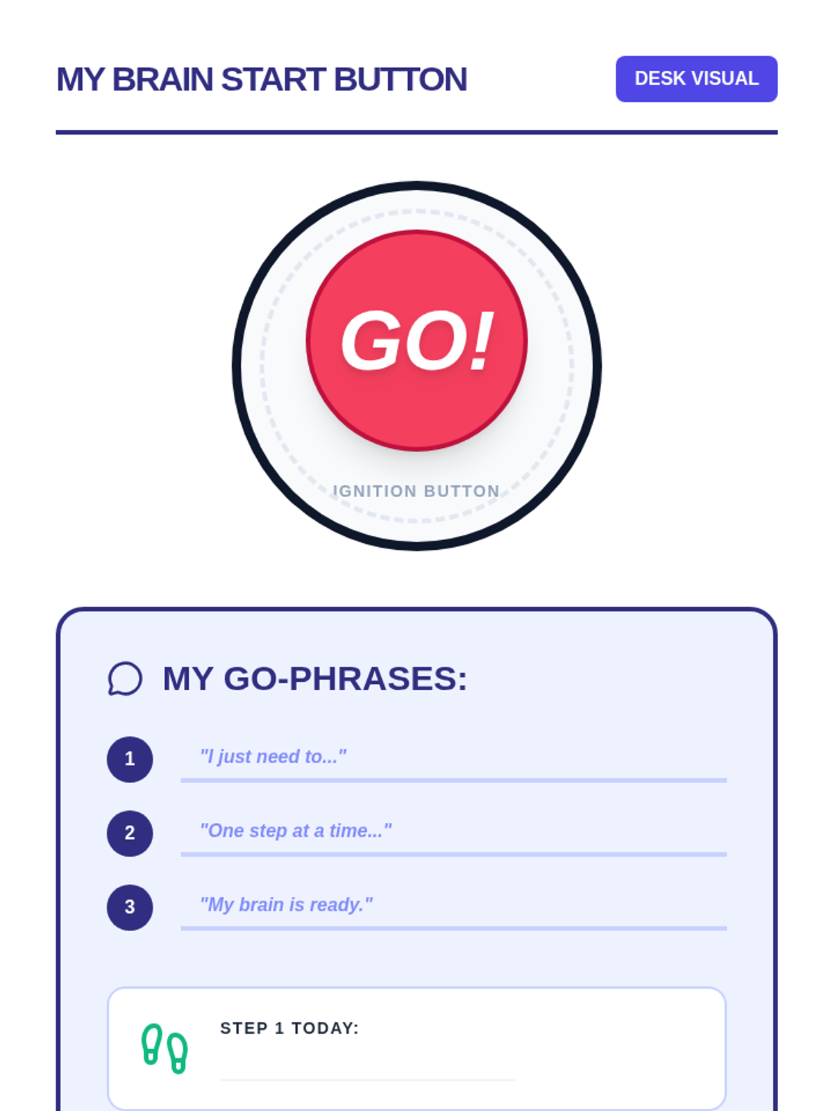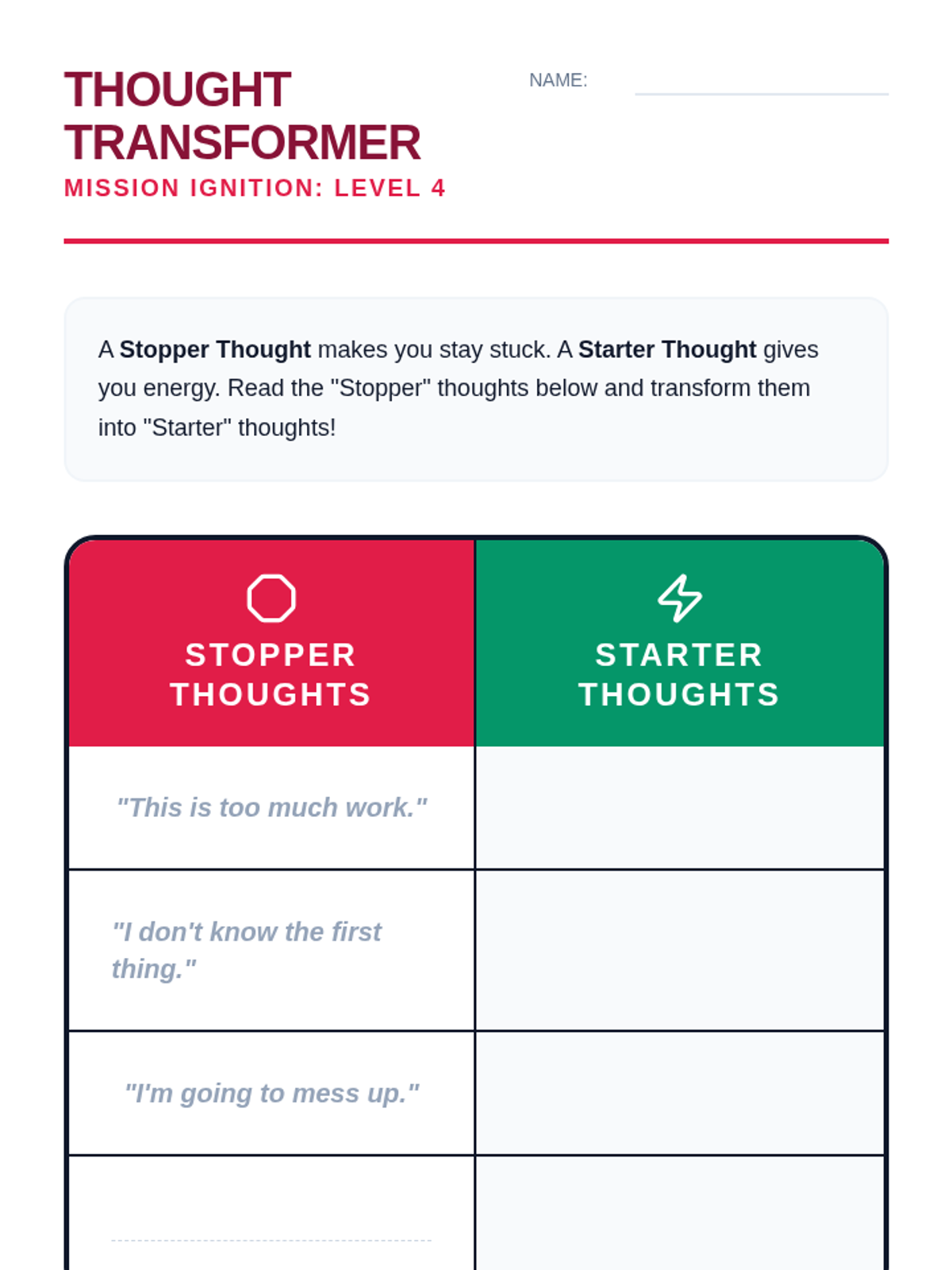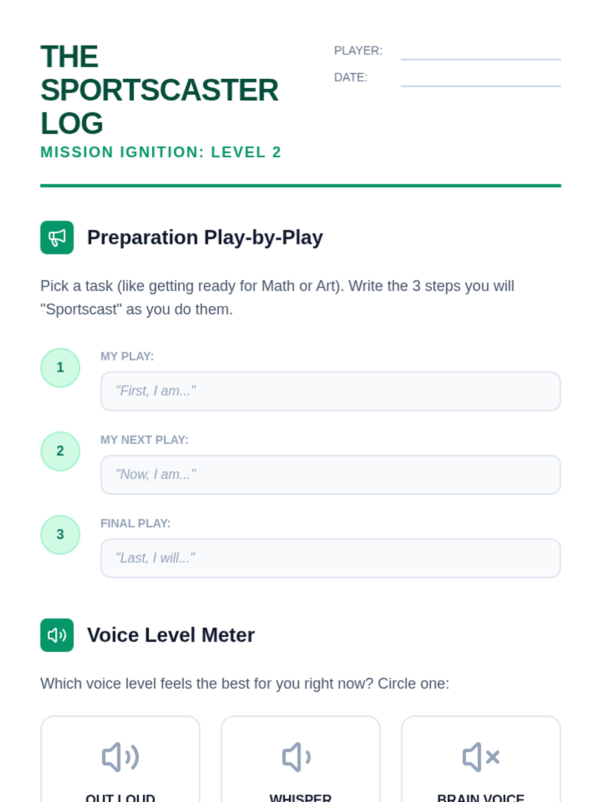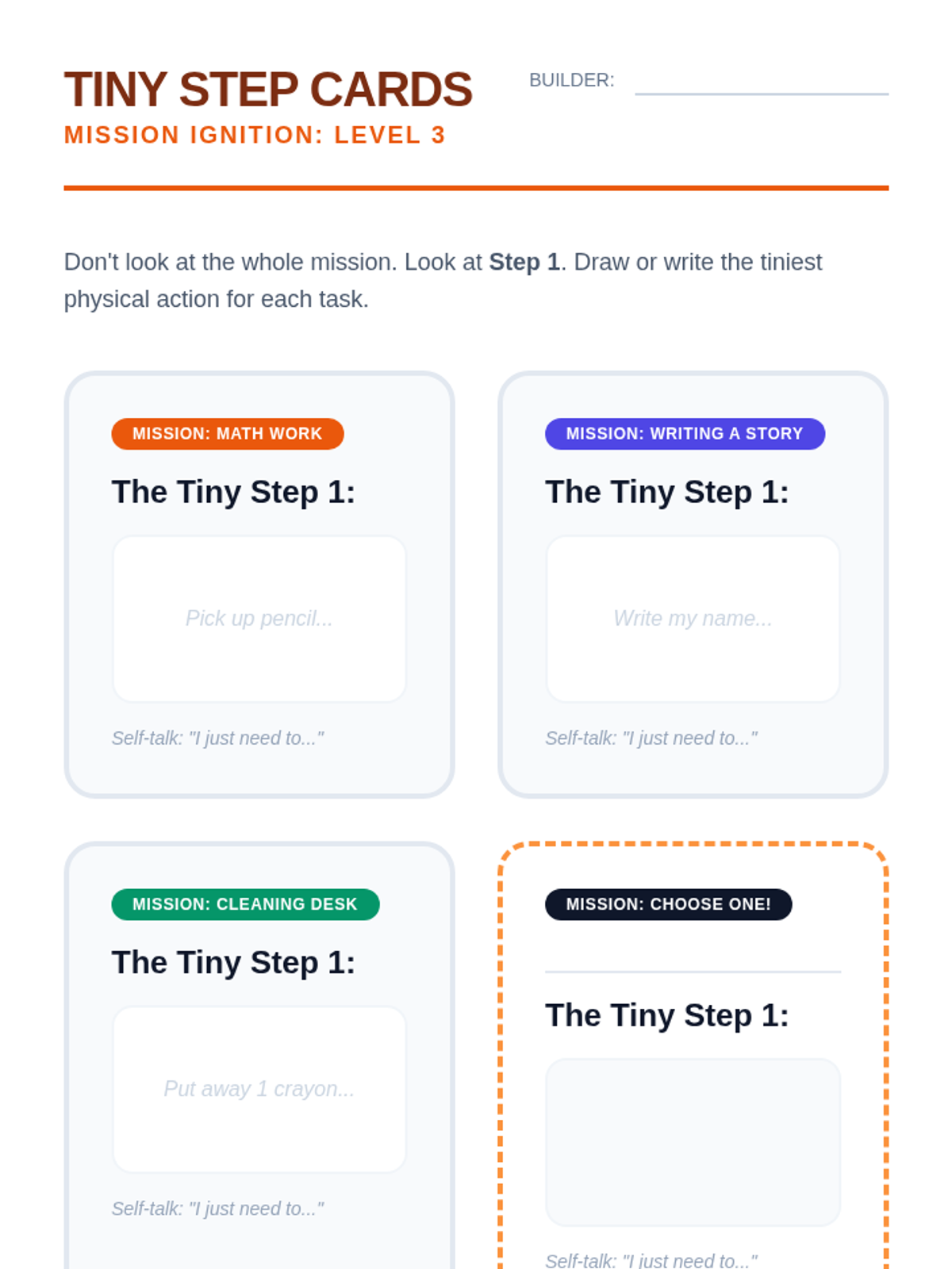 This sequence teaches 3rd-grade students how to use internal self-talk to overcome task initiation barriers. Students progress from recognizing the physical feeling of being 'stuck' to developing and using personalized 'Go Phrases' to start independent work.