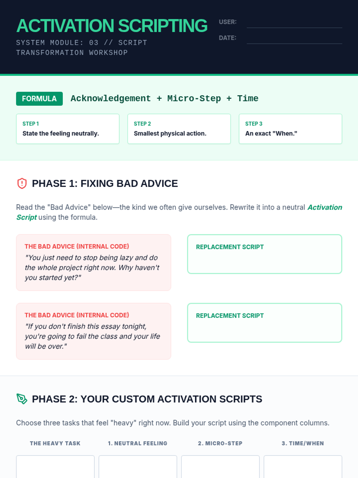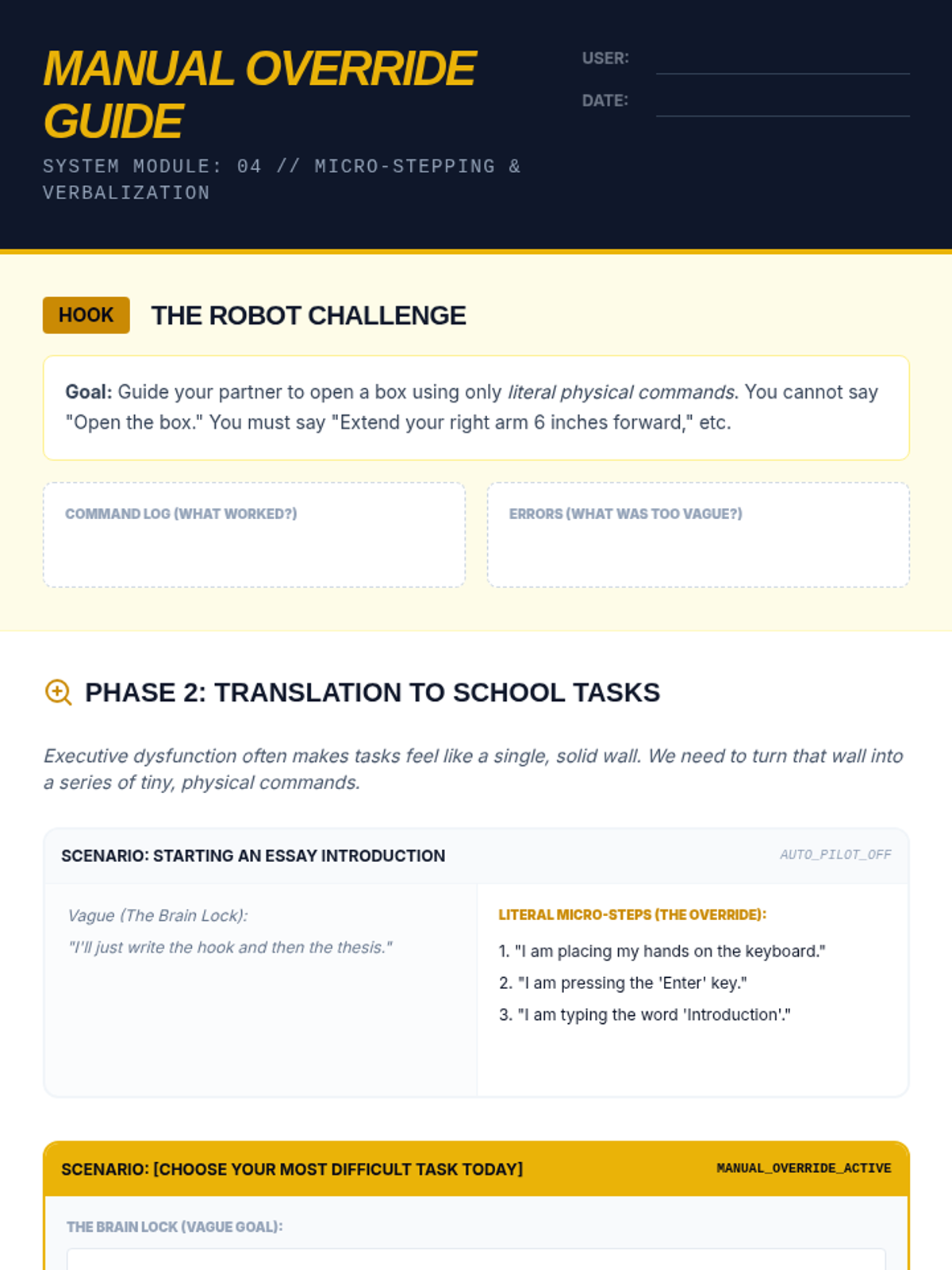 A 5-lesson series designed for 10th-grade students to master executive function through cognitive restructuring. Students learn to identify internal monologues that cause task avoidance, dismantle emotional barriers, and create specific verbal 'activation scripts' to initiate difficult work.