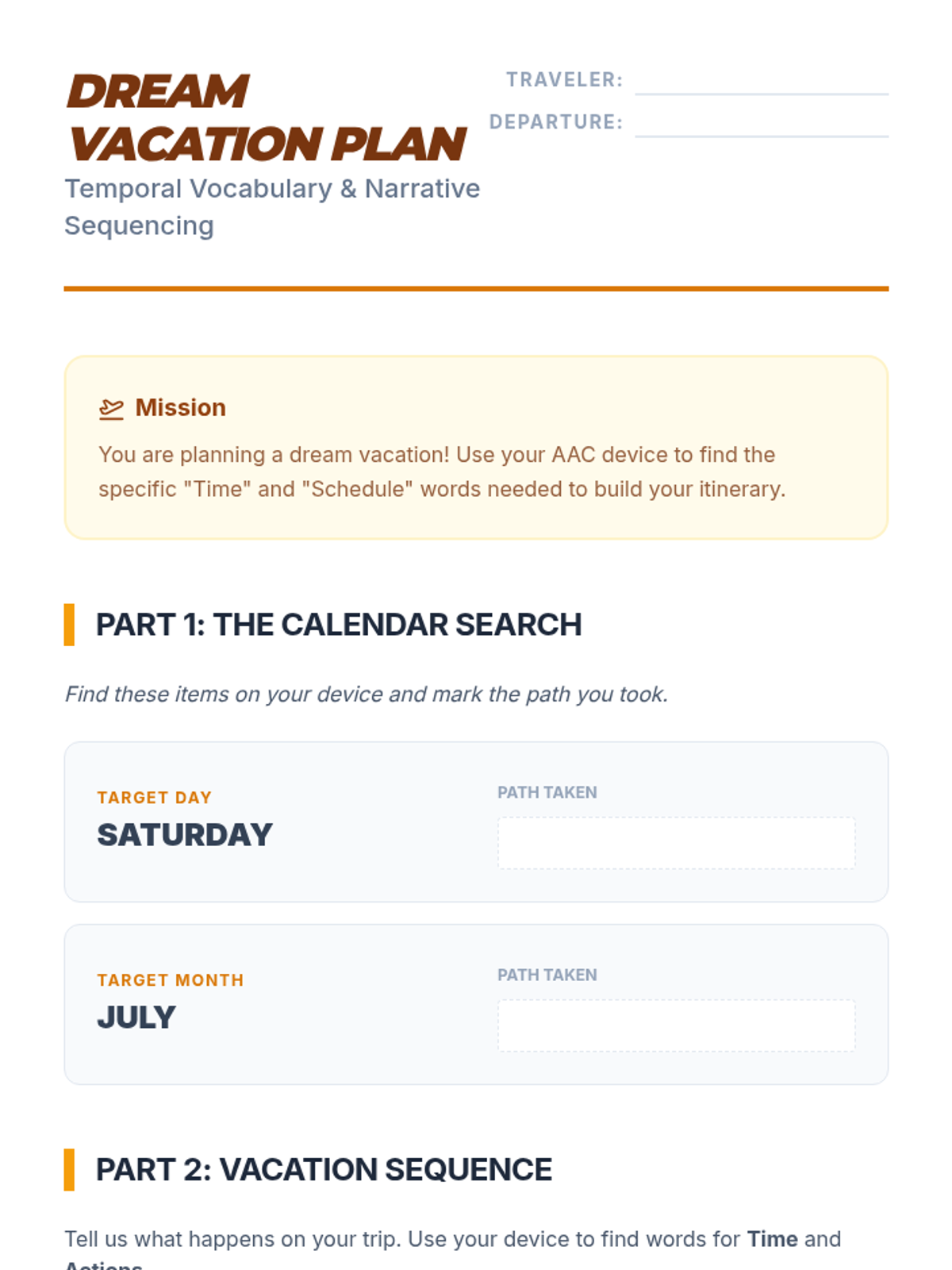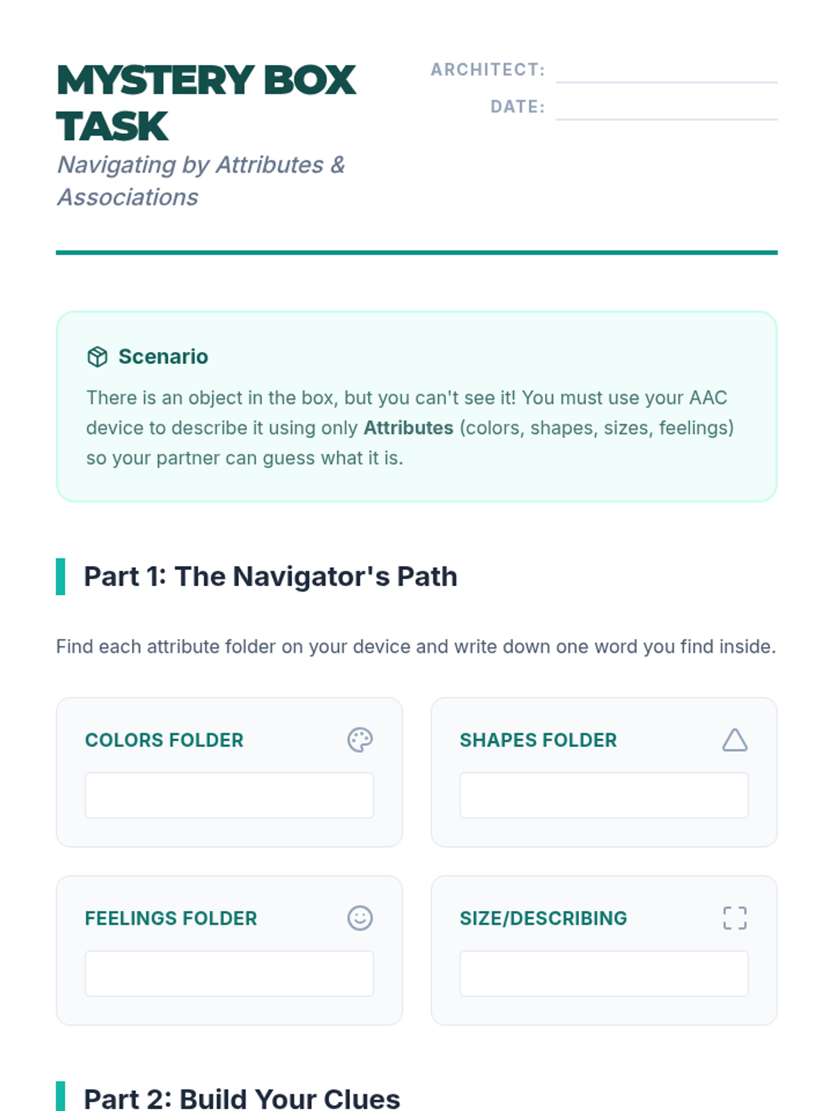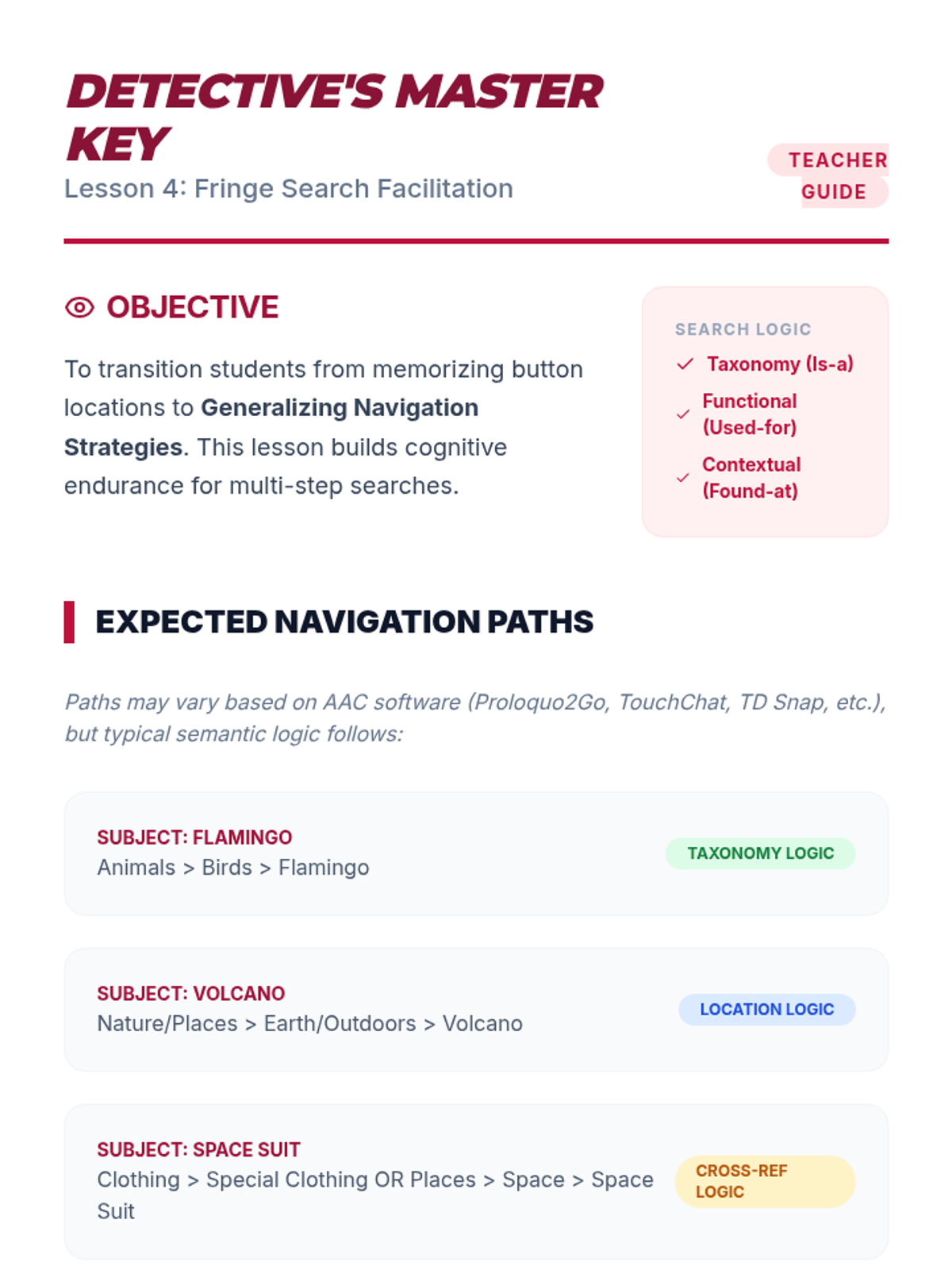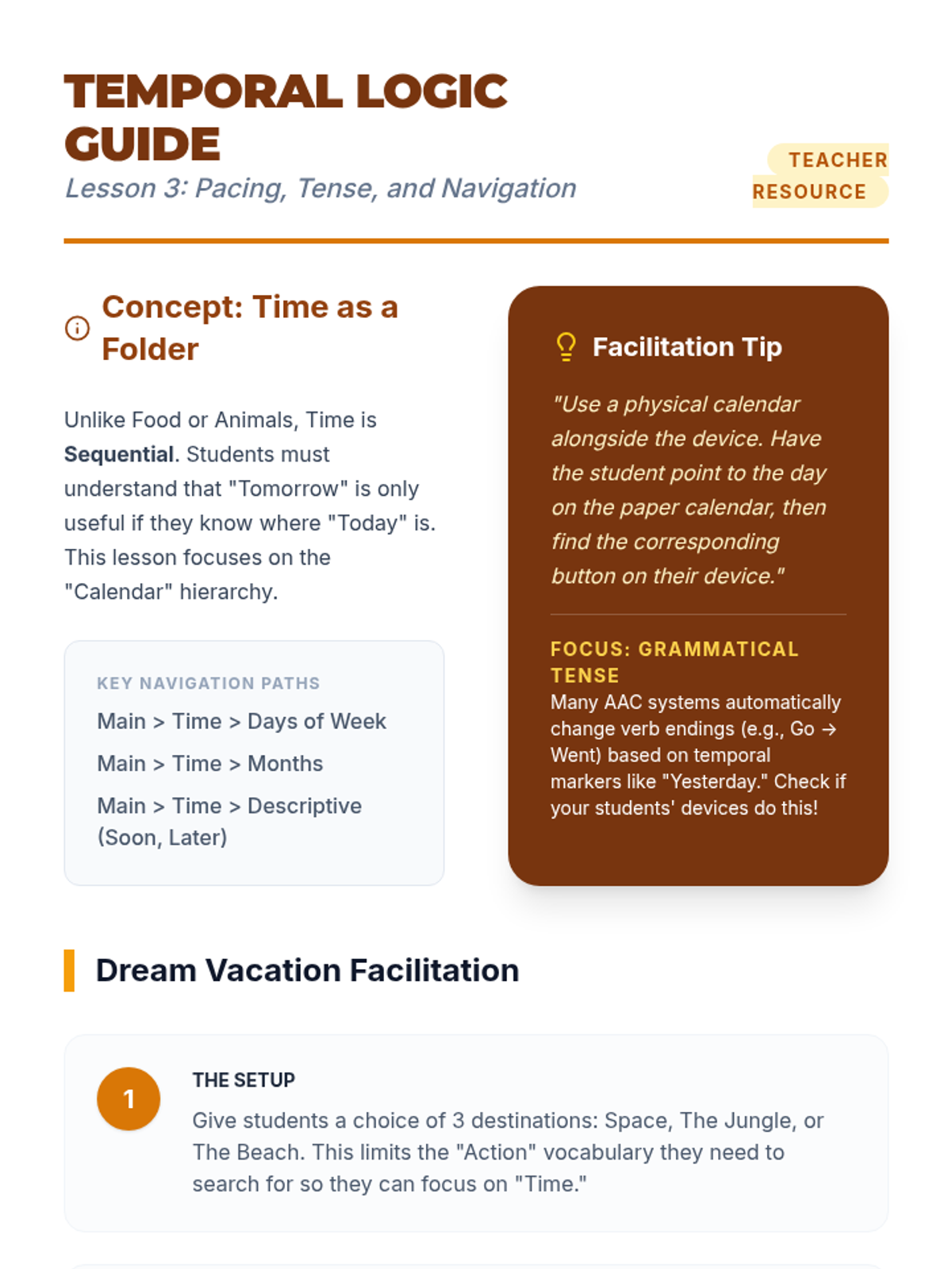 Students explore the logical organization of AAC devices to understand semantic associations and category hierarchies, moving from concrete to abstract concepts.