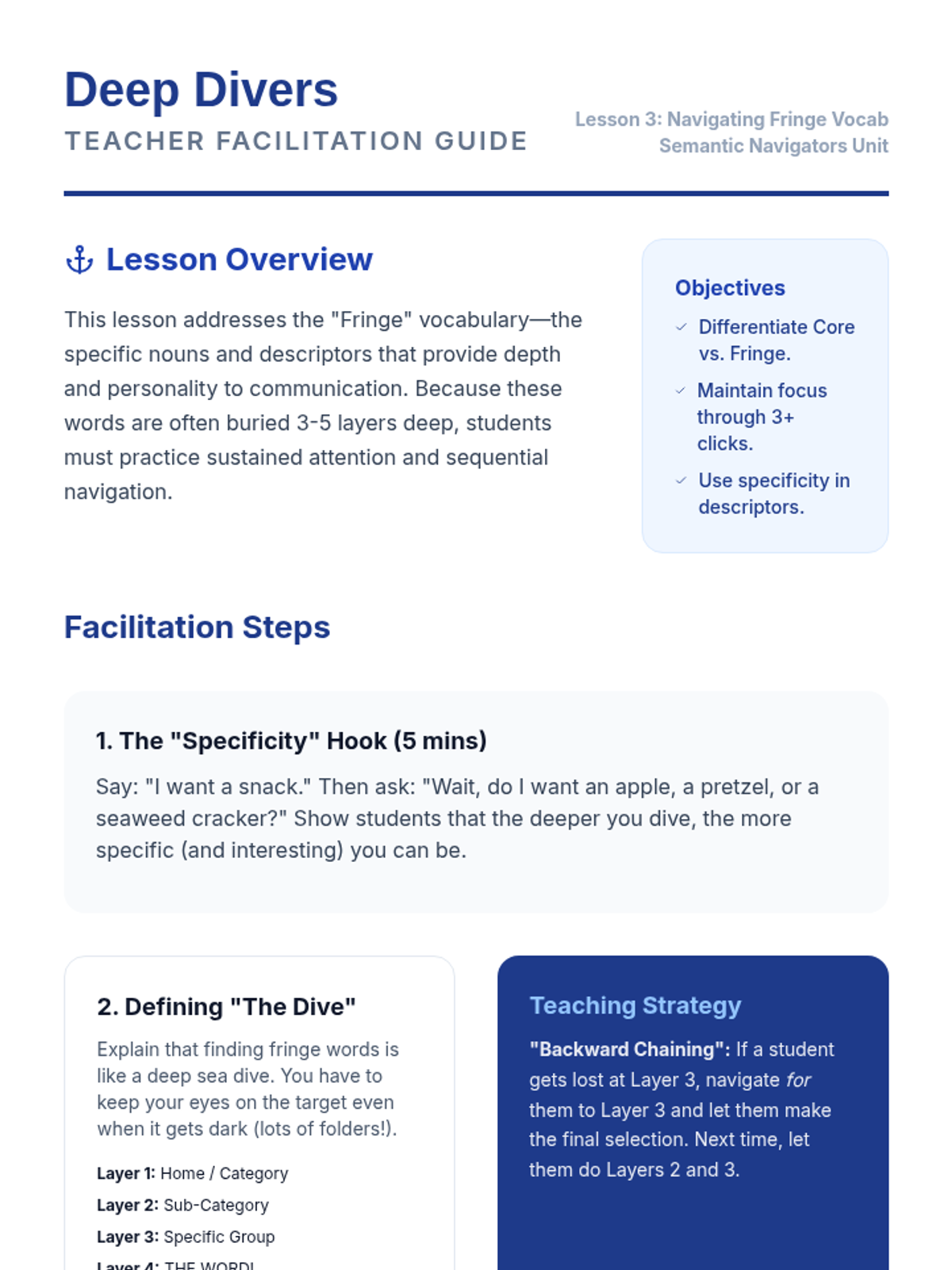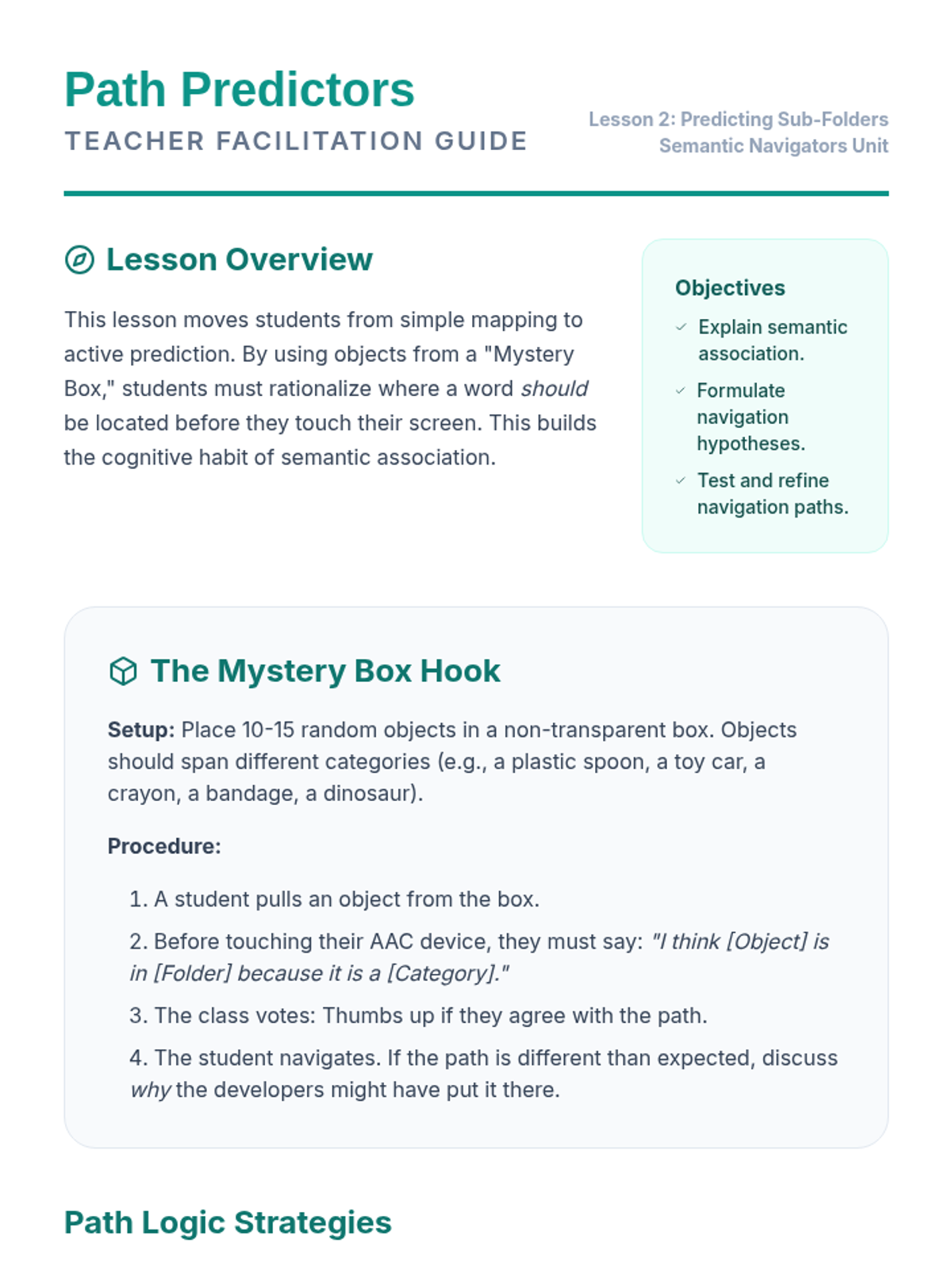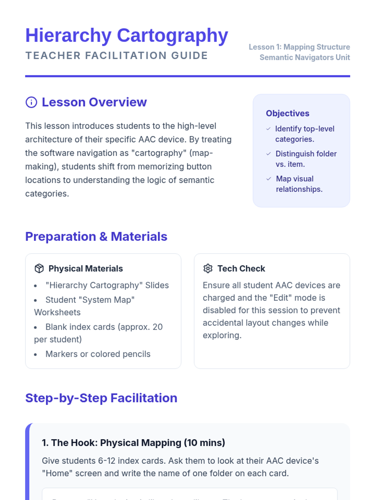 A comprehensive unit for 8th-grade students focusing on the logical organization of semantic hierarchies within AAC software. Students learn to map systems, predict sub-folder locations, find fringe vocabulary, and manage cross-categorization to improve communication efficiency and speed.