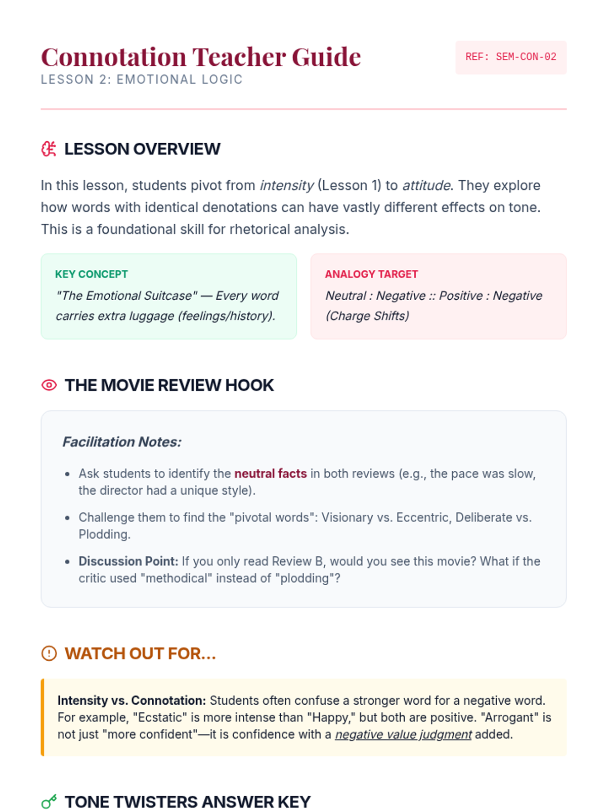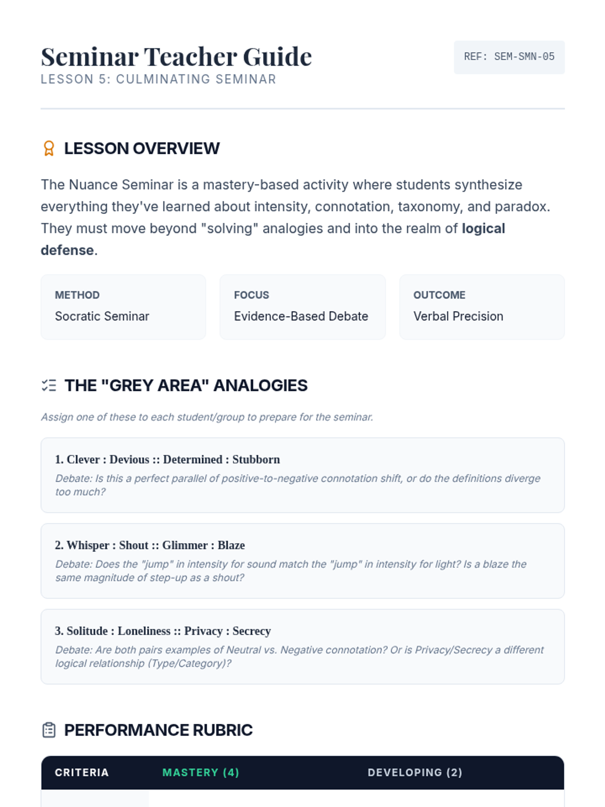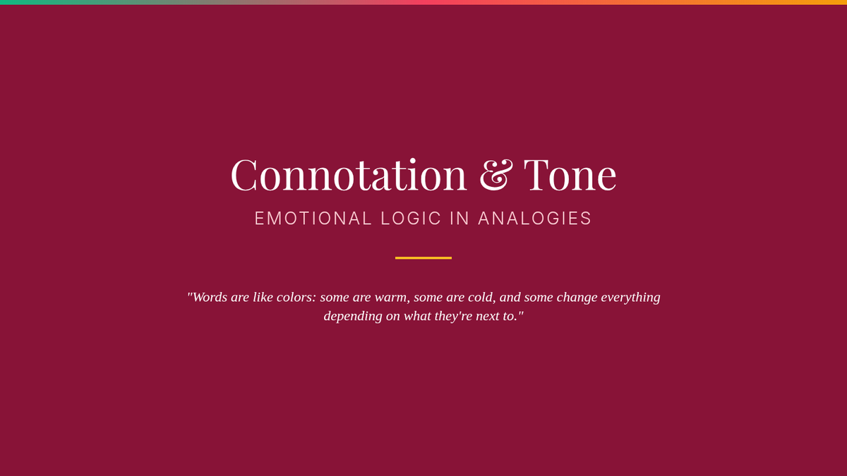 An advanced 11th-grade ELA sequence exploring semantic nuance through analogies. Students analyze word intensity, connotation, taxonomy, and paradoxical relationships to master verbal precision and logical reasoning.