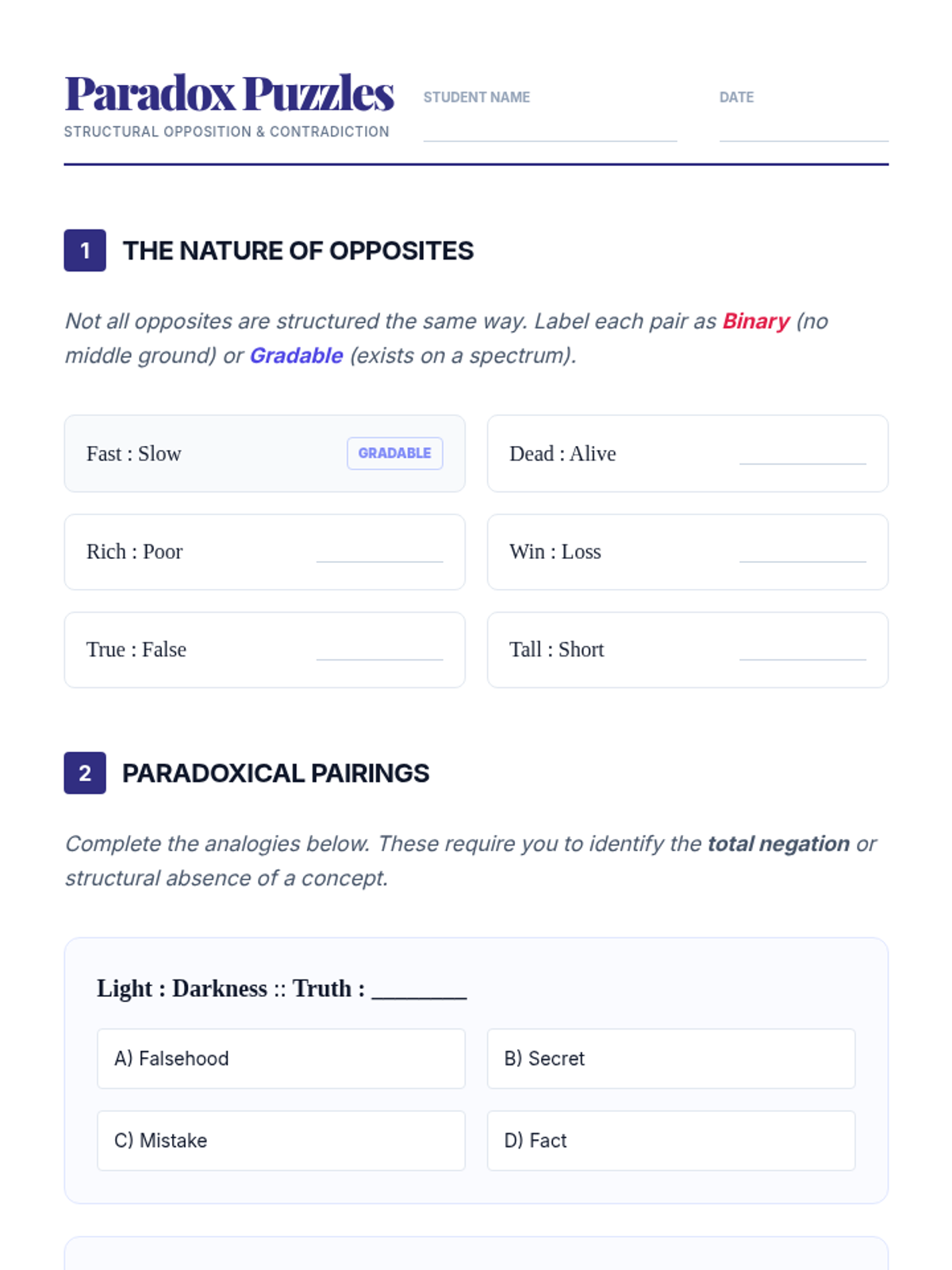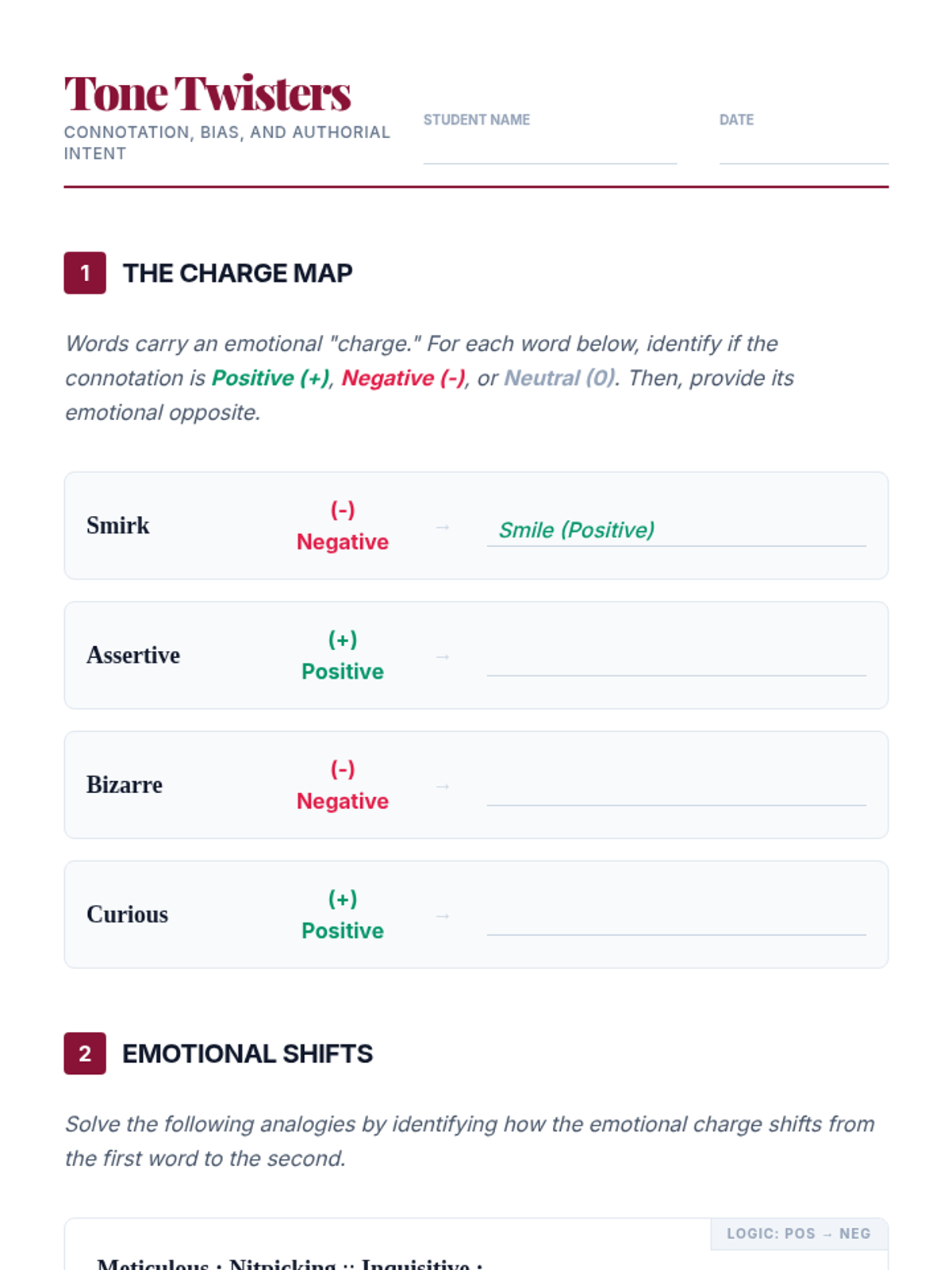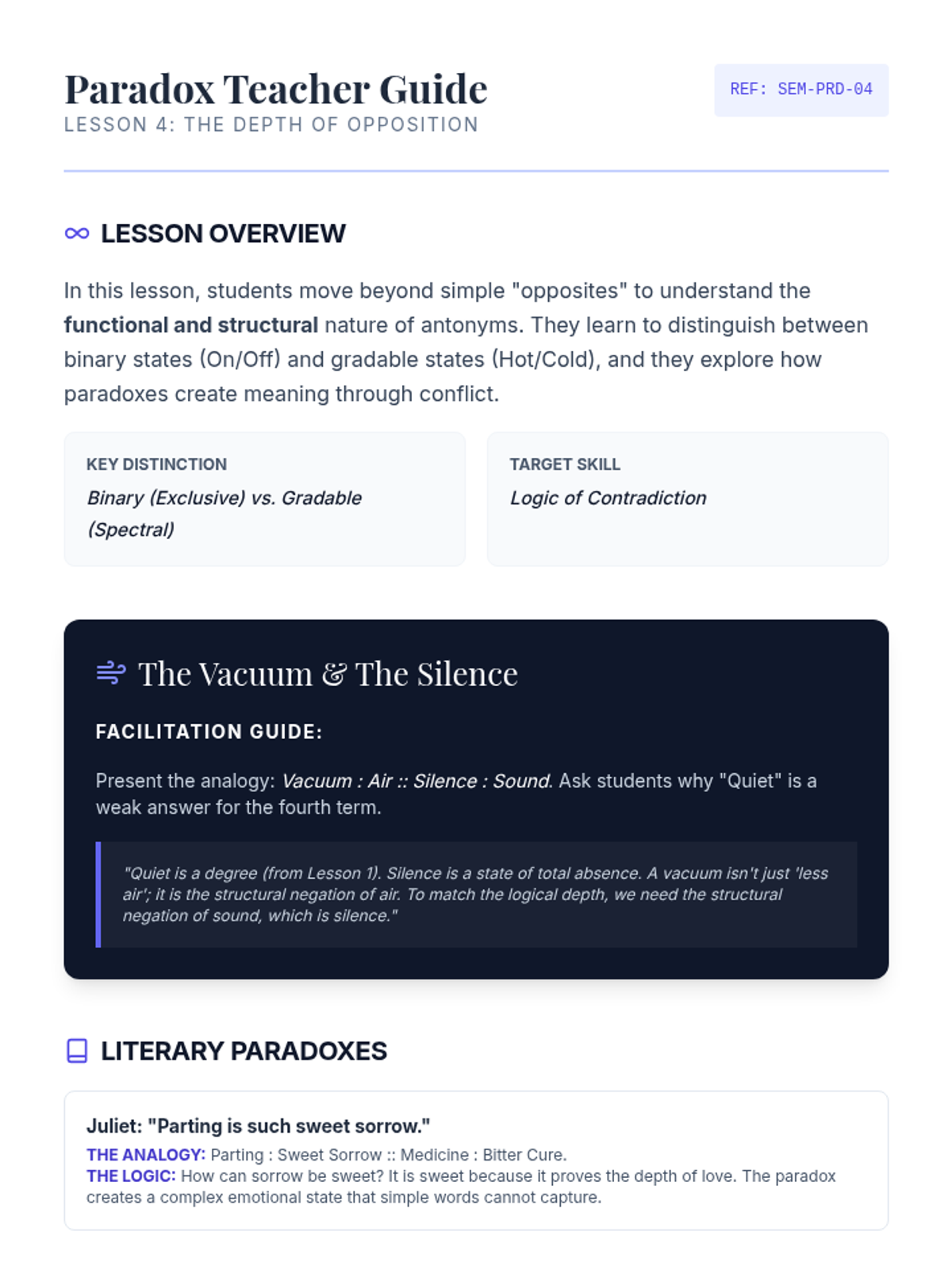 An advanced 11th-grade ELA sequence exploring semantic nuance through analogies. Students analyze word intensity, connotation, taxonomy, and paradoxical relationships to master verbal precision and logical reasoning.