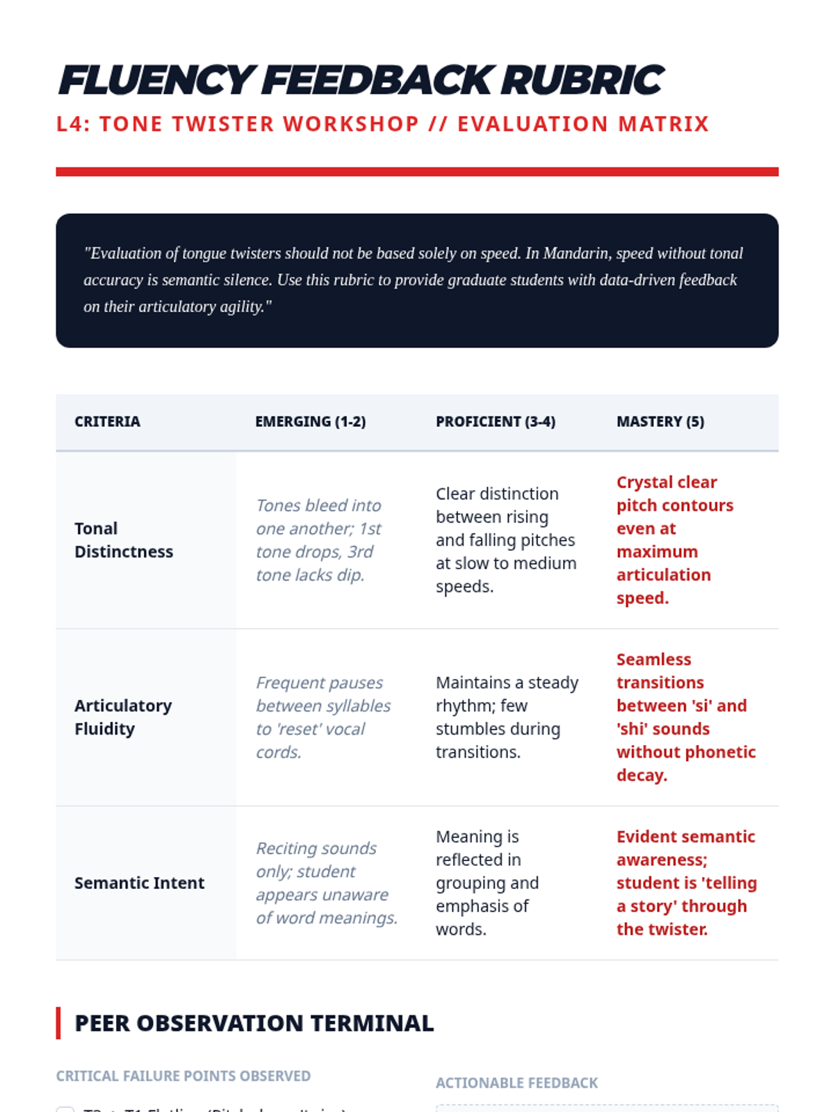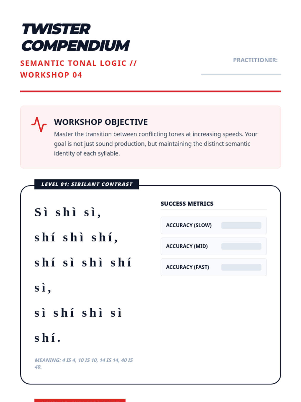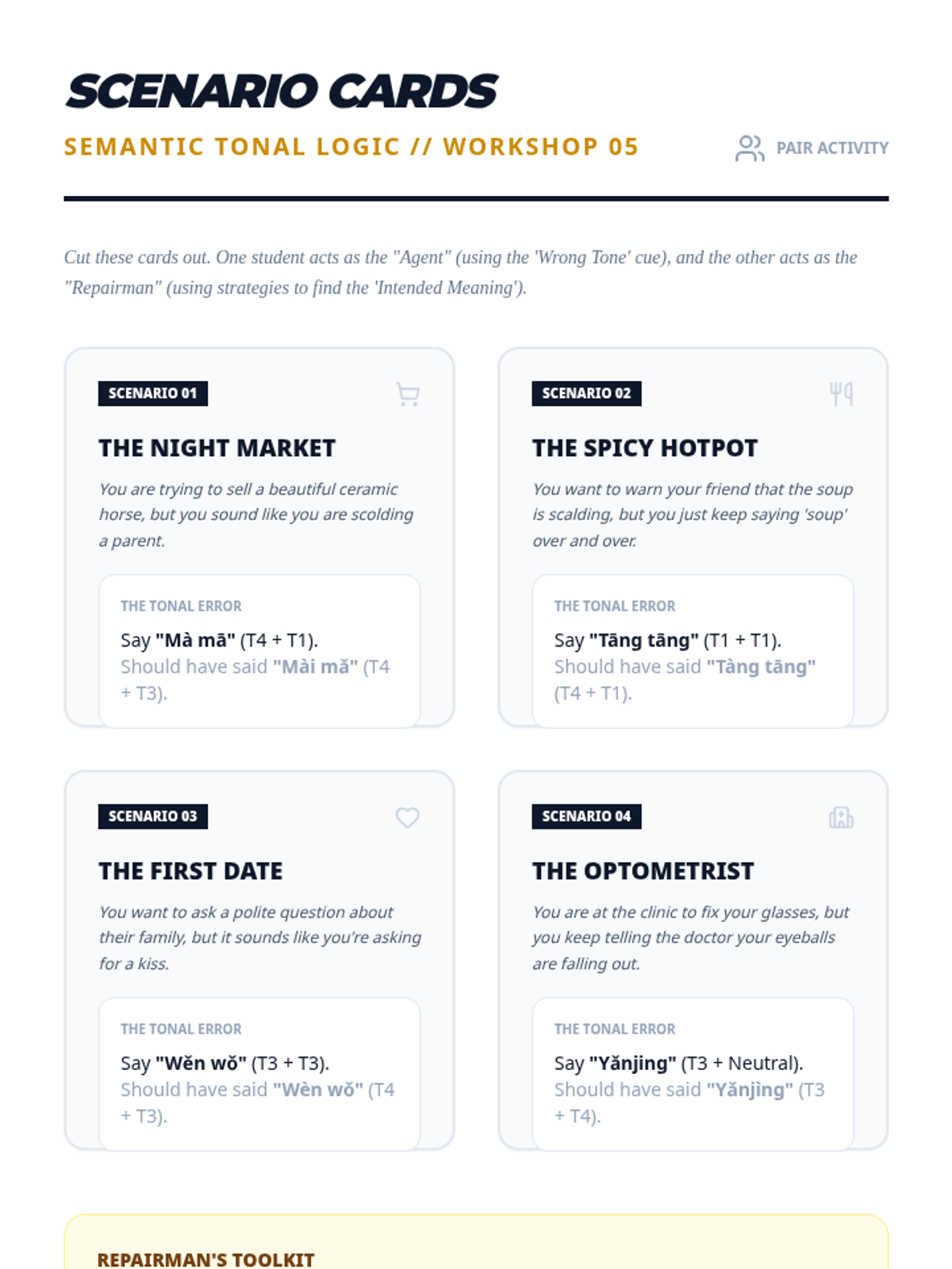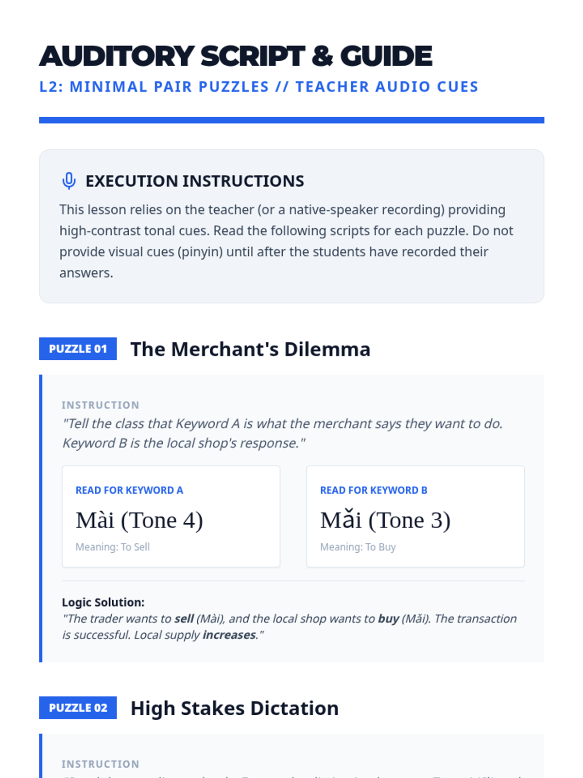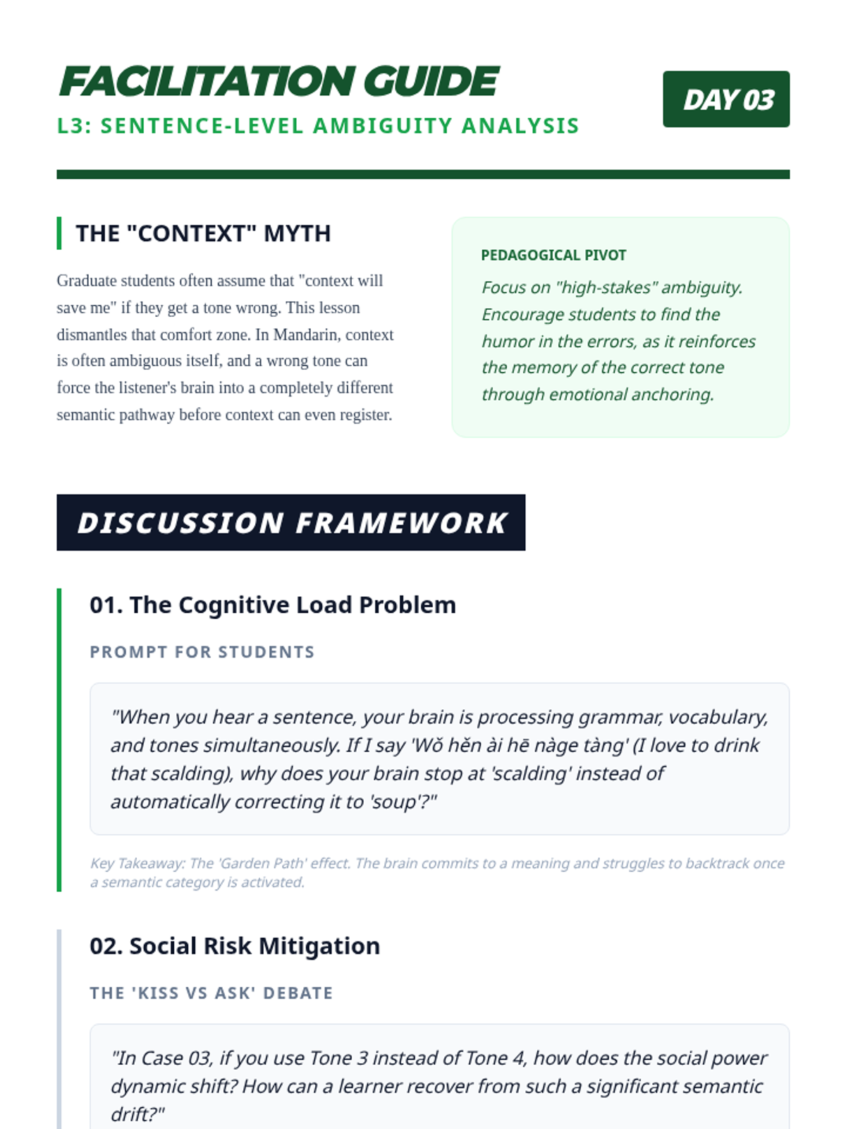 This sequence addresses the critical link between tones and meaning in Mandarin Chinese, focusing on minimal pairs where tone is the only distinguishing factor. Graduate students engage in analytical, gamified challenges to move from isolated auditory discrimination to complex semantic processing.