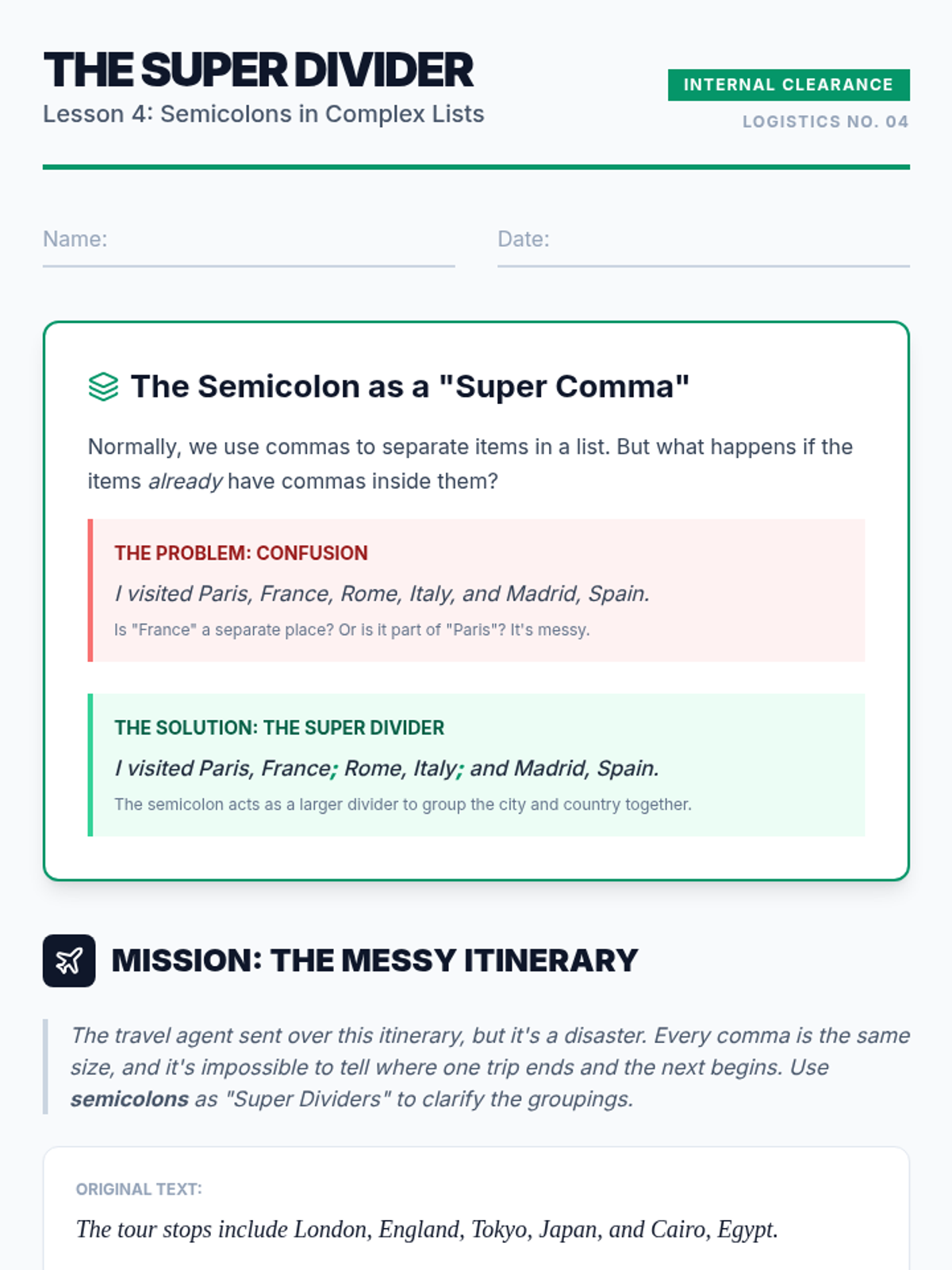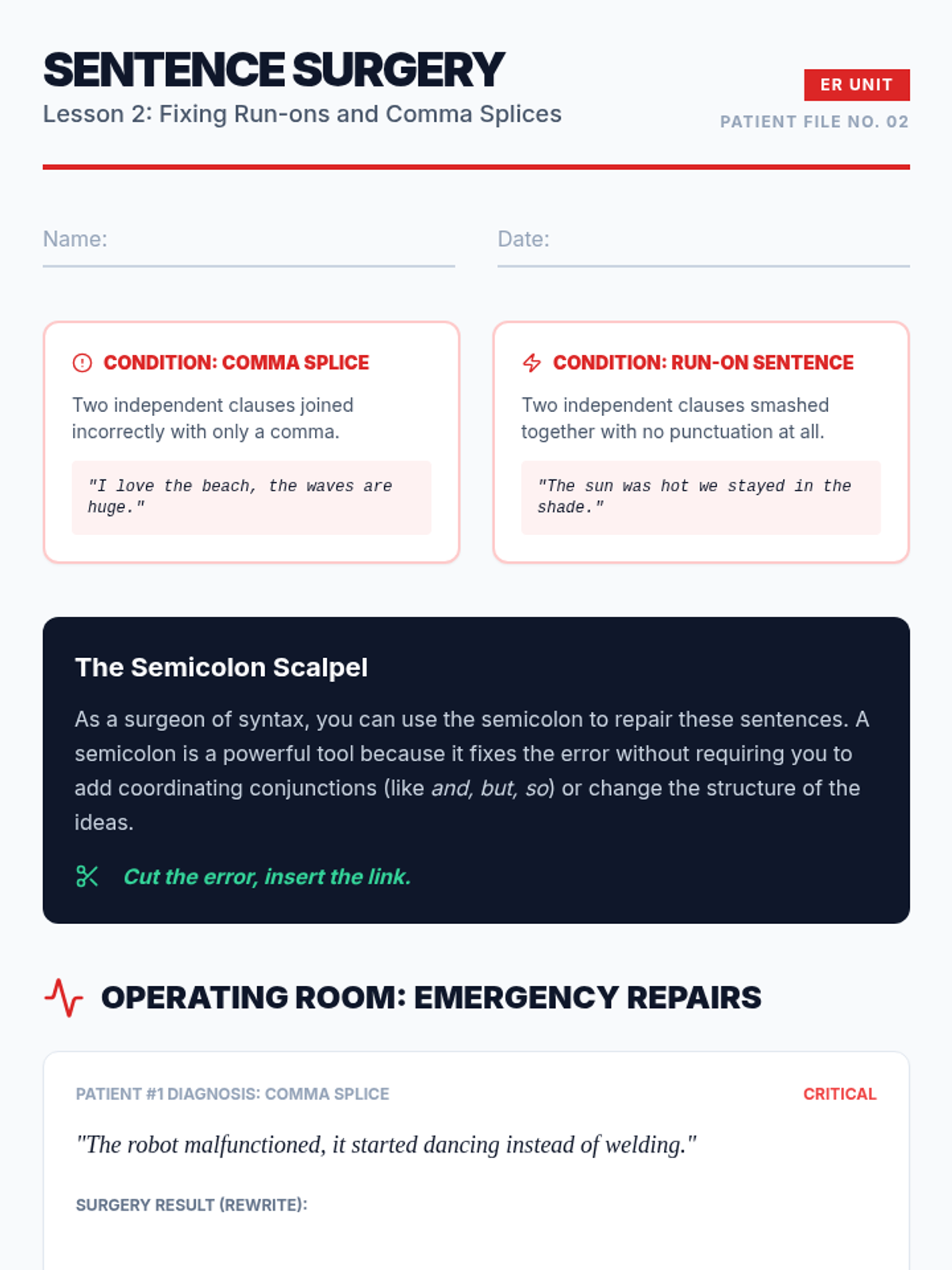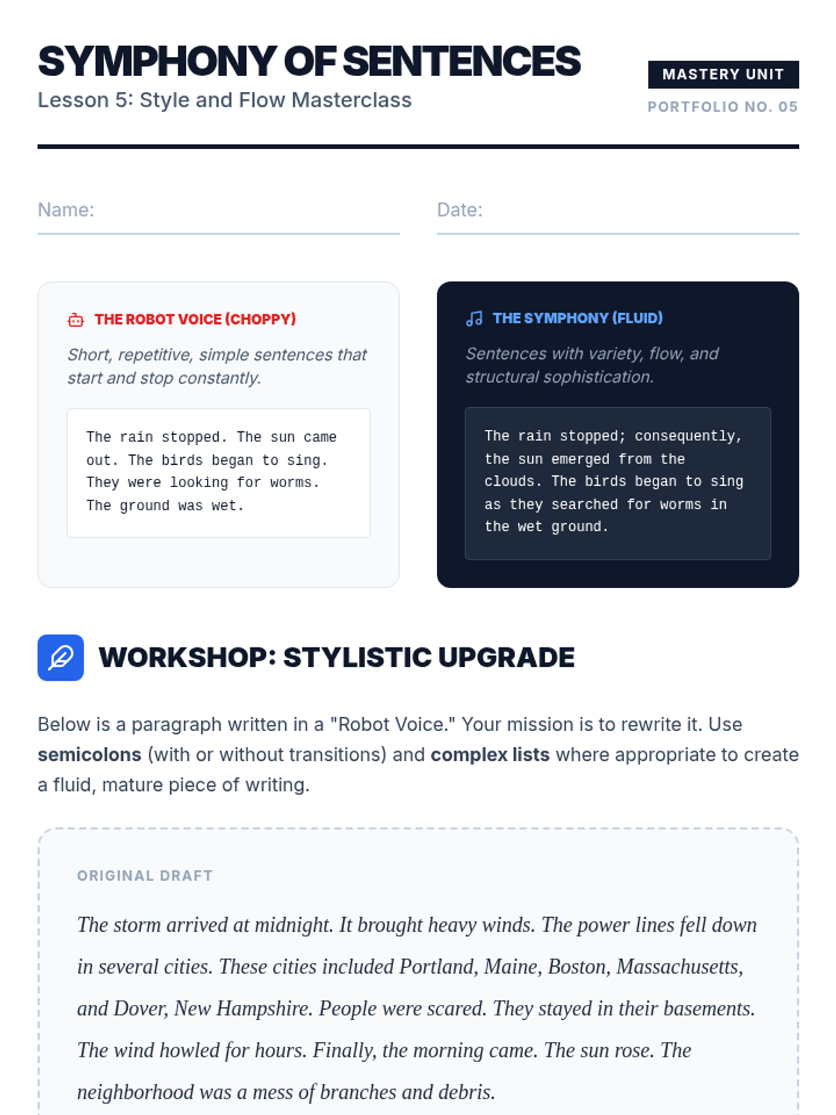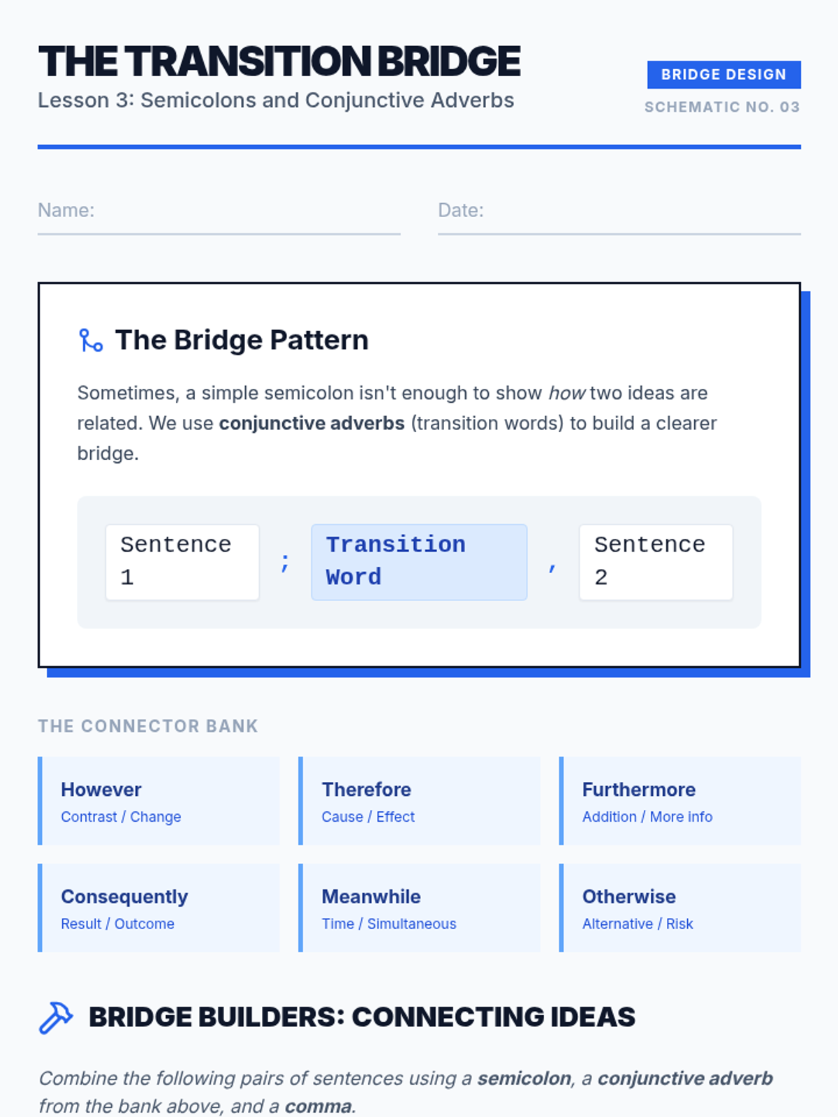 A comprehensive 8th-grade grammar sequence that takes students from the basics of independent clauses to sophisticated stylistic use of the semicolon. Through architectural and surgical metaphors, students learn to connect ideas, fix errors, and enhance the flow of their writing.