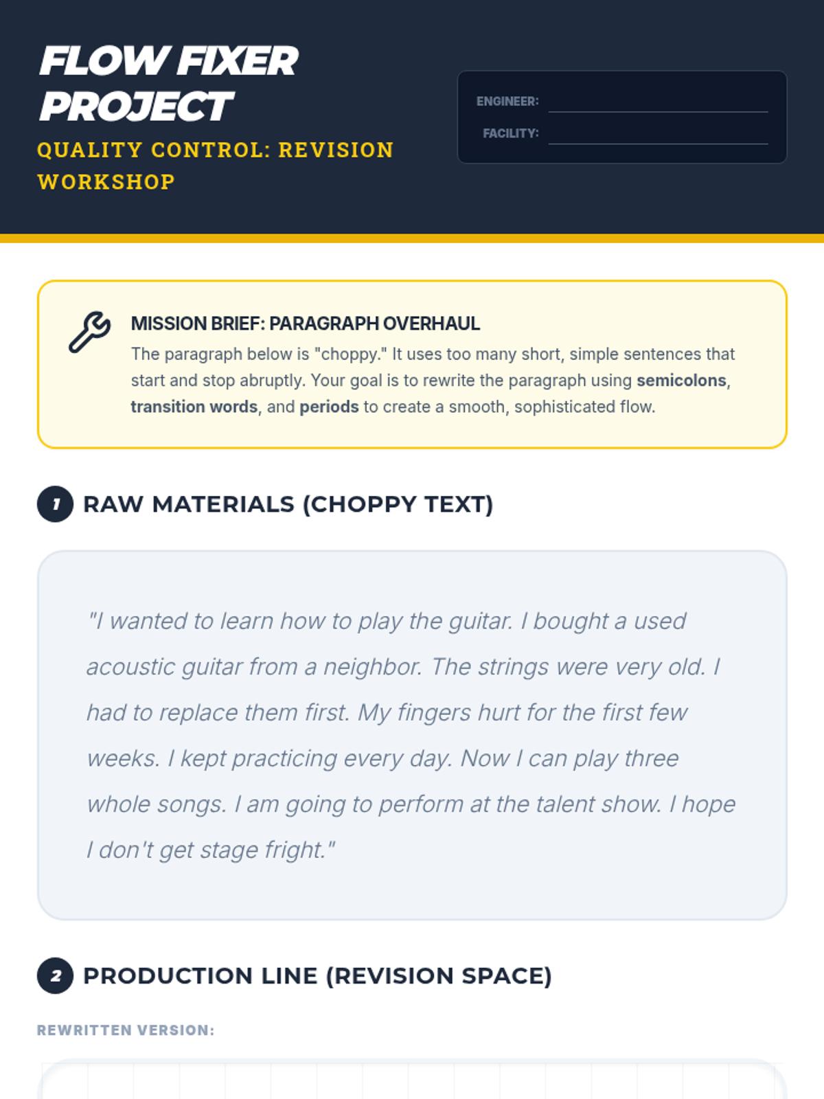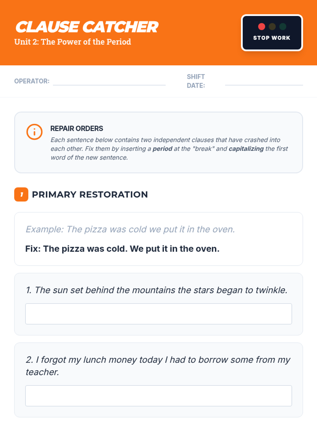 A comprehensive unit for 6th graders on identifying and fixing run-on sentences and comma splices using periods and semicolons. Students progress from diagnosing errors to mastering sophisticated sentence structures with conjunctive adverbs.
