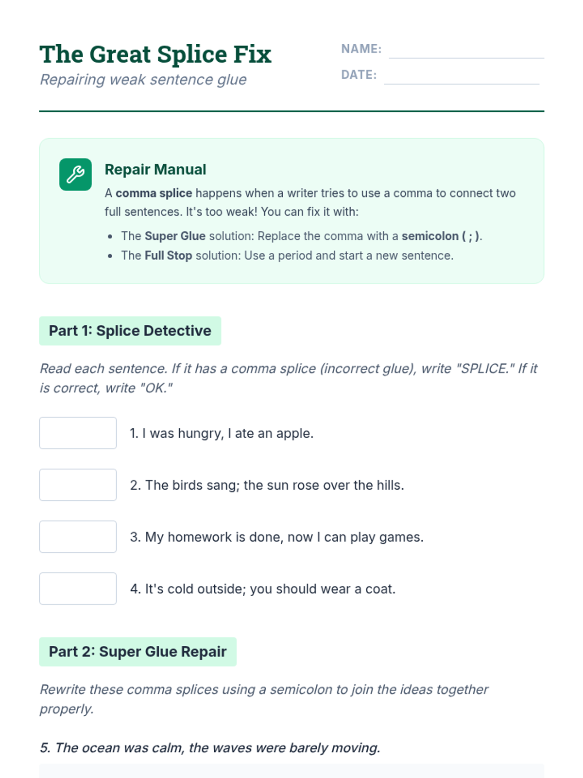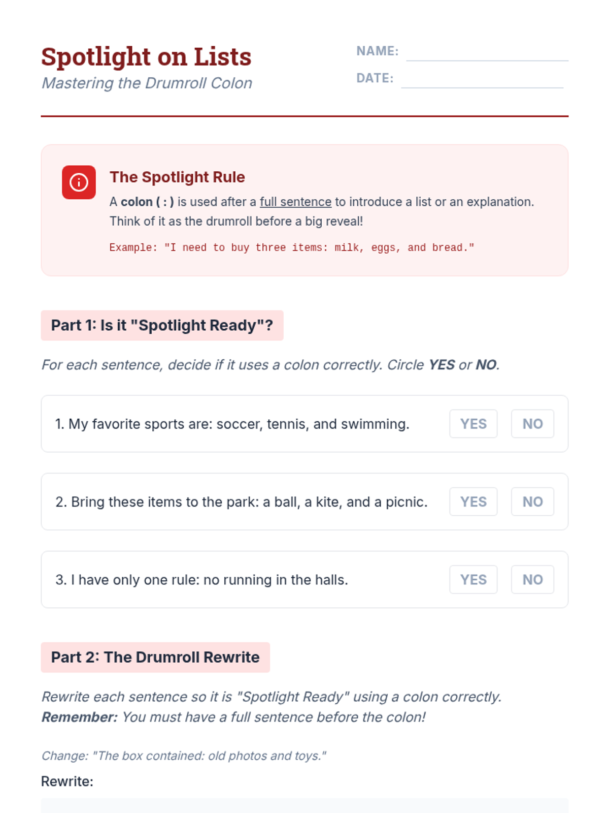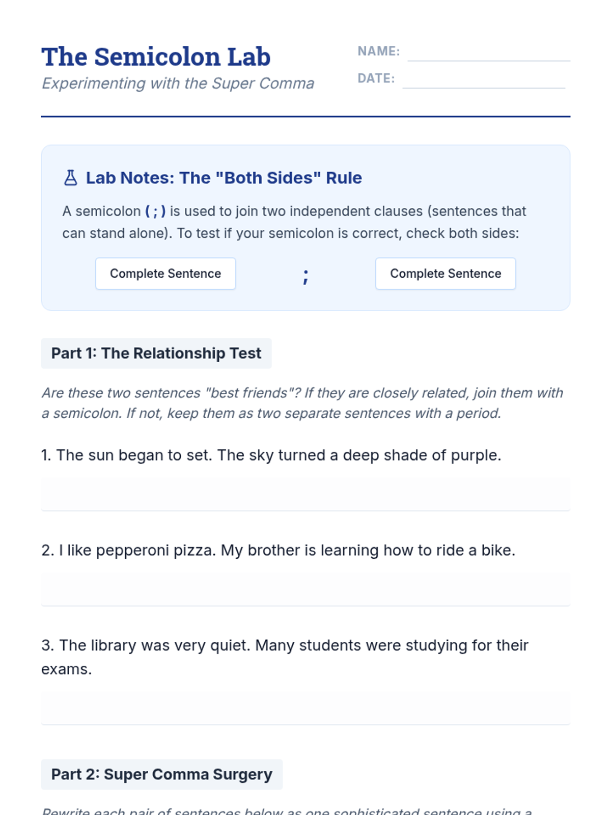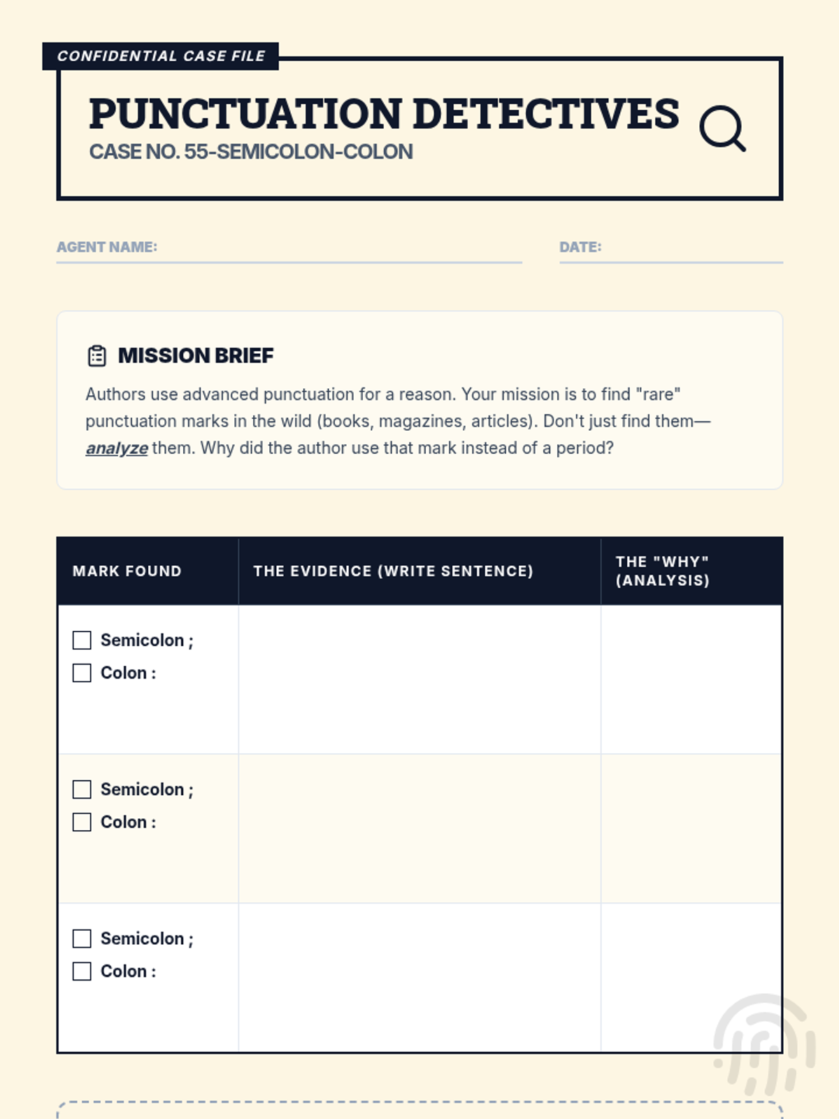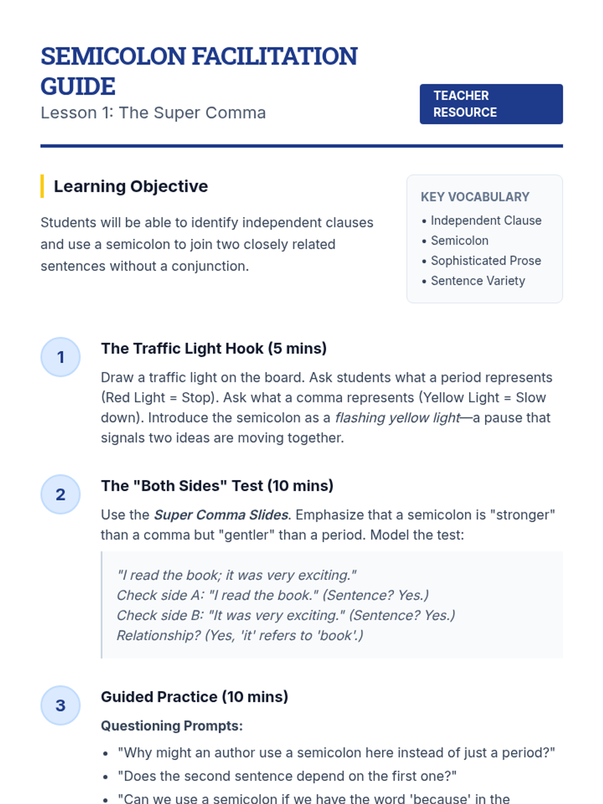 This sequence introduces 5th graders to semicolons and colons to improve sentence variety. Students learn to use semicolons to link independent clauses and colons to introduce lists, moving from identification to sophisticated revision.