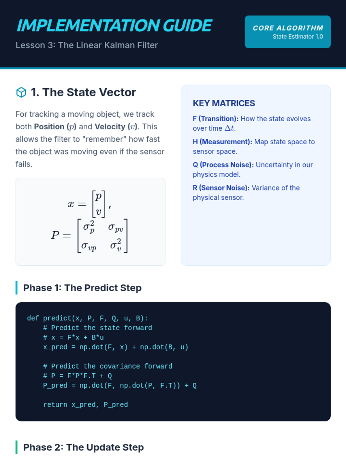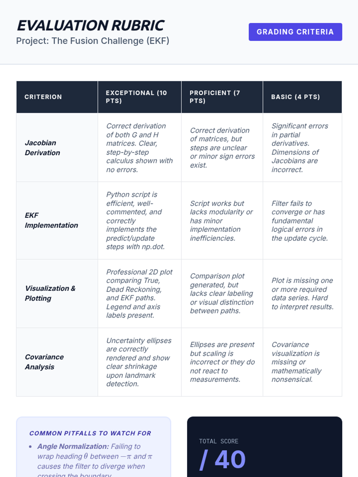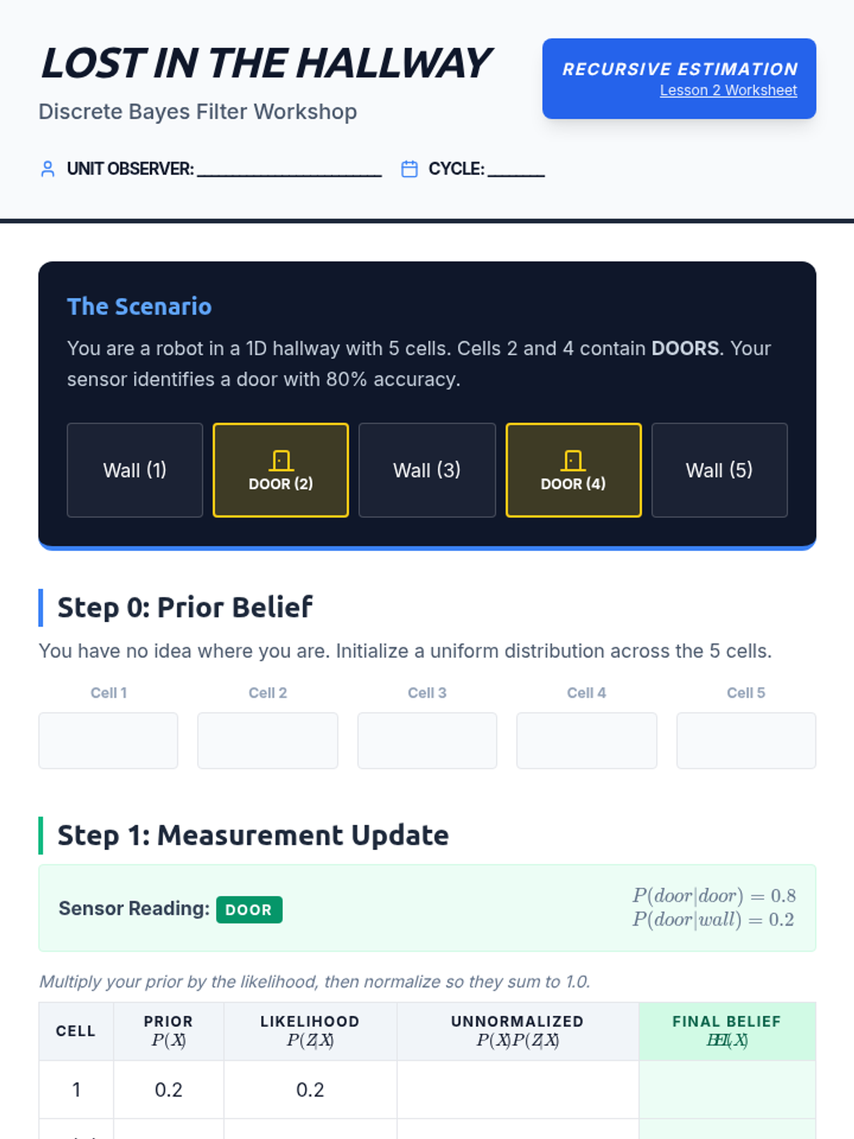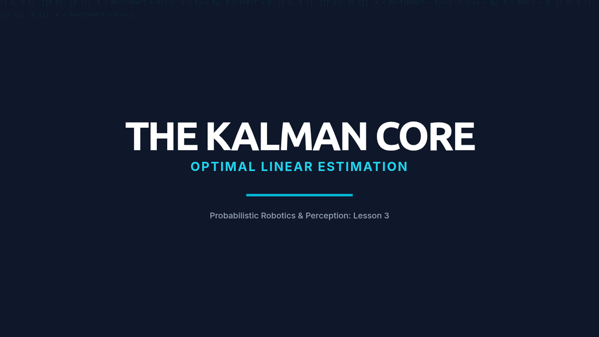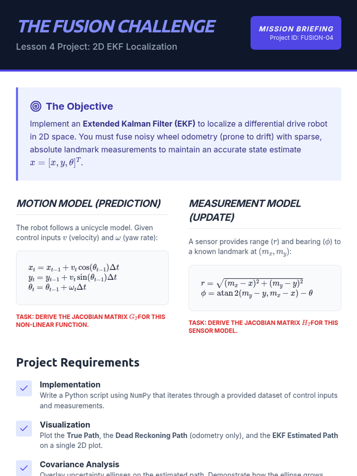 A comprehensive sequence for undergraduate engineering students on the perception layer of robotics. It covers sensor noise modeling, Bayesian filters, Kalman filters (KF and EKF), and the fundamentals of SLAM, focusing on how robots interpret noisy real-world data to build a reliable world model.