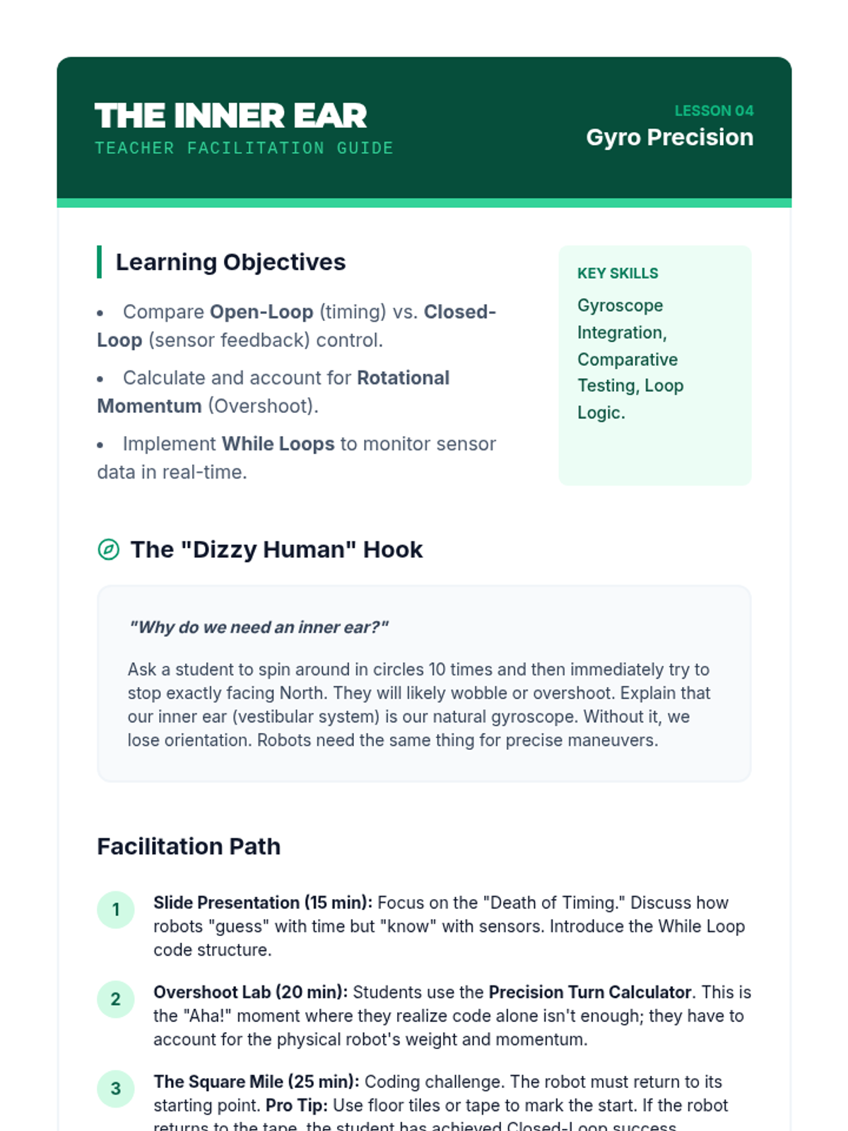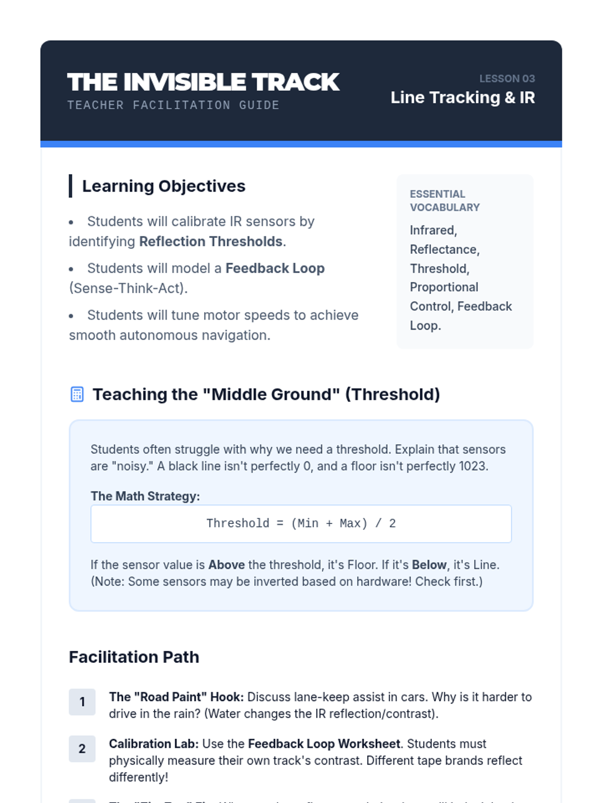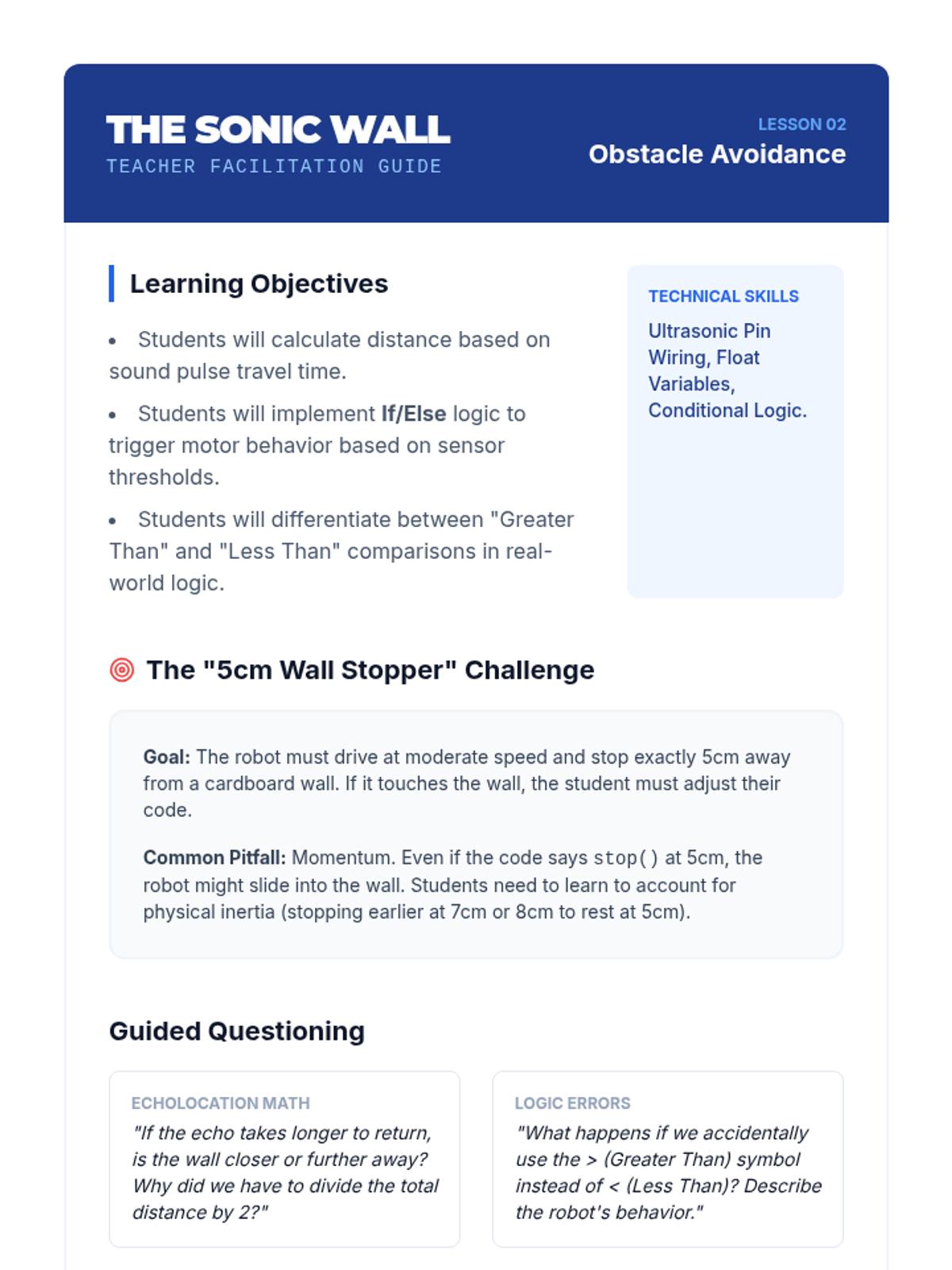 A comprehensive 8th-grade robotics sequence focused on sensor integration. Students progress from basic analog/digital signal understanding to complex sensor fusion, enabling robots to perceive and navigate their environment autonomously.