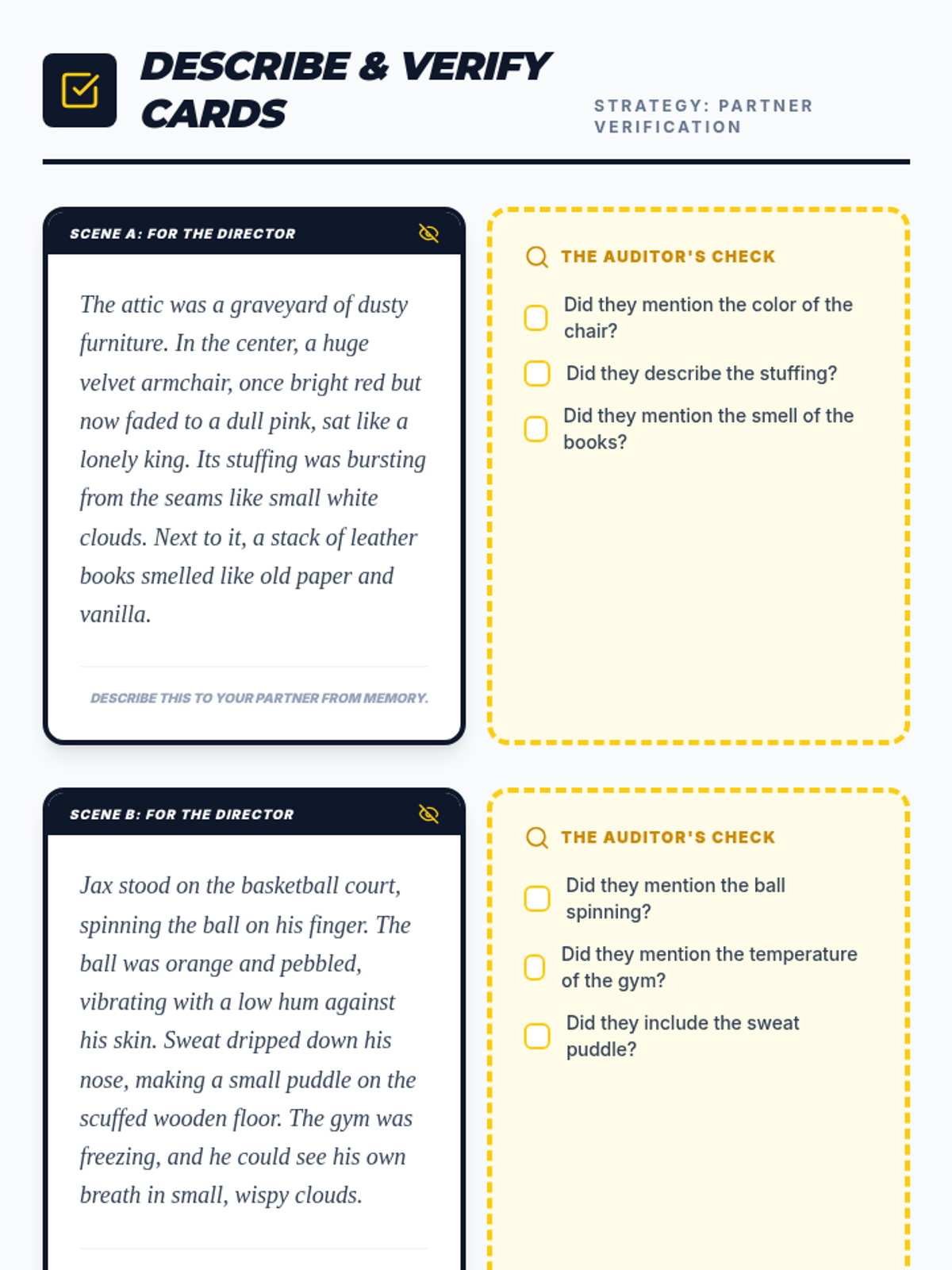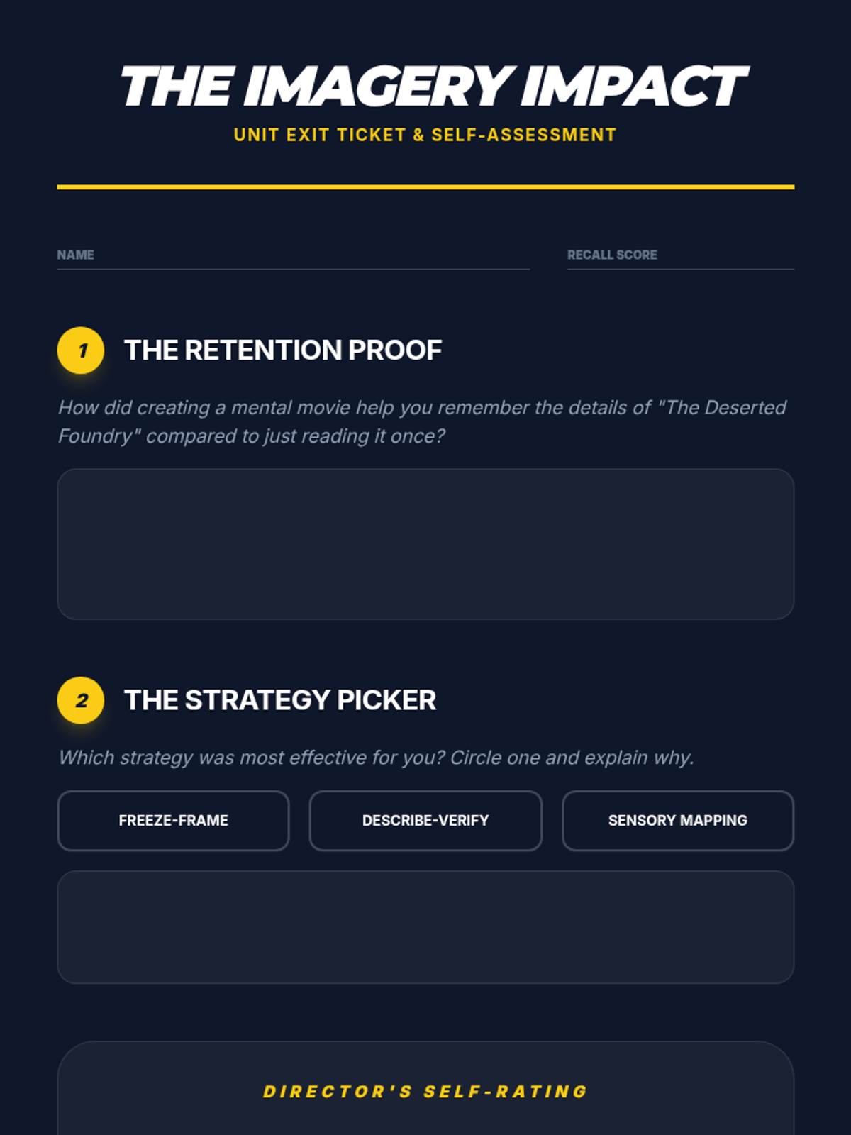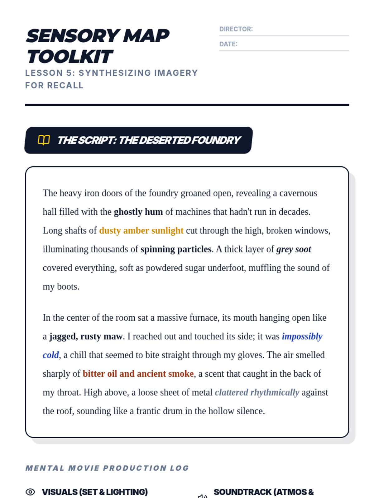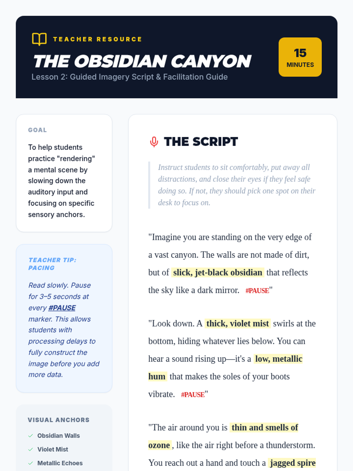This sequence teaches 11th-grade students to use visualization as a comprehension strategy. By moving from identifying sensory words to constructing complex mental scenes and verbalizing them, students build a 'mental movie' that improves recall and engagement with narrative texts.
