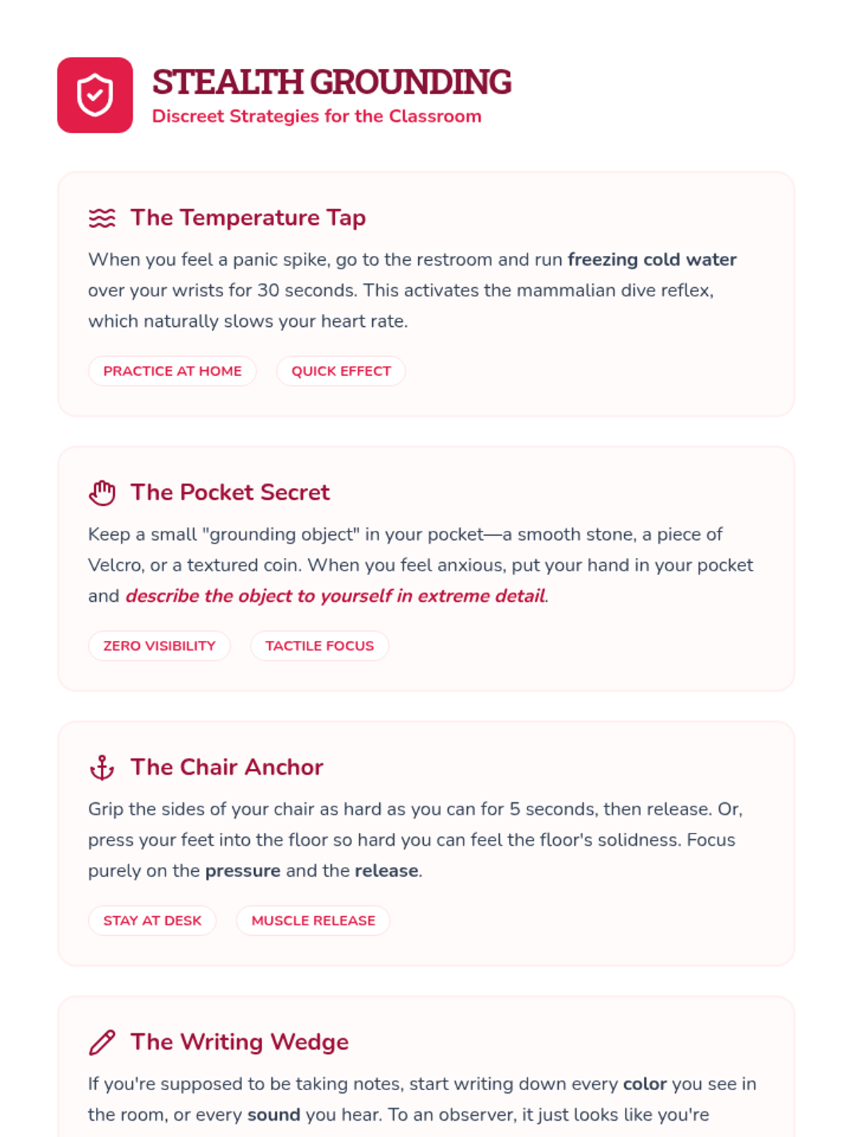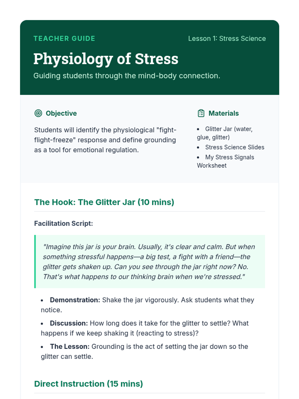A 5-lesson sequence for 8th-grade students exploring the physiological basis of stress and practical sensory-based grounding techniques to manage anxiety and regain emotional control.