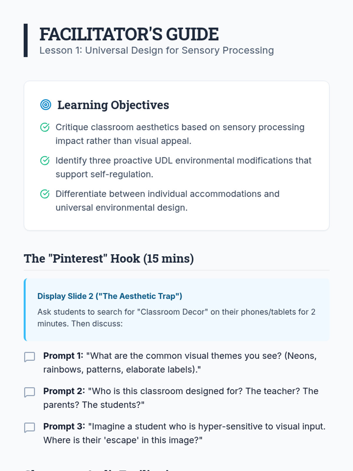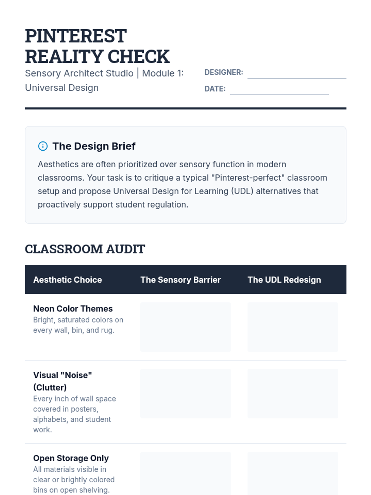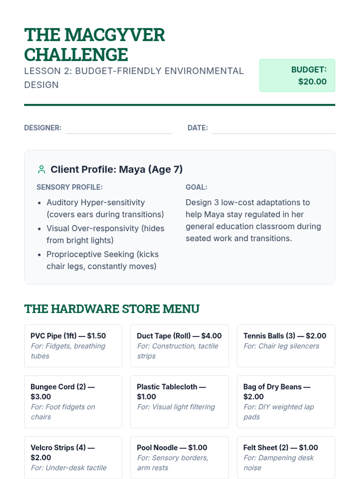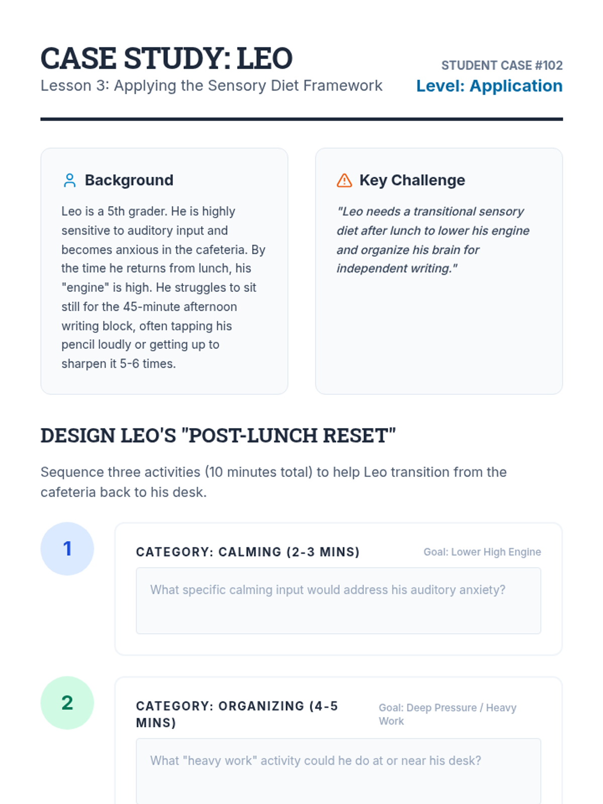 This application-focused sequence challenges undergraduate students to translate sensory profiles into concrete environmental modifications and regulation strategies. Using a project-based approach, learners design sensory-friendly classrooms and develop personalized 'sensory diets' or regulation plans to bridge assessment data with daily classroom practice.