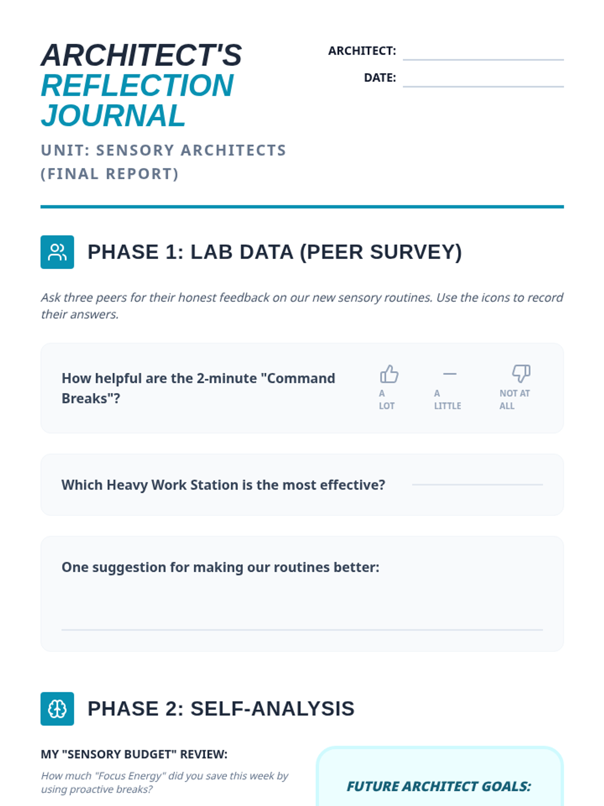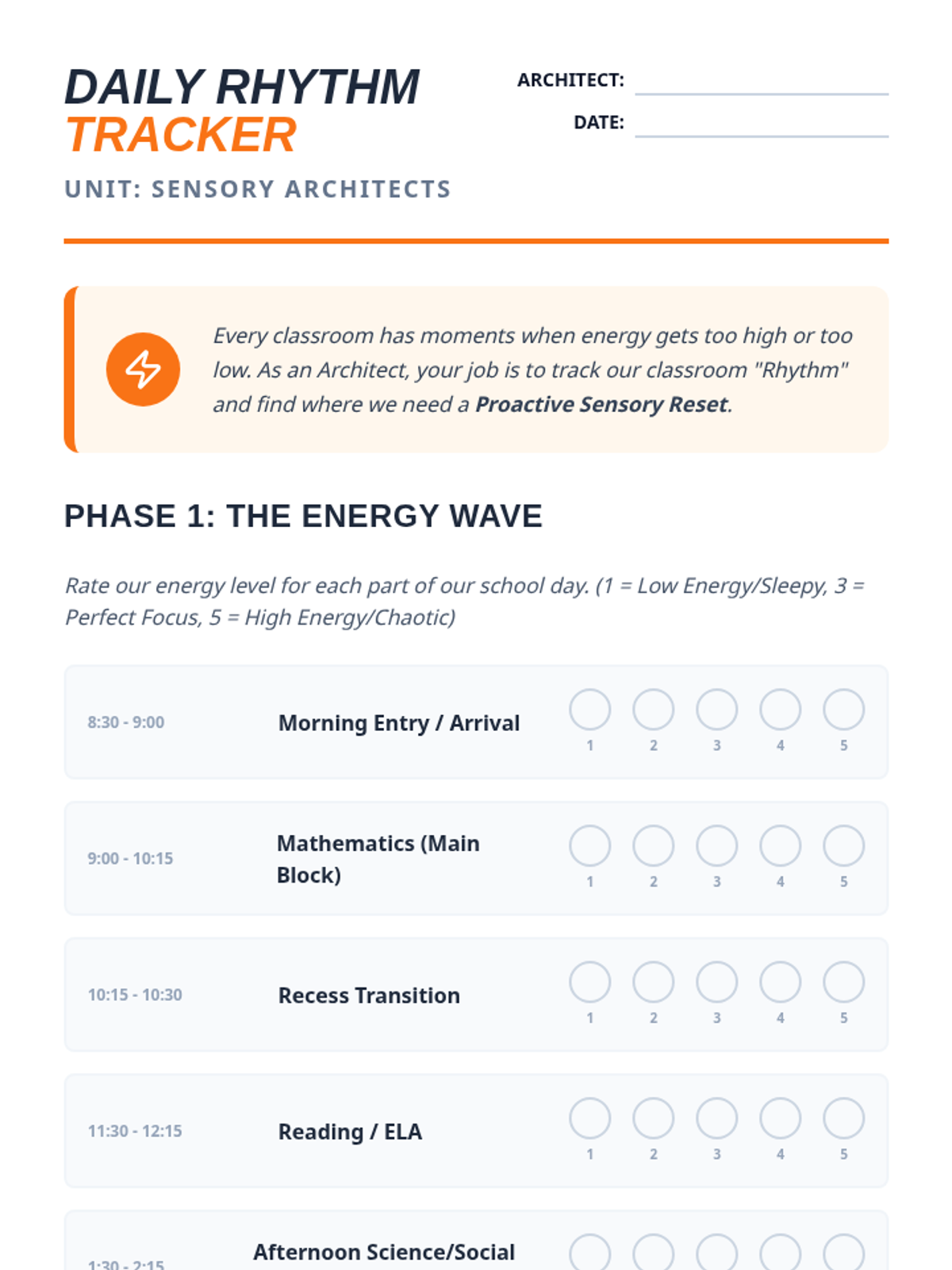 A 5th-grade sequence where students act as 'Sensory Architects' to analyze, design, and implement proactive sensory routines in their classroom. Students focus on environmental audits, schedule analysis, and peer-led interventions to support collective focus and regulation.