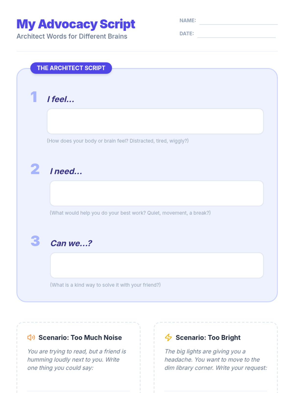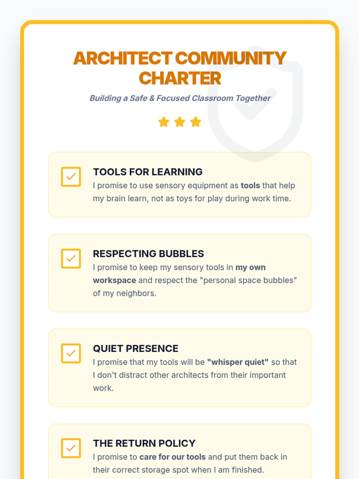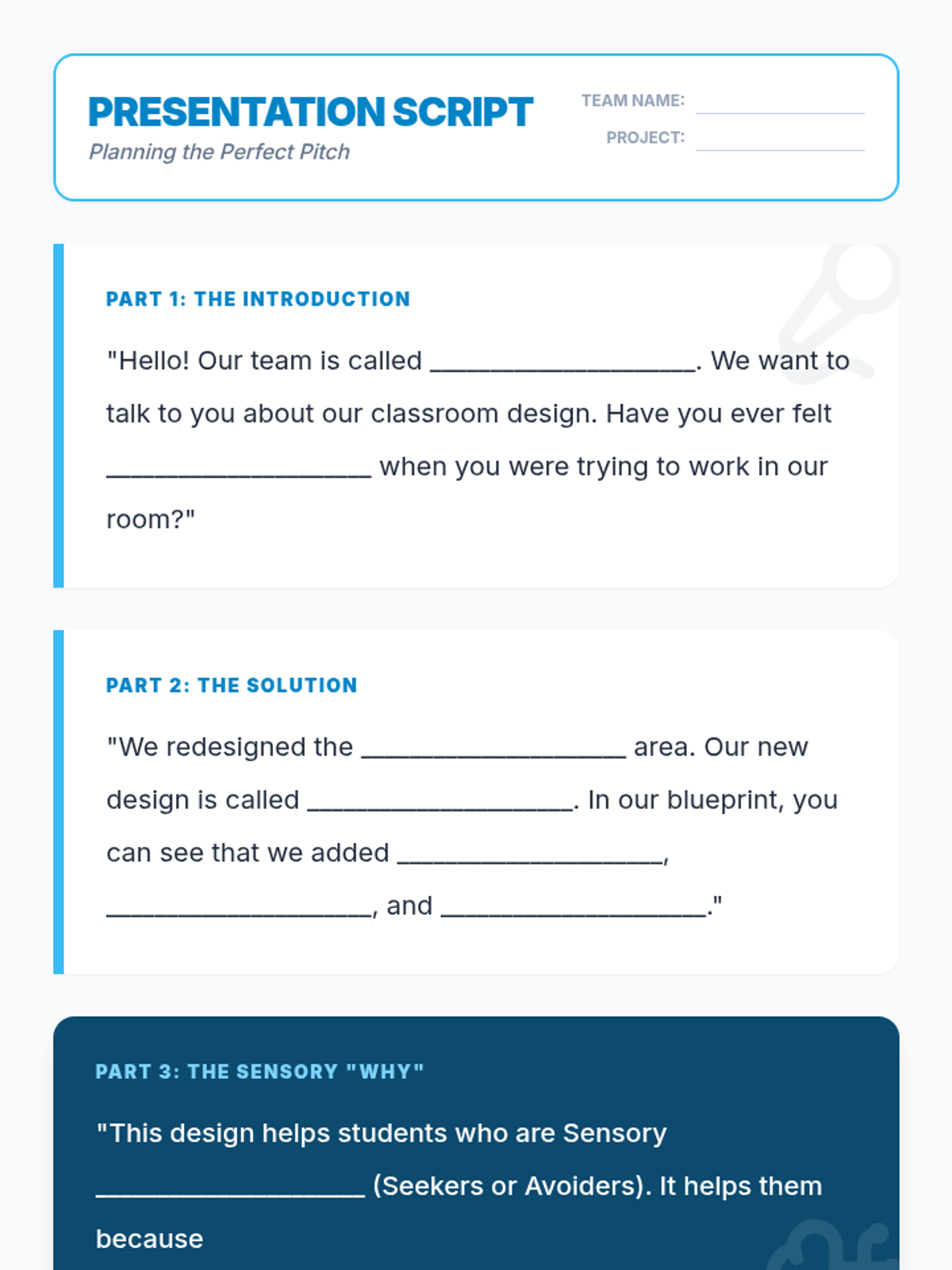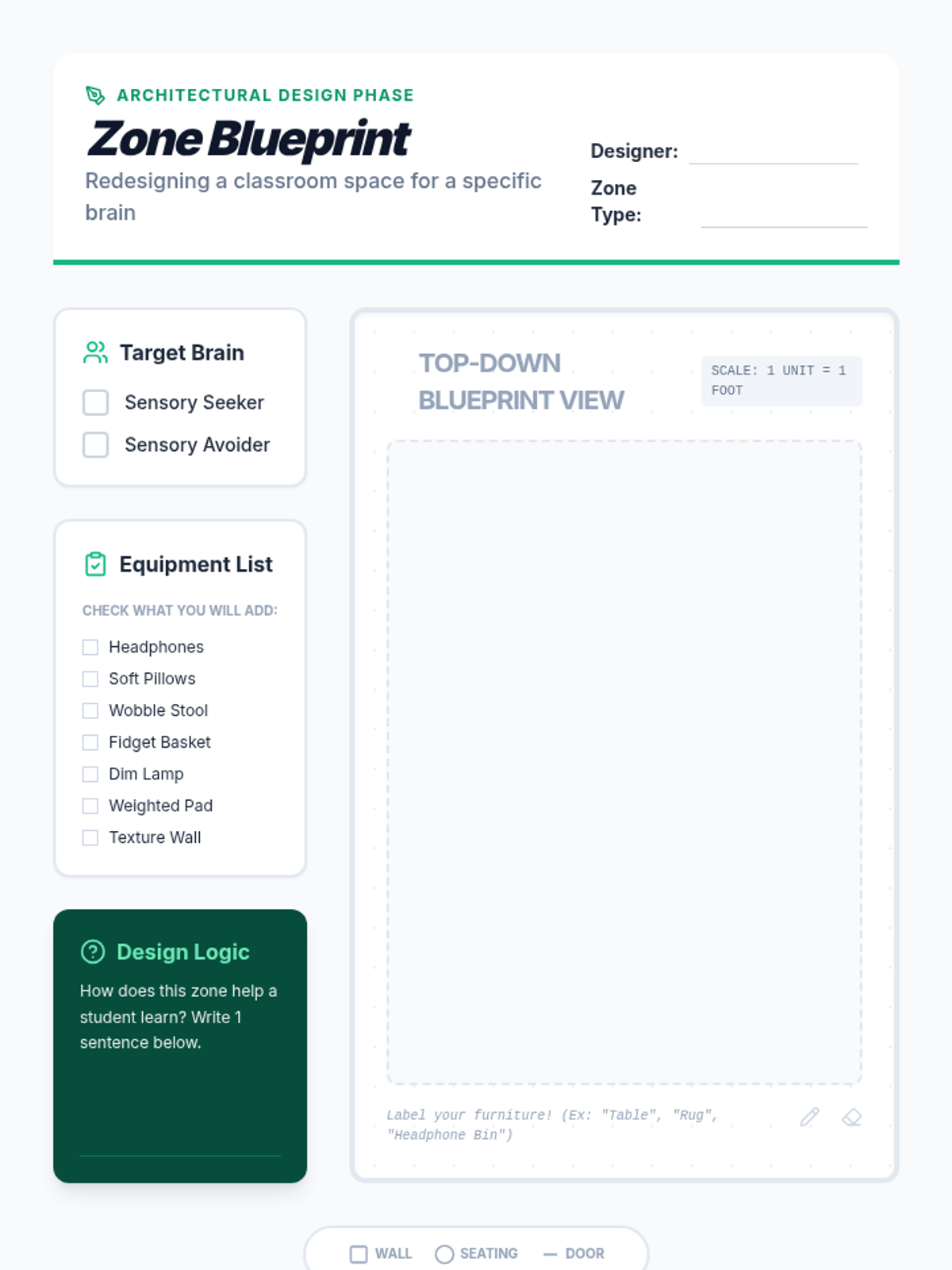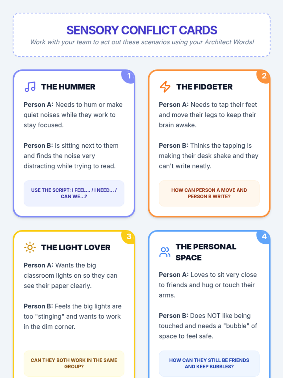 This project-based sequence teaches 2nd-grade students to identify sensory preferences, resolve sensory-based conflicts, and collaboratively design a more inclusive classroom environment. Through the lens of 'Sensory Architects,' students audit their space and advocate for the diverse needs of their community.
