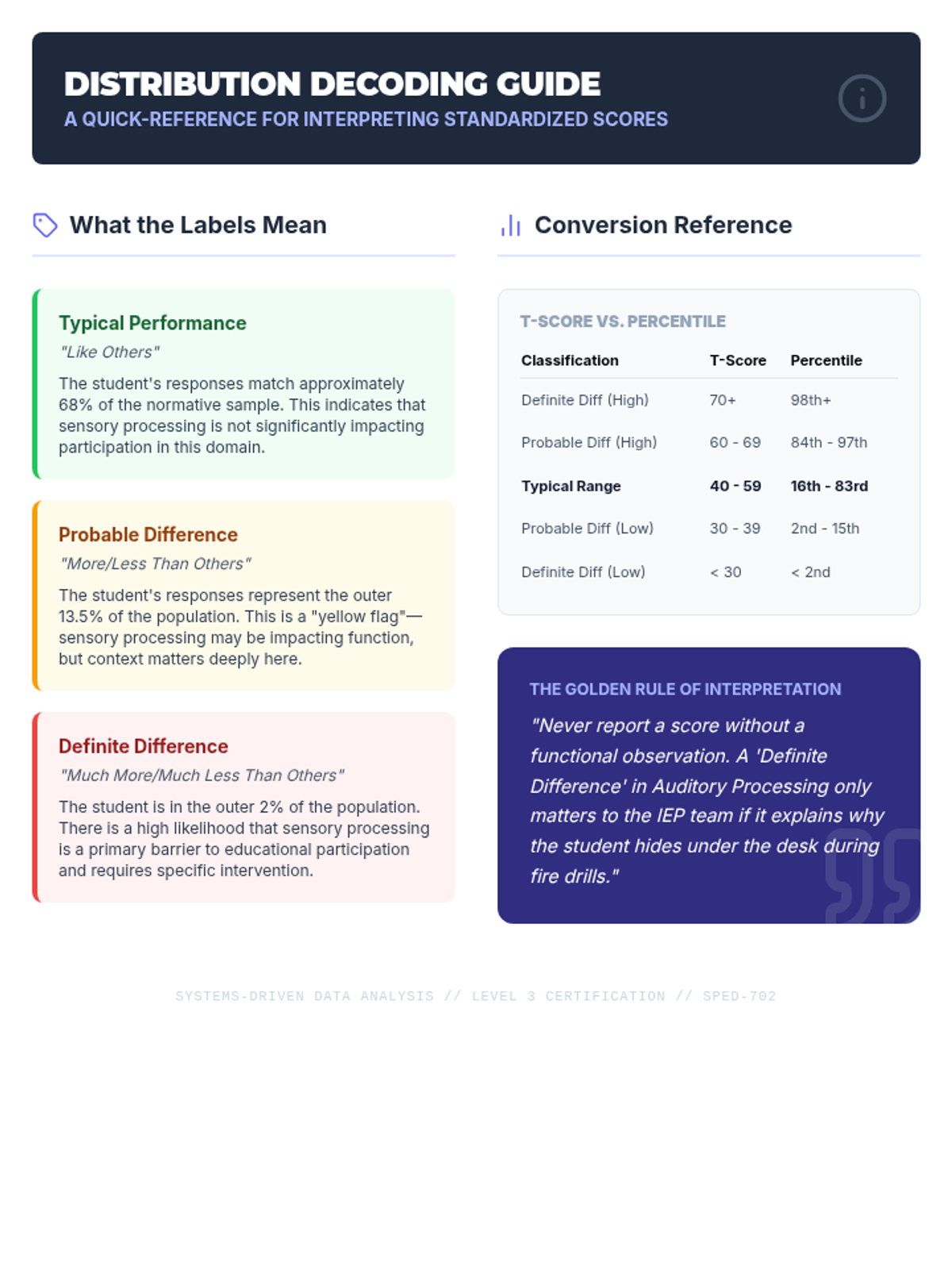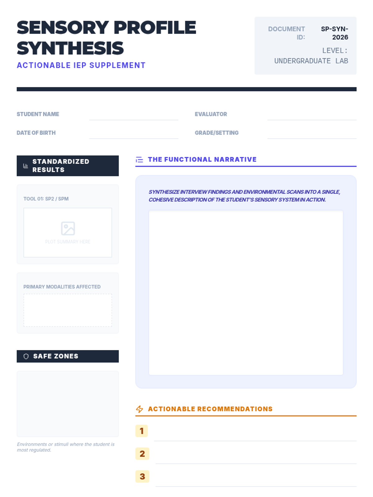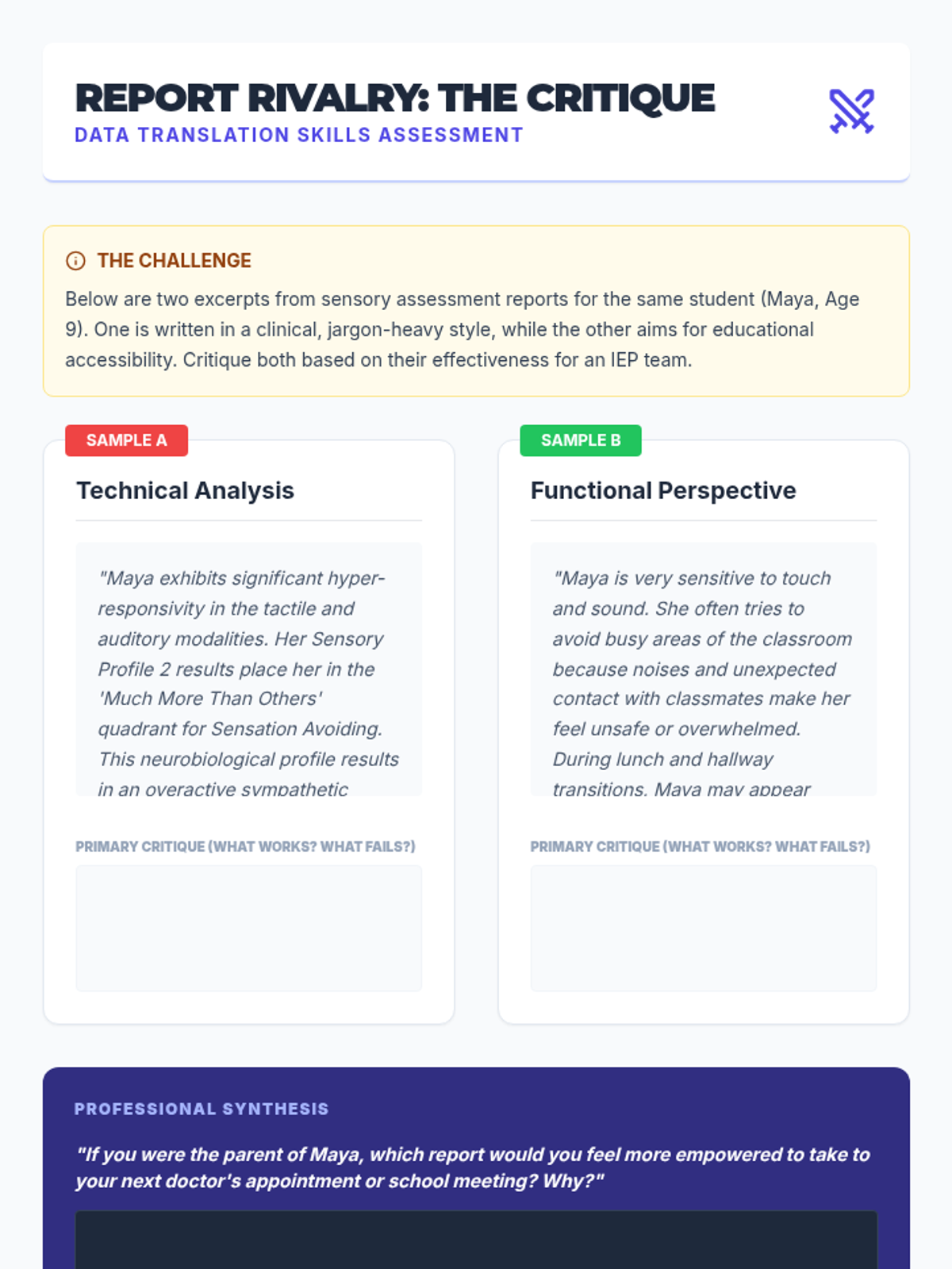 A professional workshop-style sequence for undergraduate students focusing on the selection, administration, scoring, and interpretation of sensory assessment tools in special education. Students progress from evaluating standardized instruments to synthesizing data into actionable sensory profiles.