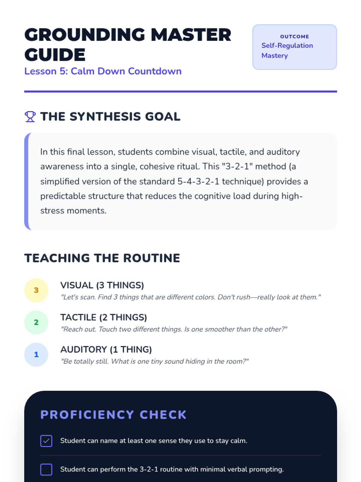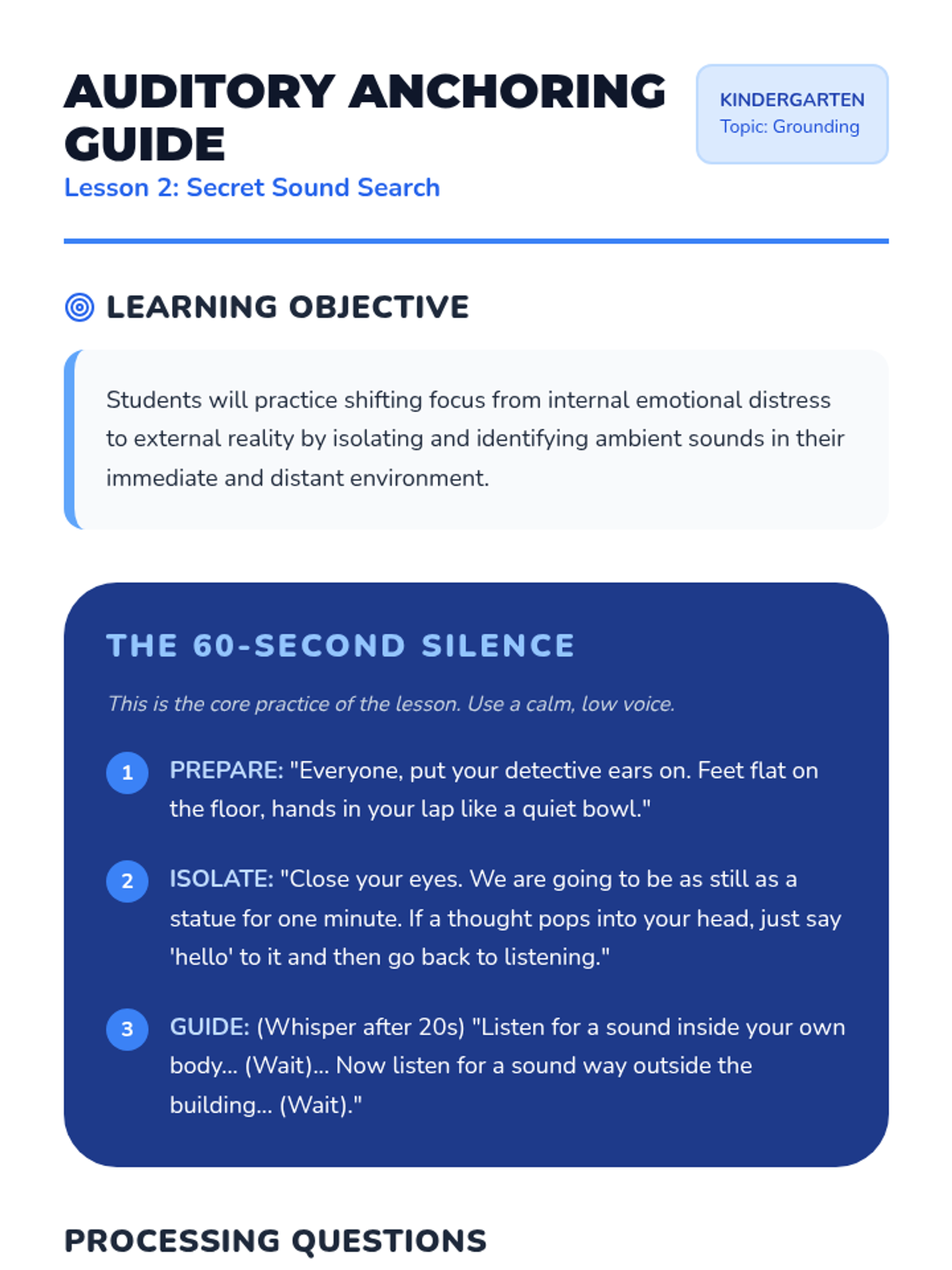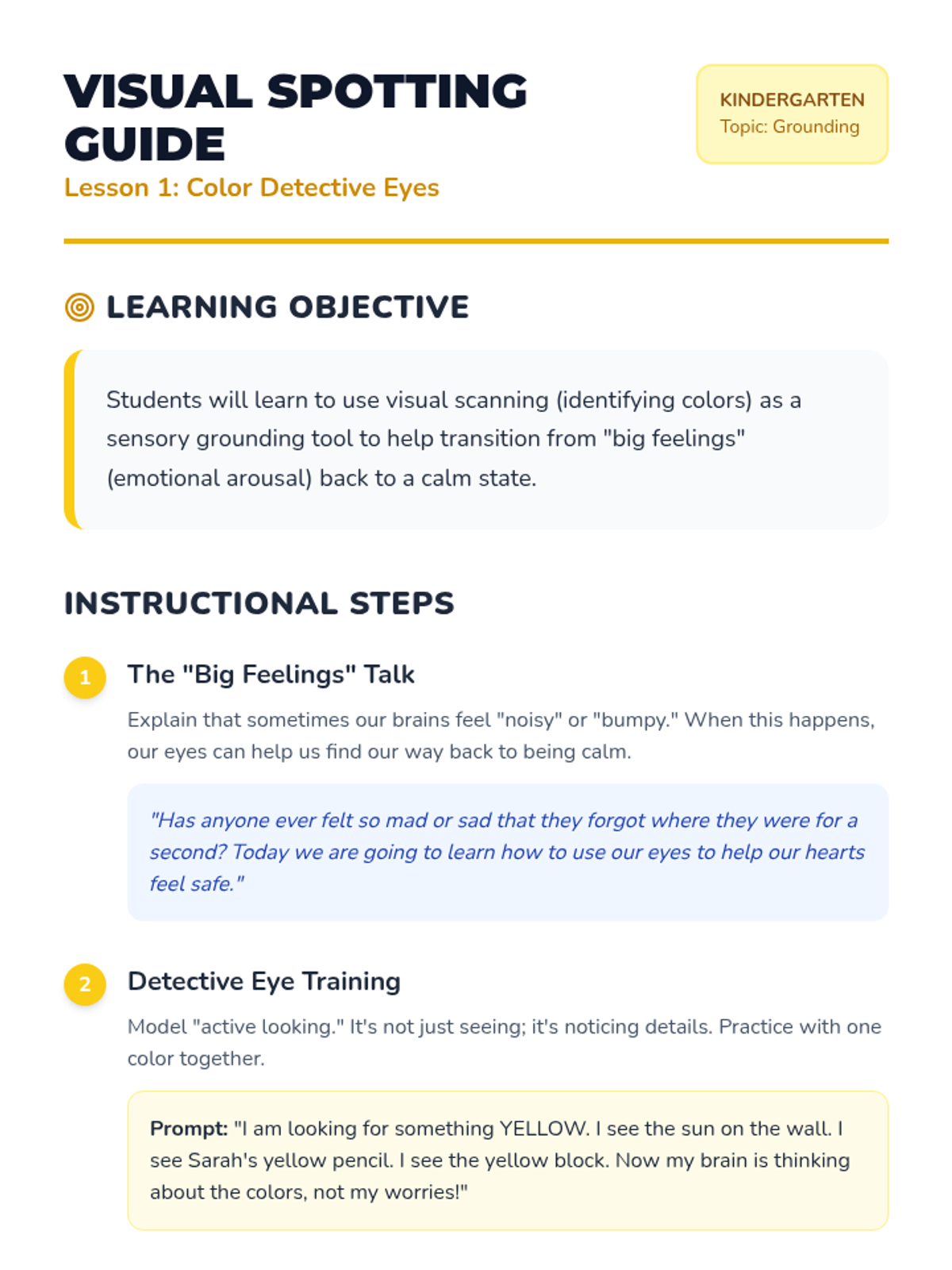 This kindergarten sequence teaches students how to use their five senses as grounding tools for emotional regulation. Students progress from isolating individual senses to mastering a simplified '5-4-3-2-1' technique (adapted as 3-2-1 for age-appropriateness) to stay calm and present.