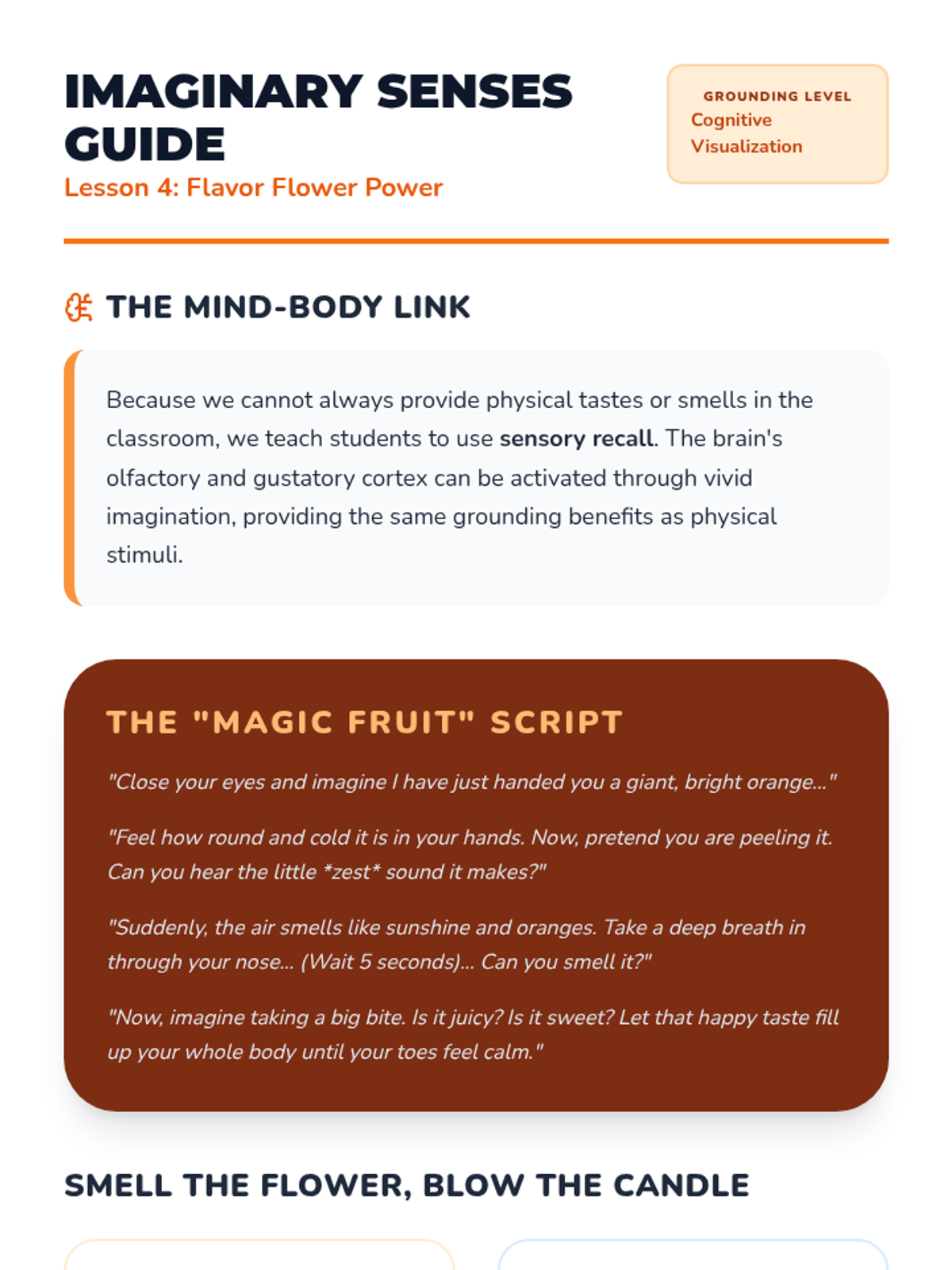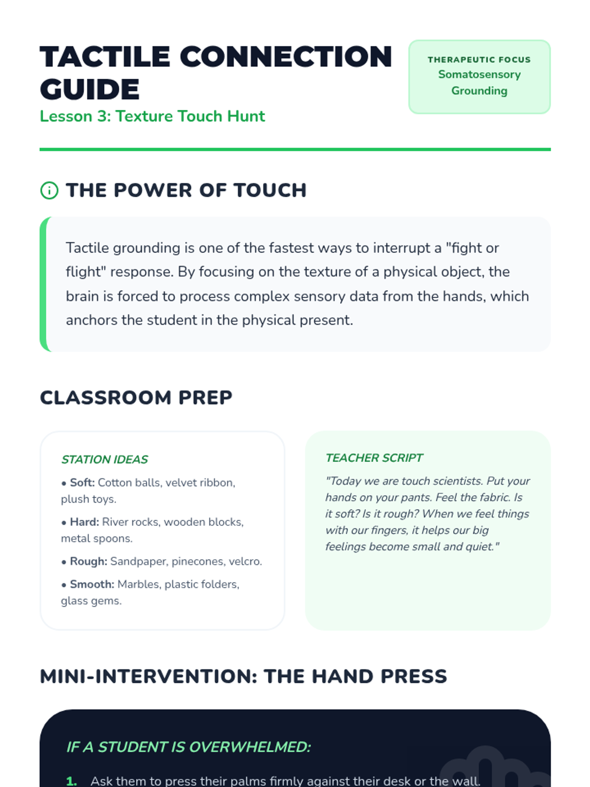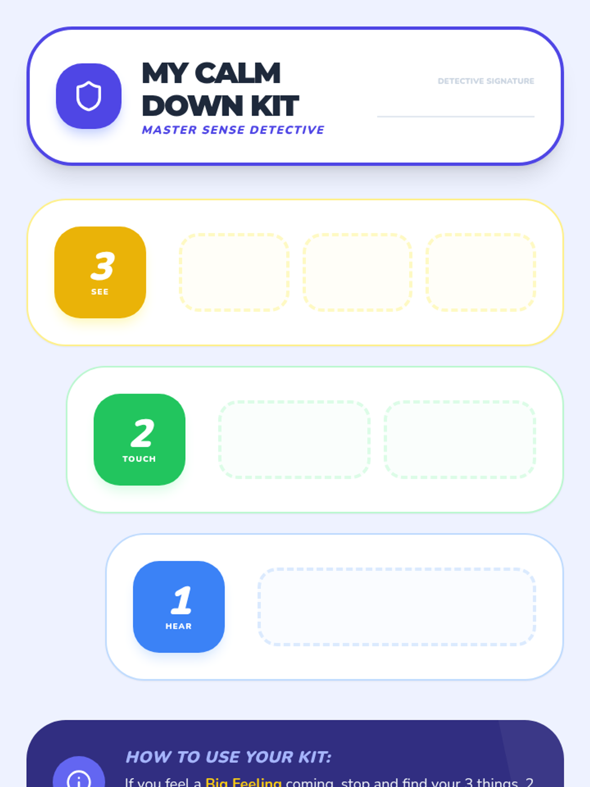 This kindergarten sequence teaches students how to use their five senses as grounding tools for emotional regulation. Students progress from isolating individual senses to mastering a simplified '5-4-3-2-1' technique (adapted as 3-2-1 for age-appropriateness) to stay calm and present.