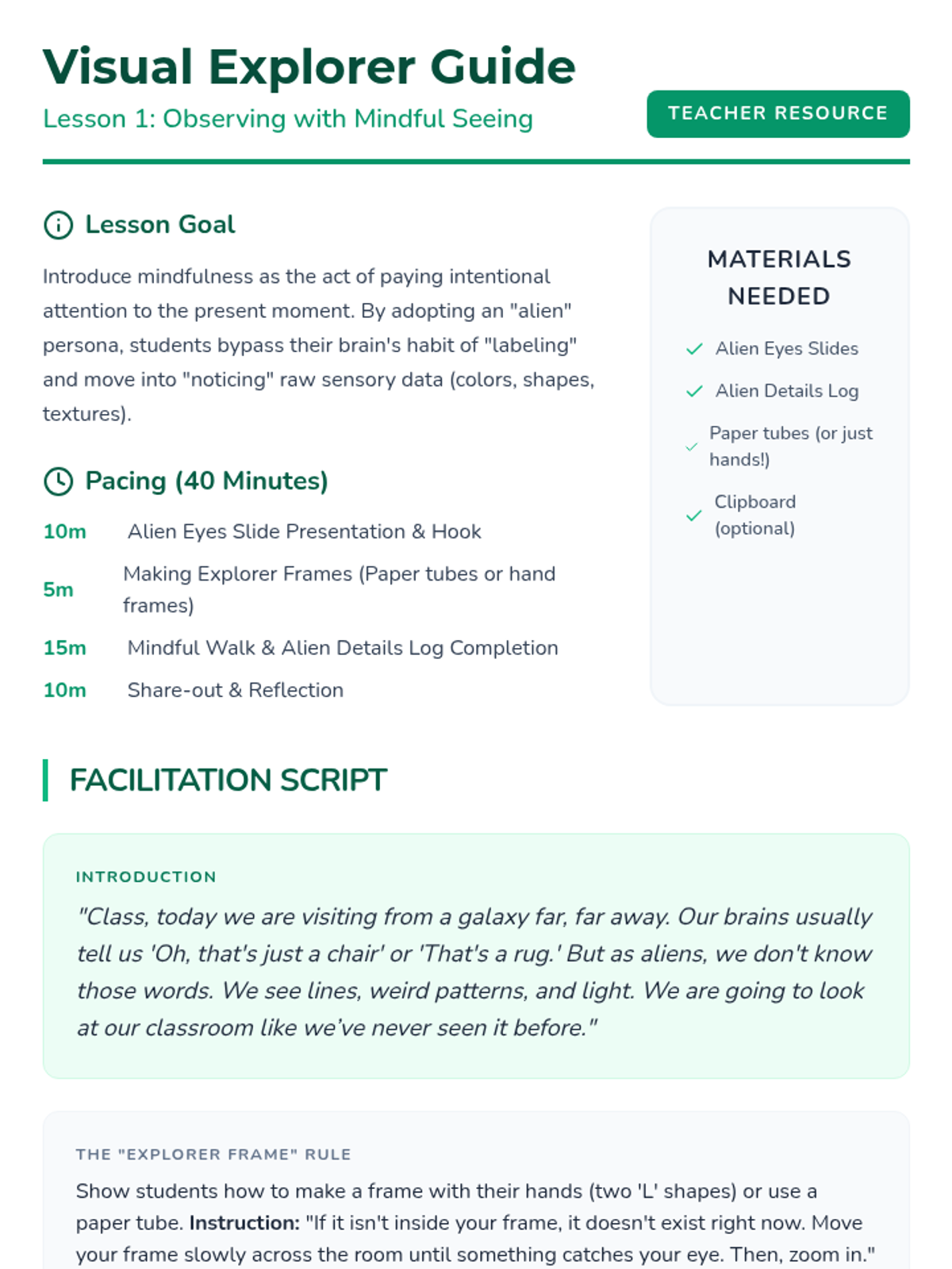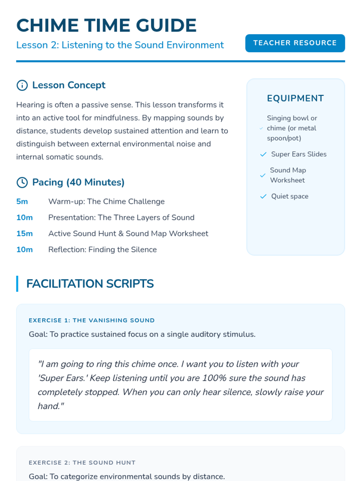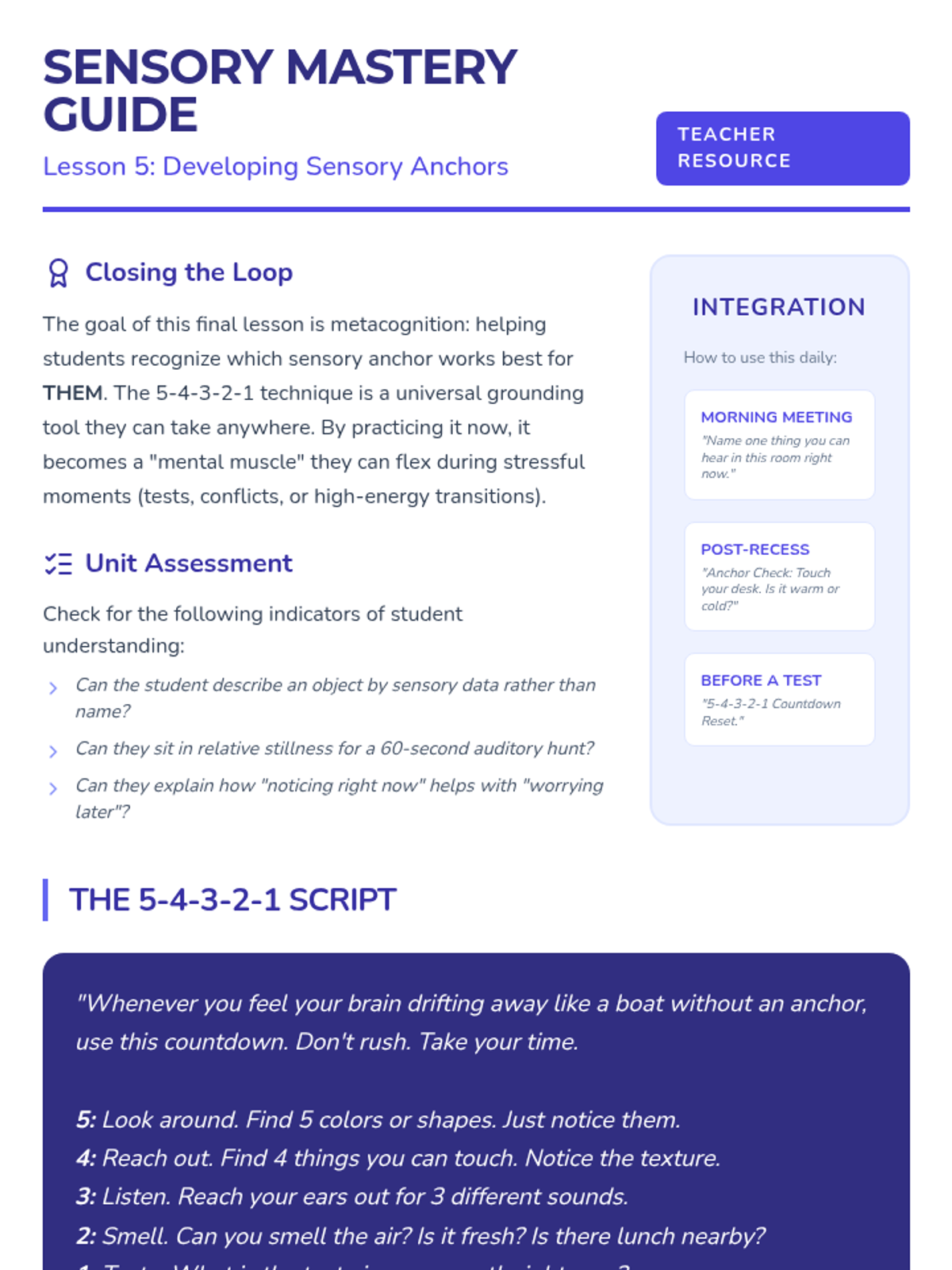 This sequence uses an inquiry-based approach to teach mindfulness to 2nd graders through sensory engagement. Students learn to anchor their attention to external stimuli using the five senses to stay 'present' in the moment and manage wandering thoughts.