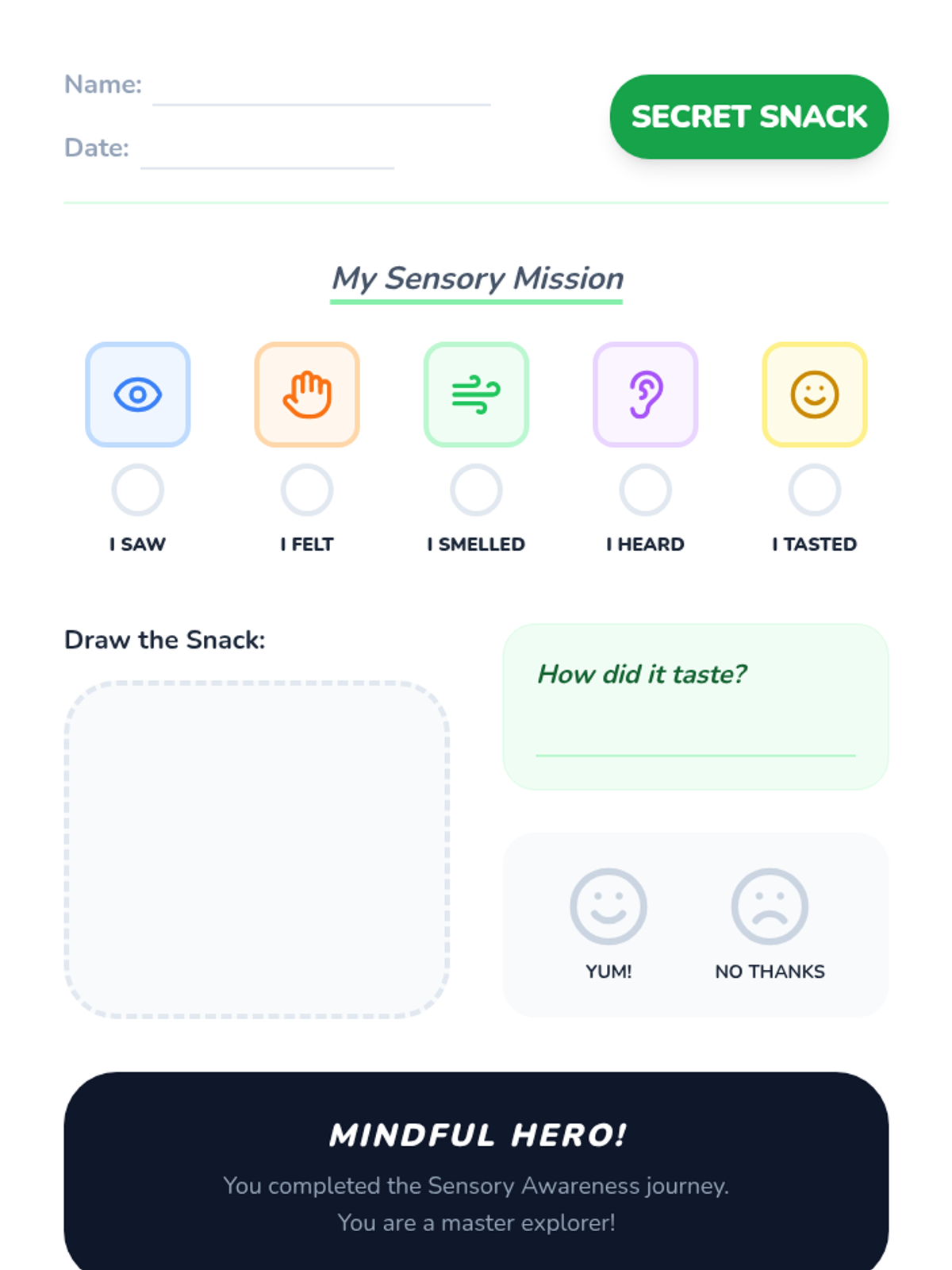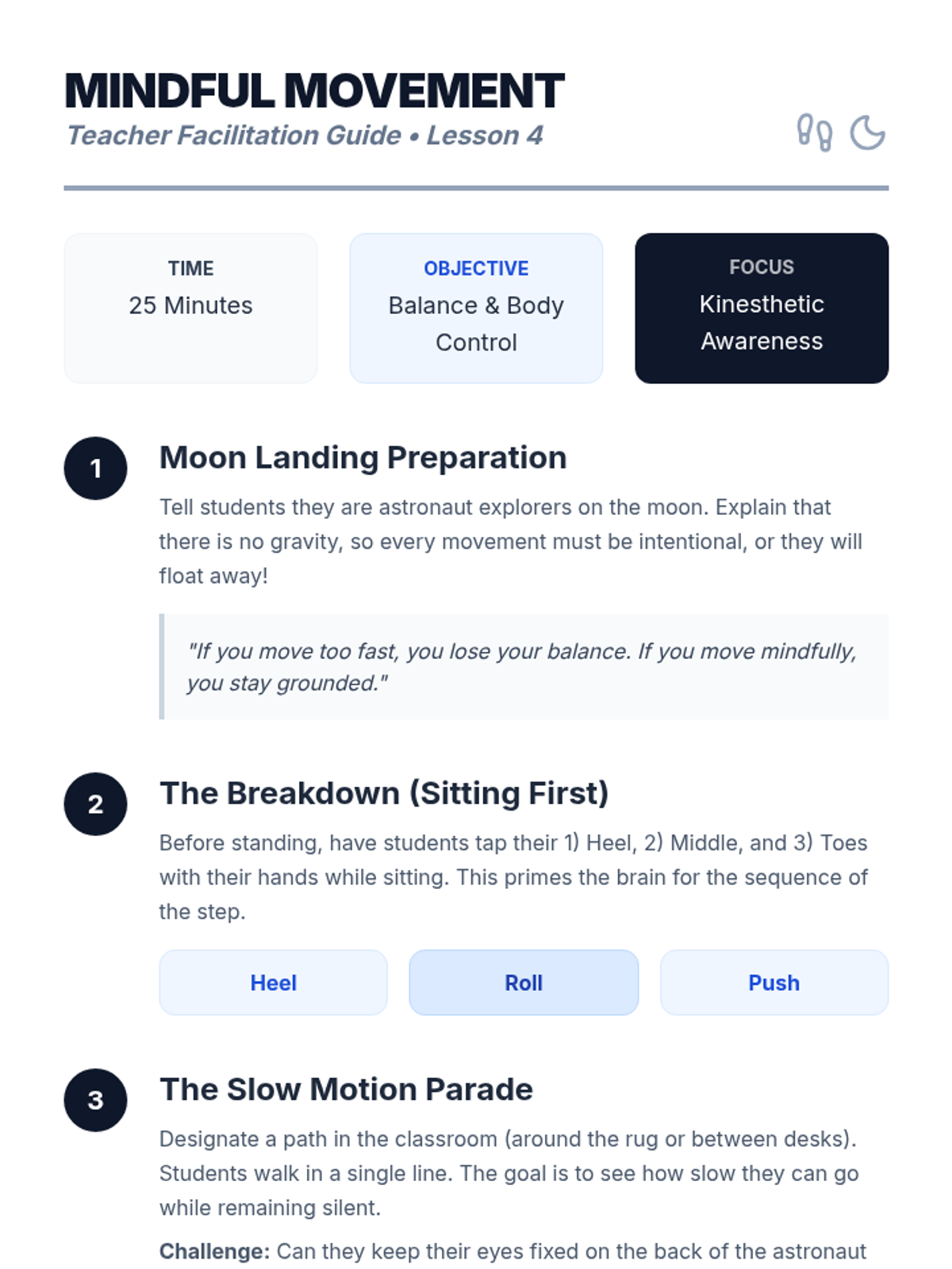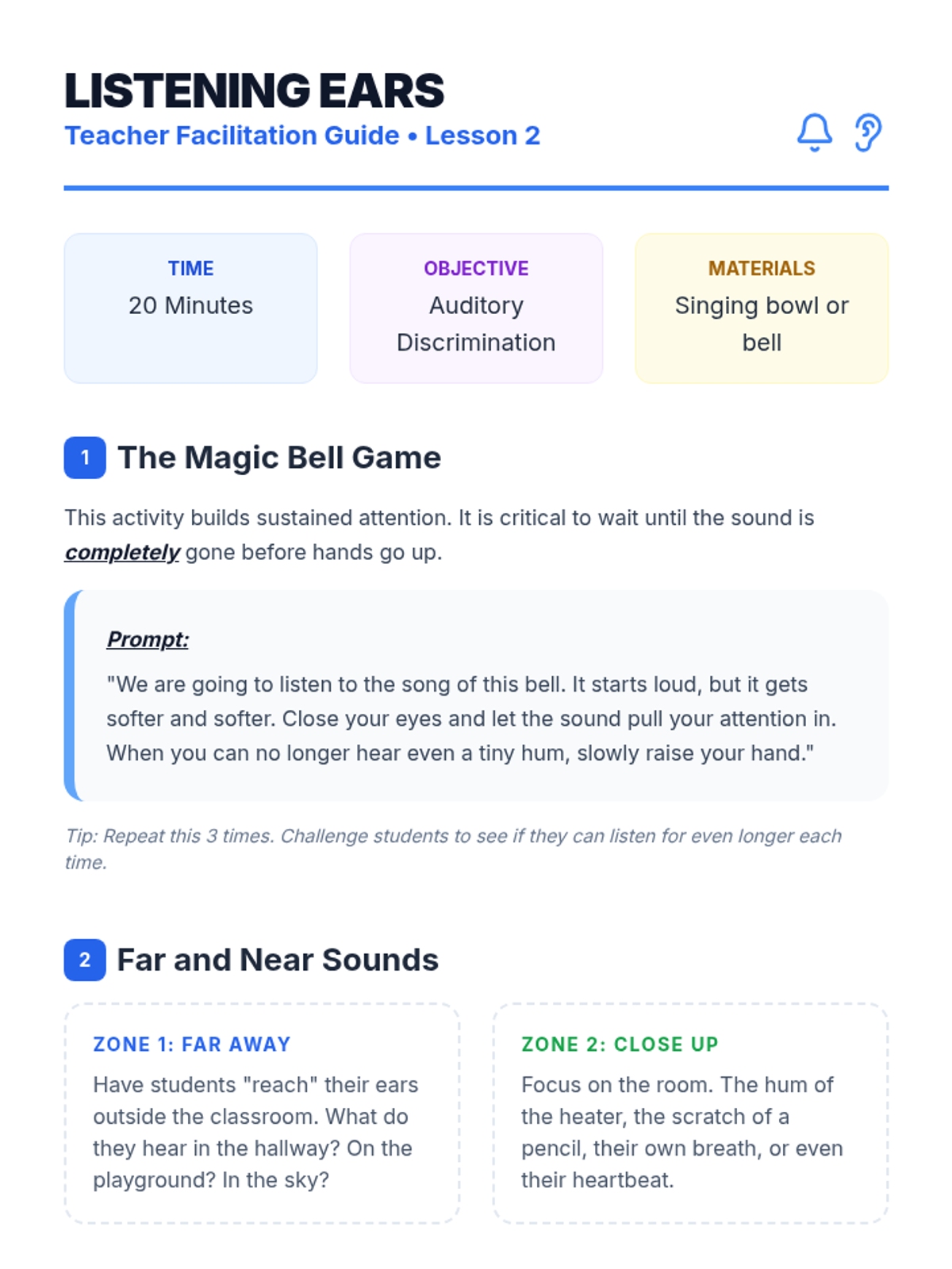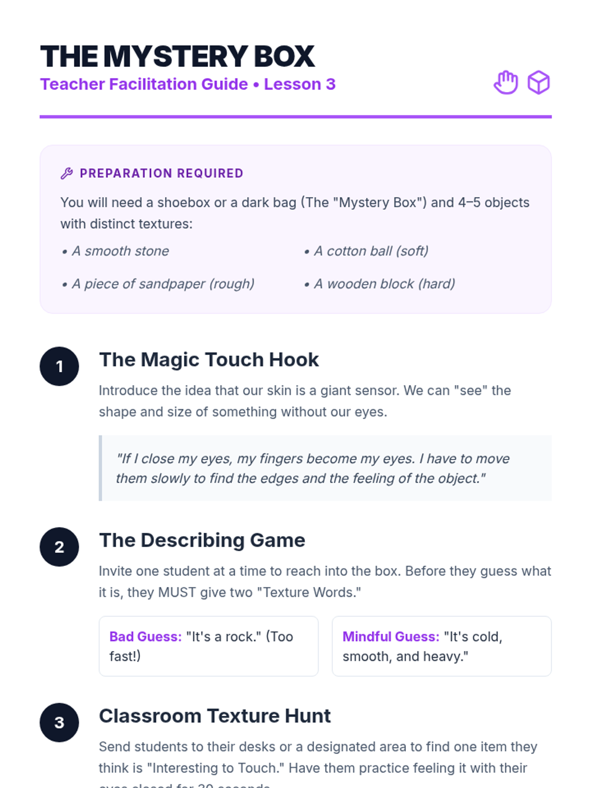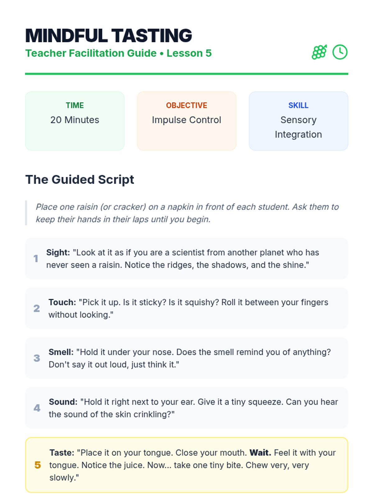A Kindergarten sequence introducing mindfulness through sensory exploration, focusing on sight, sound, touch, movement, and taste to build foundational attention skills.