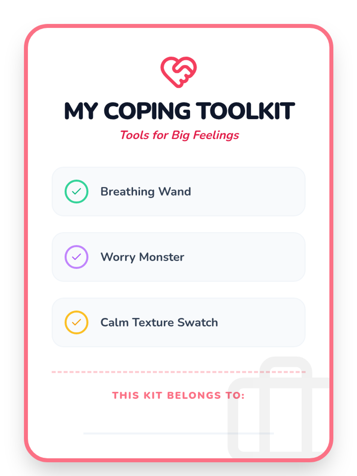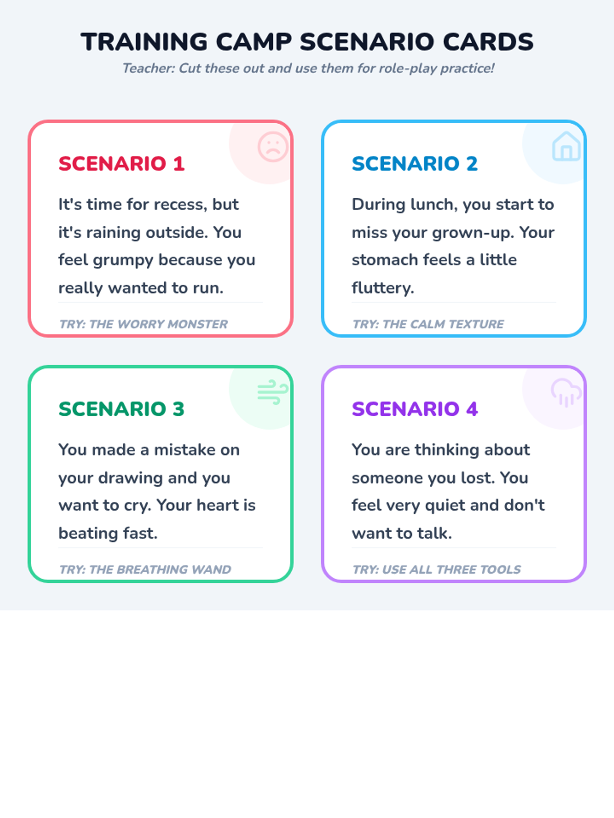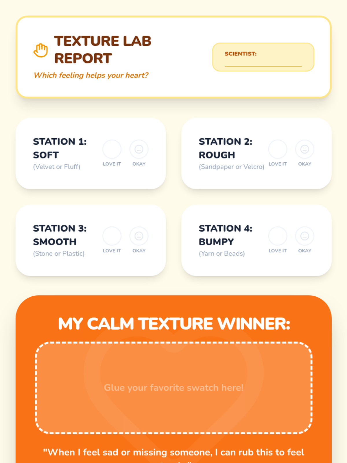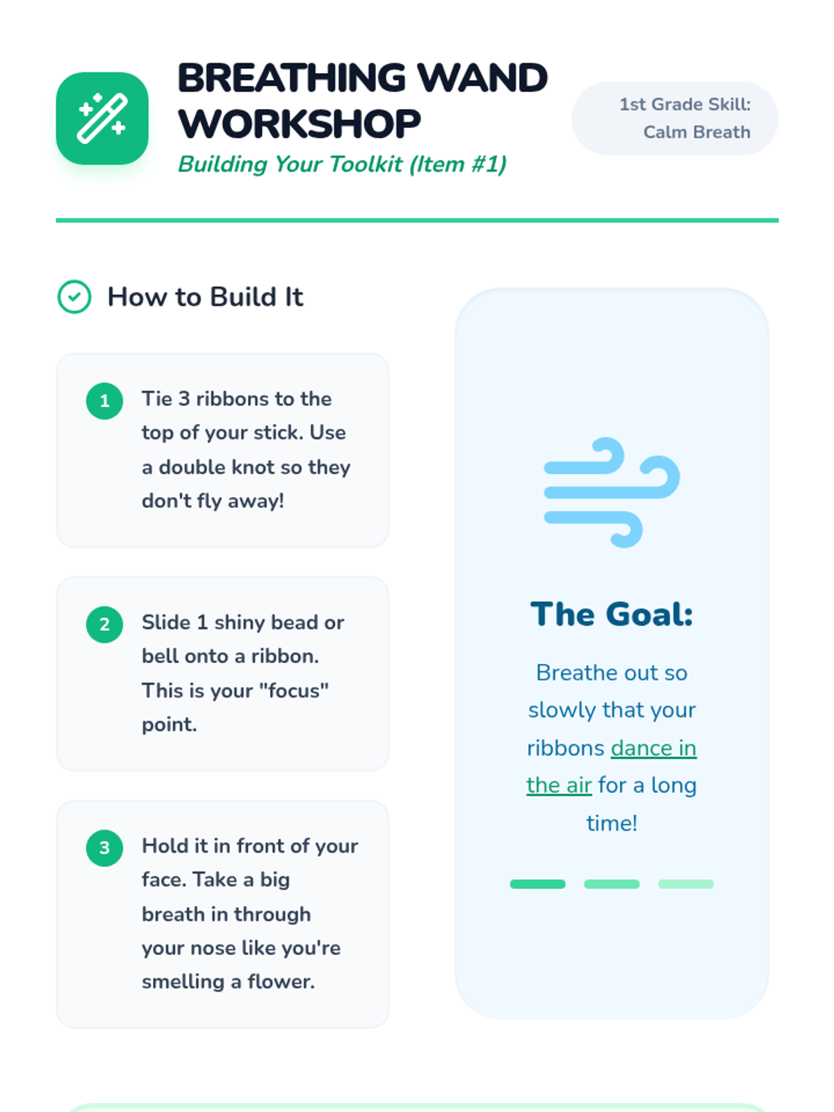 A 1st-grade sequence focused on building a 'Sensory Coping Toolkit' to manage grief and loss. Students analyze stories, create breathing wands and worry monsters, explore calming textures, and practice using their tools through role-play.