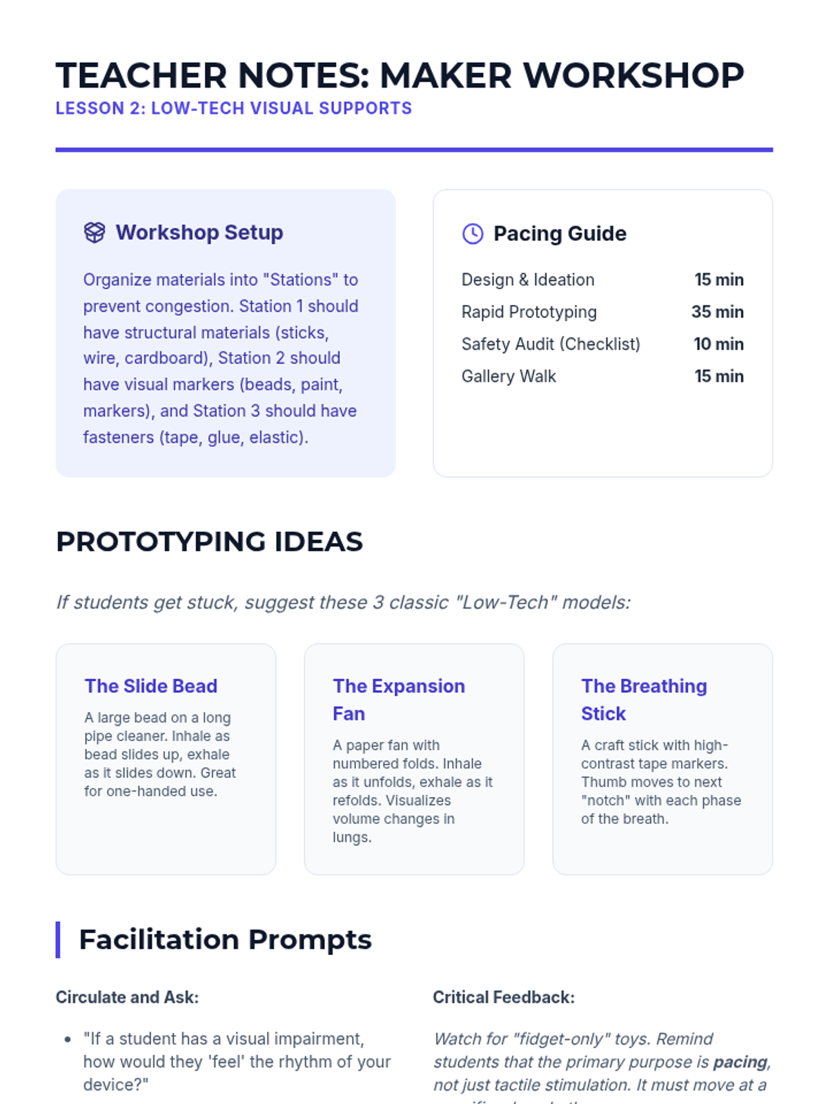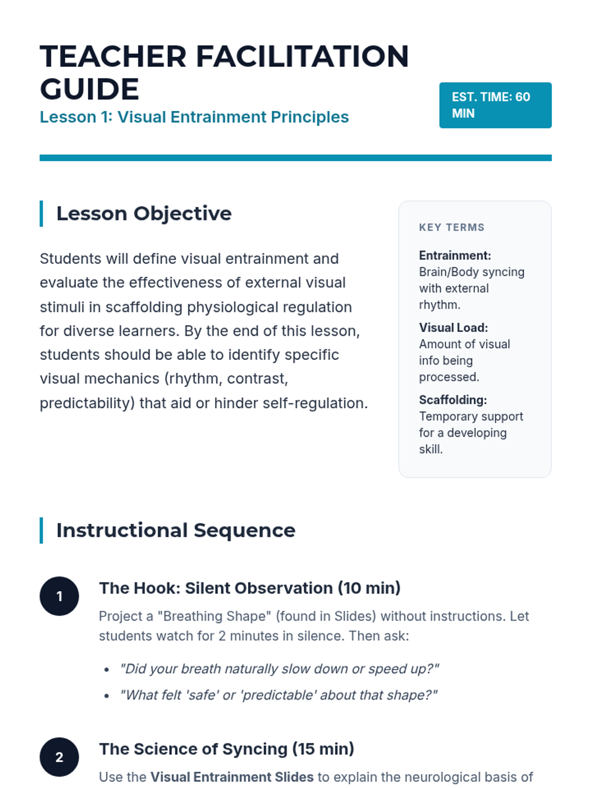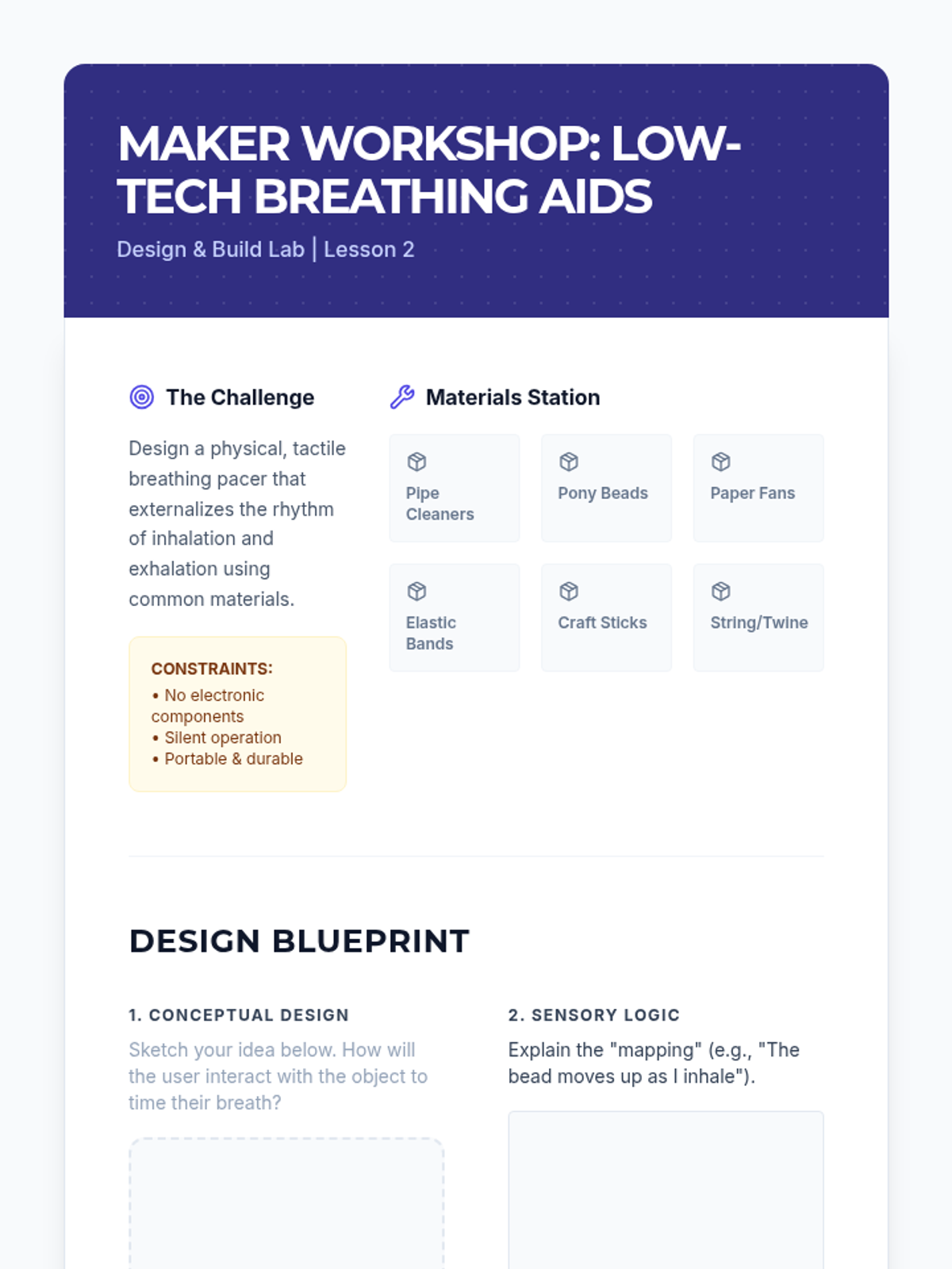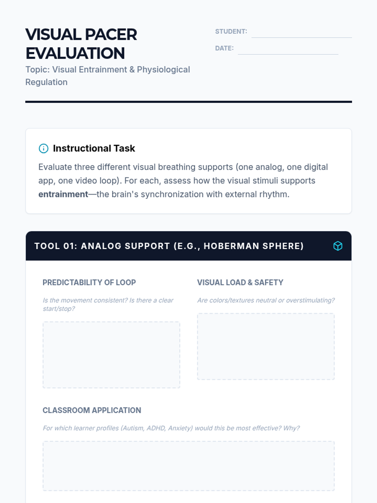 This sequence prepares undergraduate students in special education to design and implement multi-sensory breathing supports. It moves from theoretical principles of visual entrainment to the hands-on creation of low-tech, high-tech, and auditory scaffolds for physiological regulation.