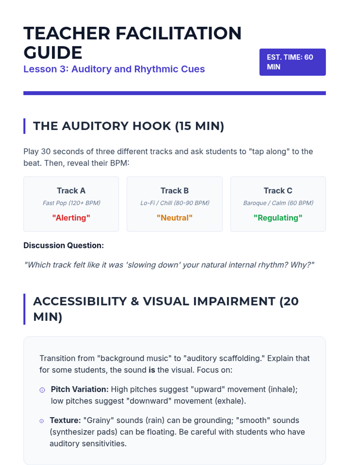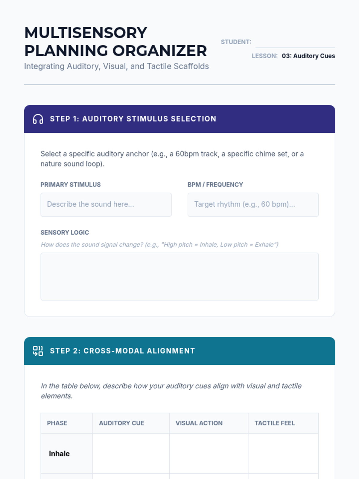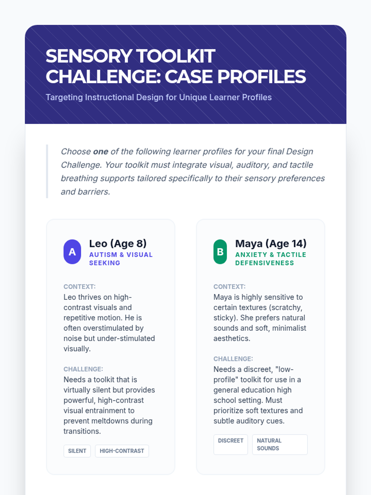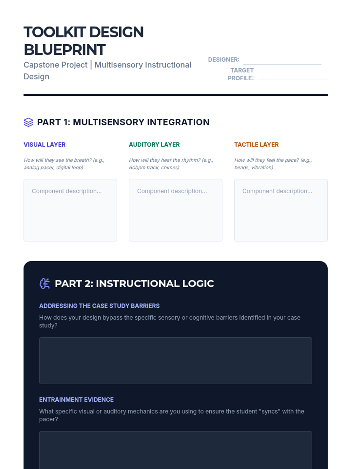 This sequence prepares undergraduate students in special education to design and implement multi-sensory breathing supports. It moves from theoretical principles of visual entrainment to the hands-on creation of low-tech, high-tech, and auditory scaffolds for physiological regulation.