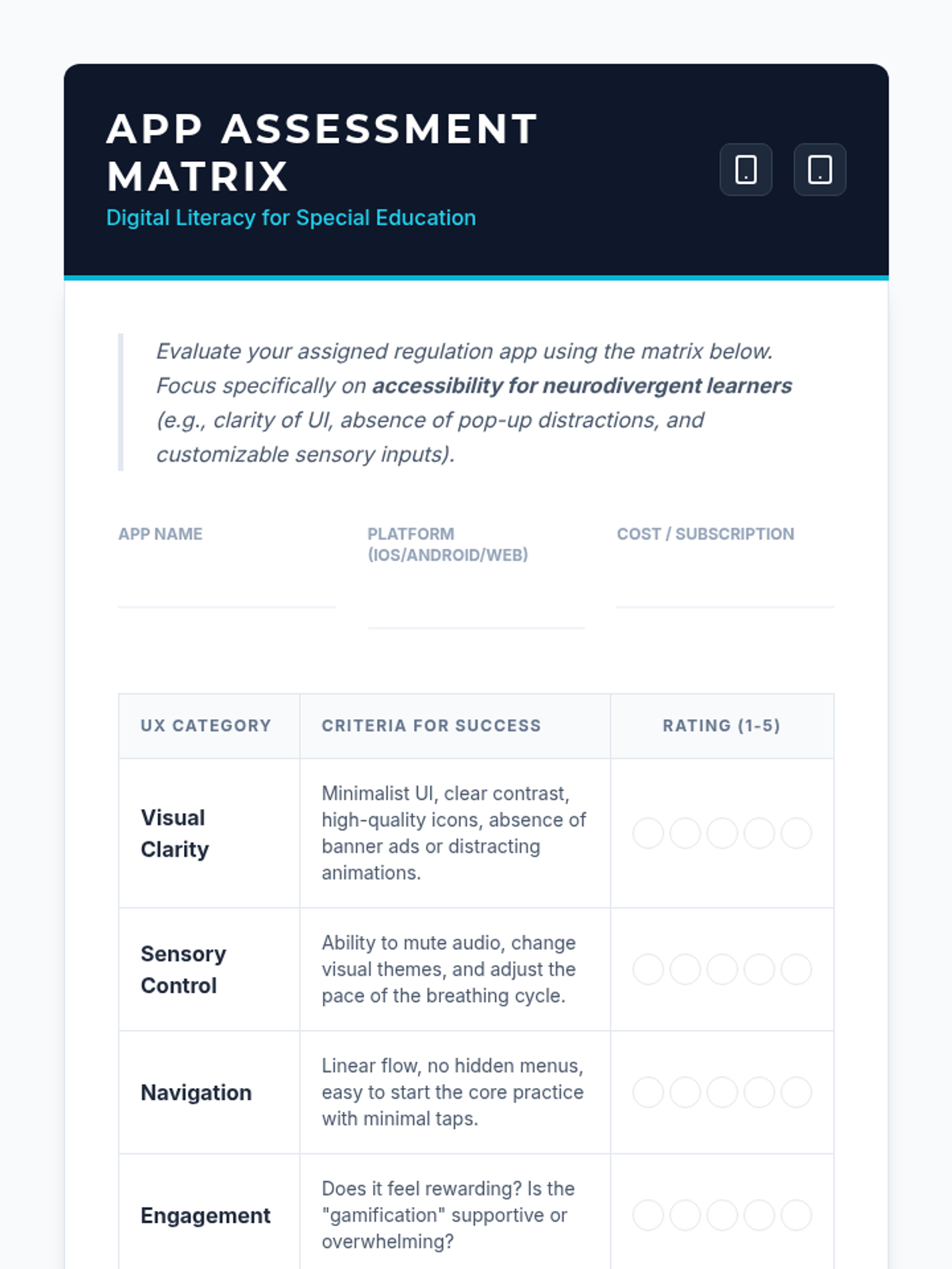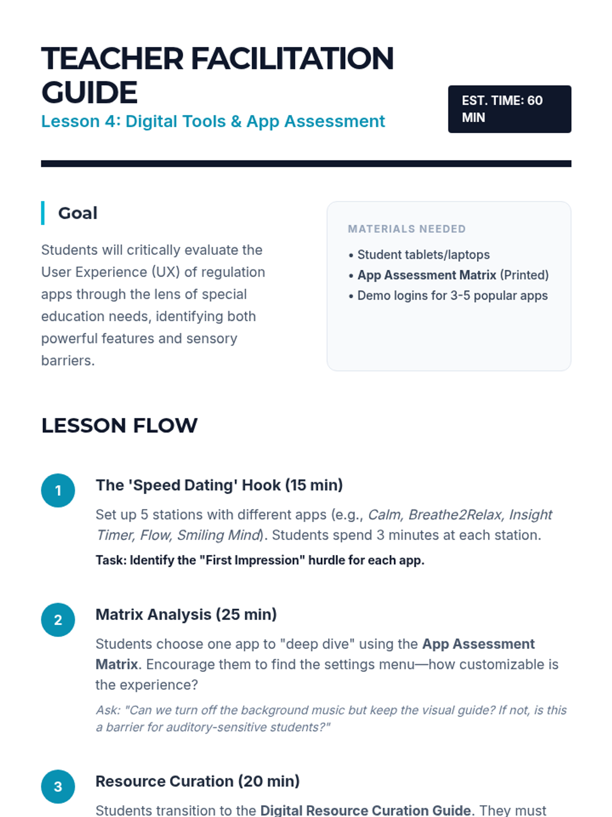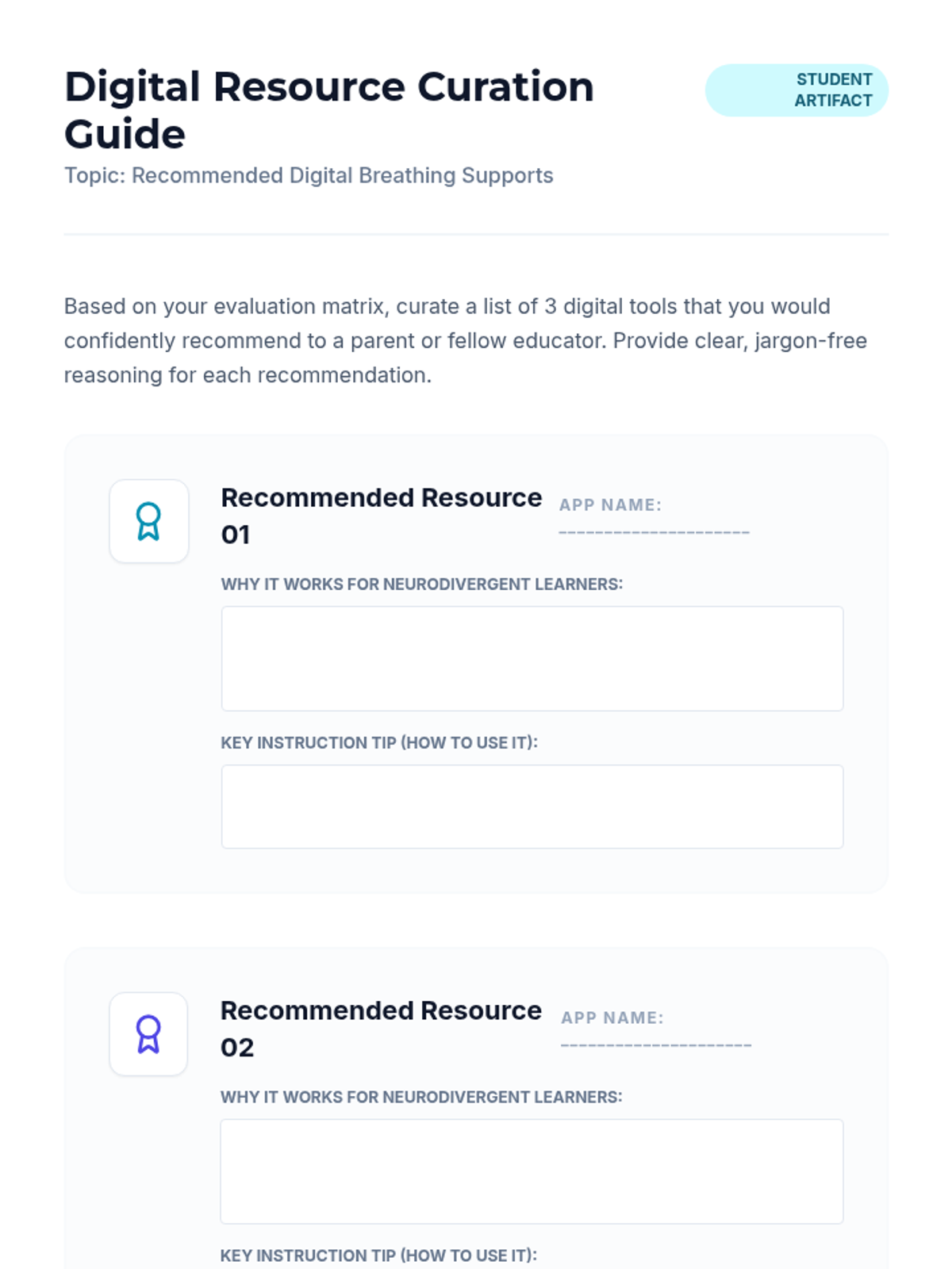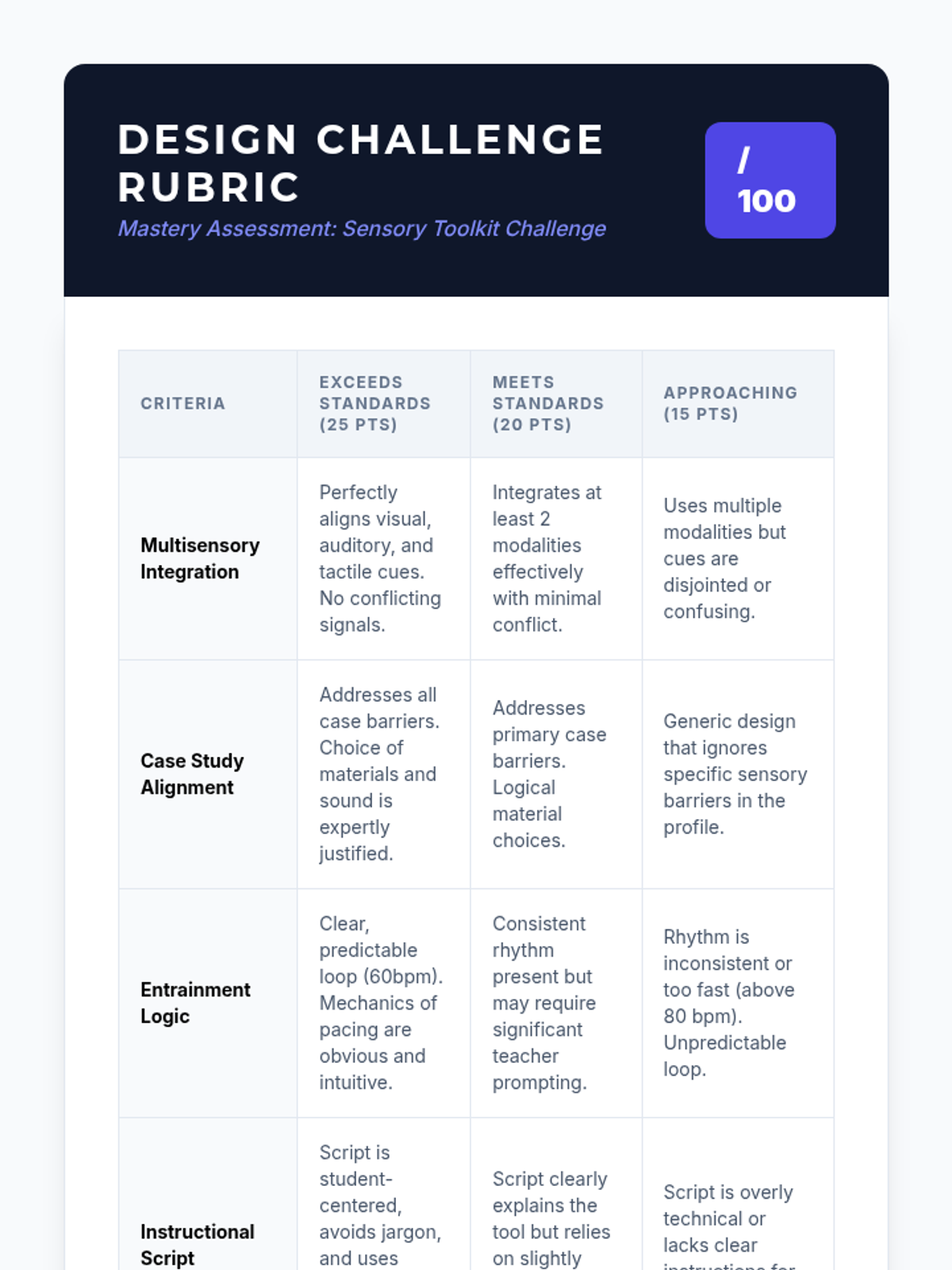 This sequence prepares undergraduate students in special education to design and implement multi-sensory breathing supports. It moves from theoretical principles of visual entrainment to the hands-on creation of low-tech, high-tech, and auditory scaffolds for physiological regulation.