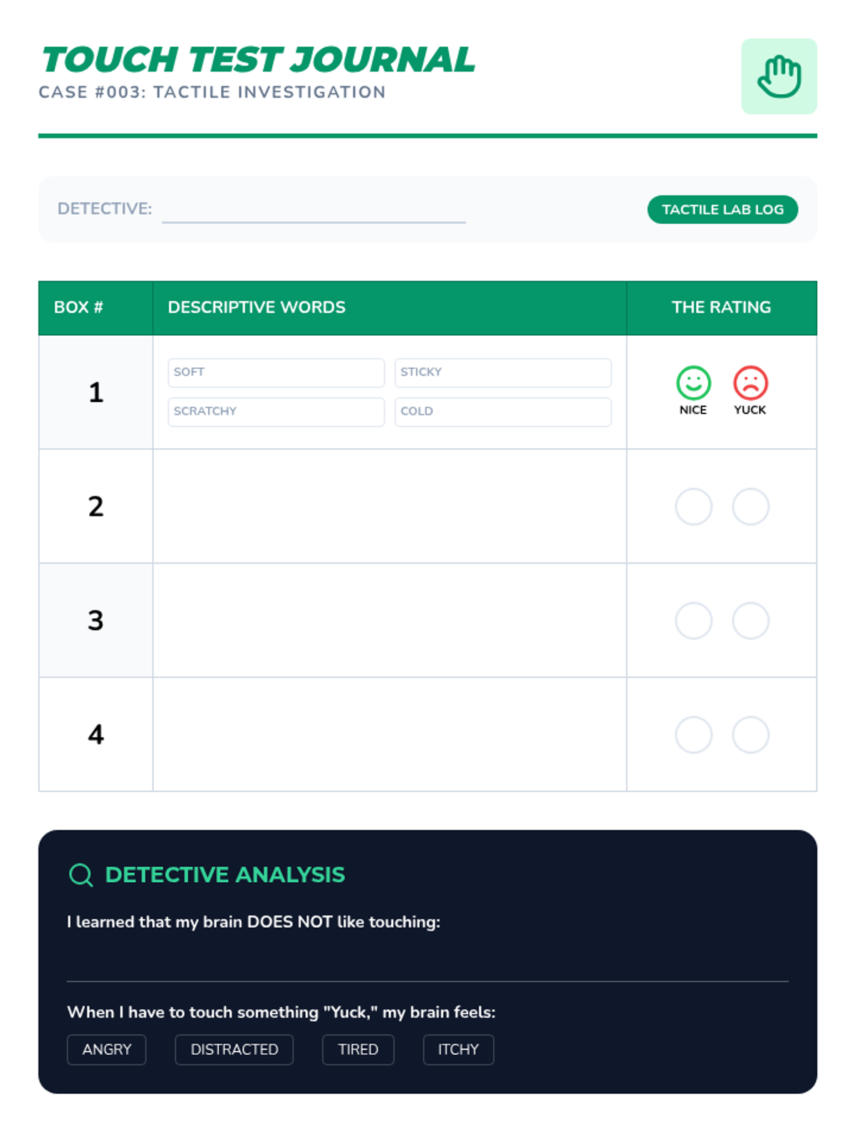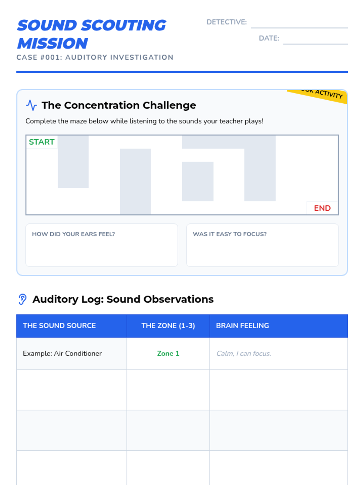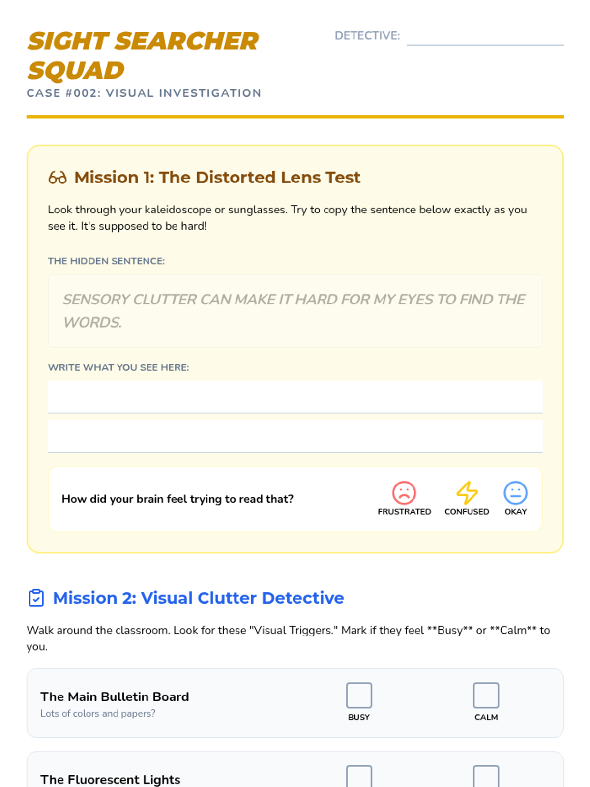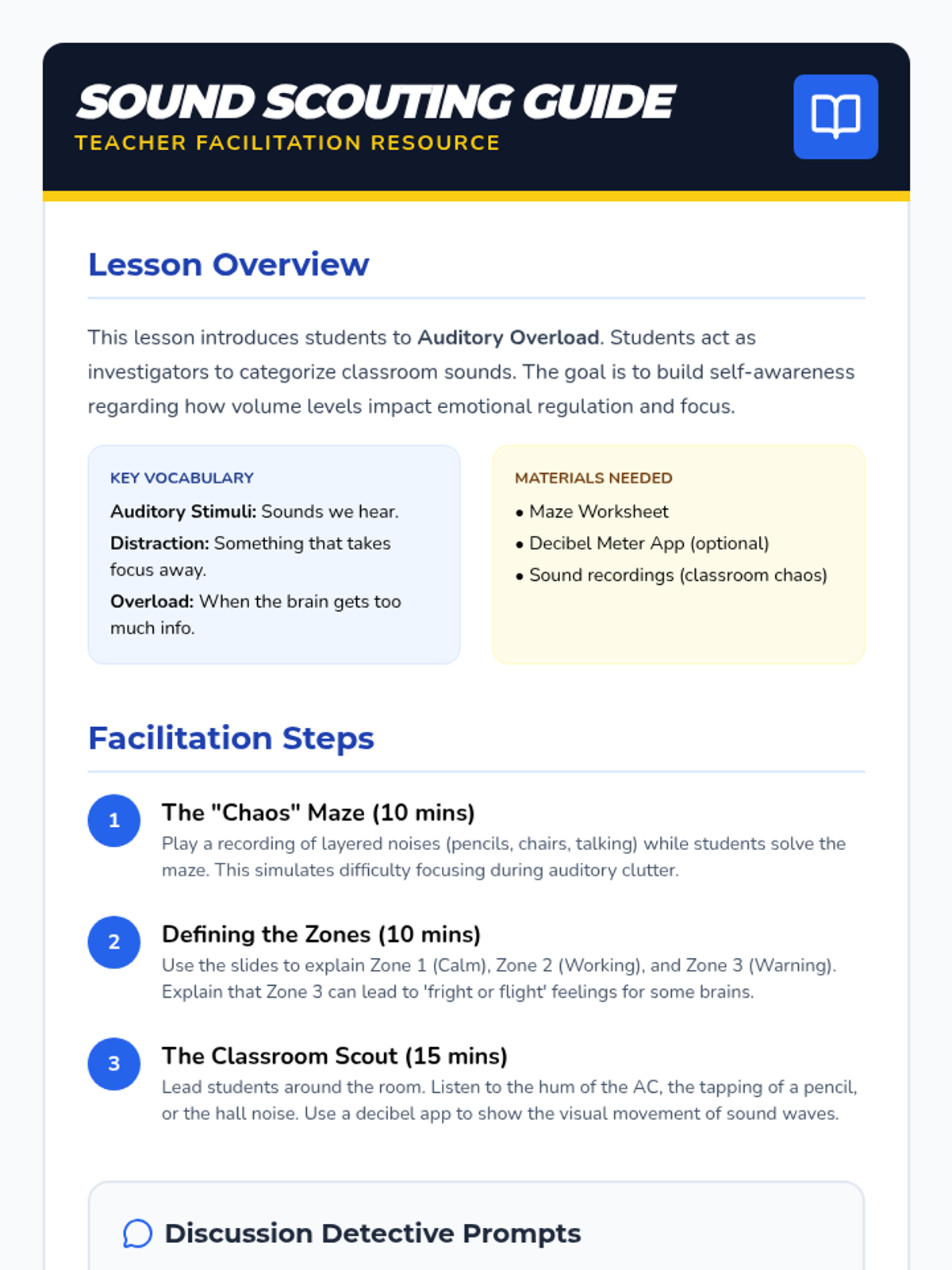 A 2nd-grade sequence where students become 'Sensory Detectives' to identify auditory, visual, and tactile triggers in their environment. They learn to categorize stimuli and create a sensory map of their classroom to better understand and manage sensory overload.