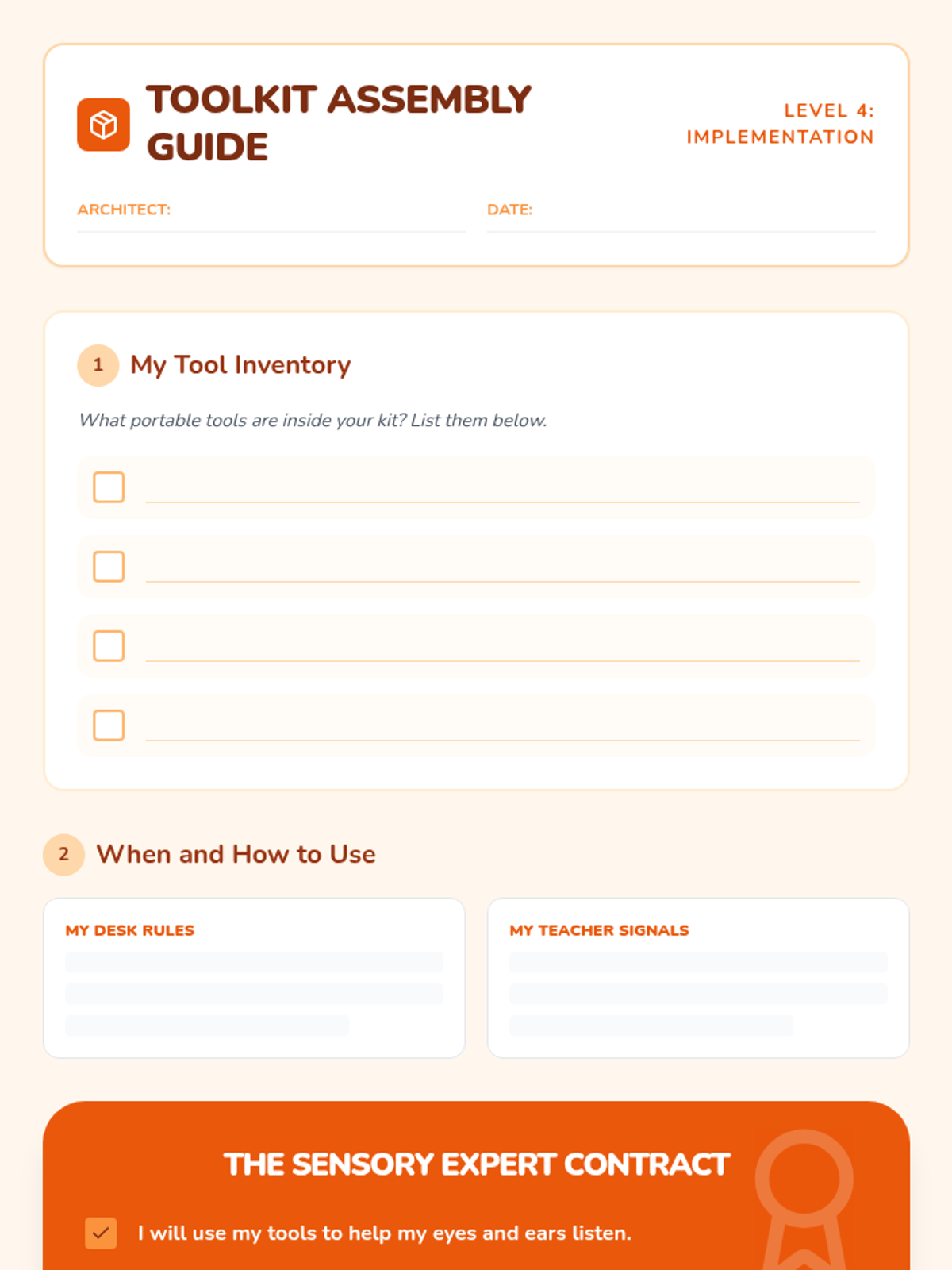 A project-based sequence for 2nd graders to create a personalized sensory diet. Students learn to proactively manage their sensory needs by mapping specific tools to their daily school schedule and creating a visual menu for independent use.