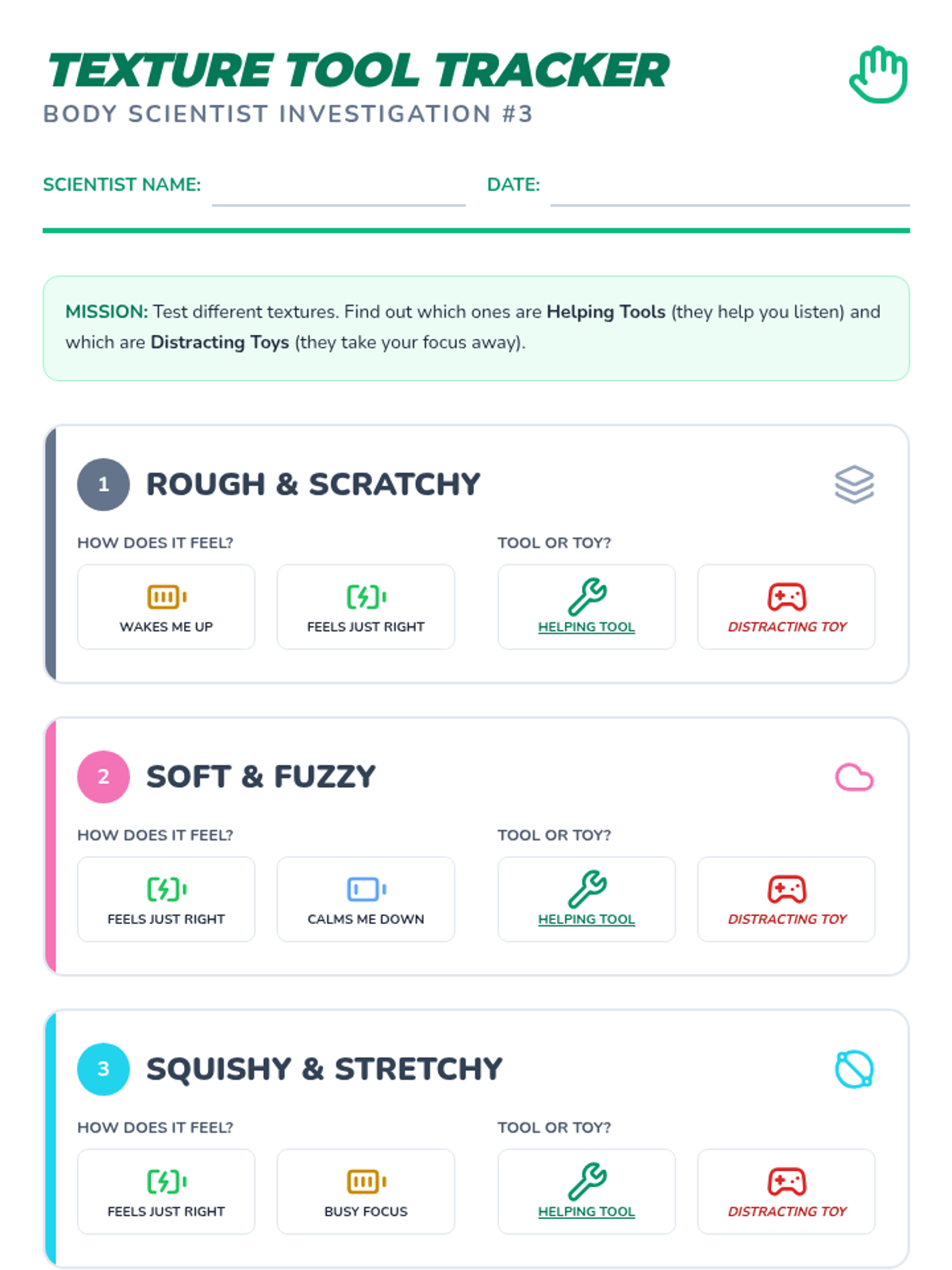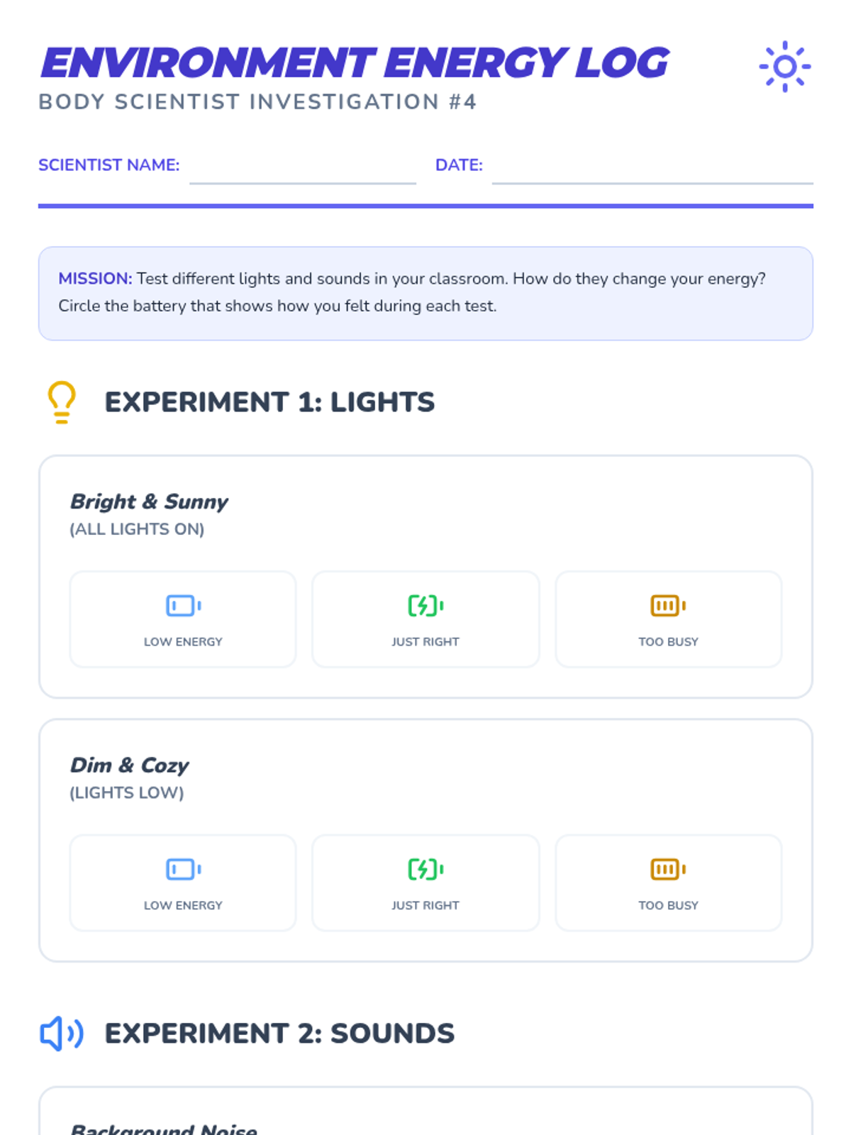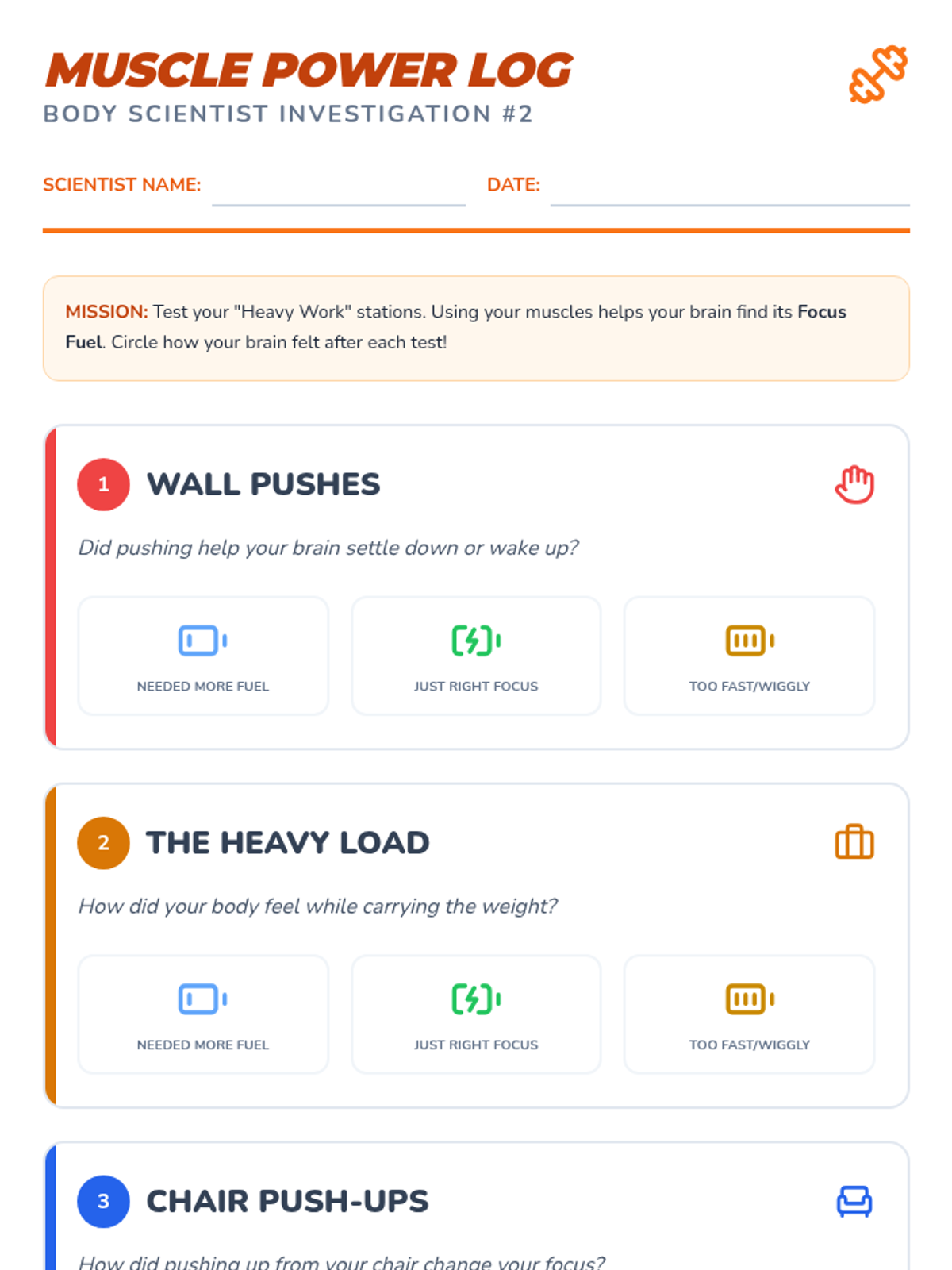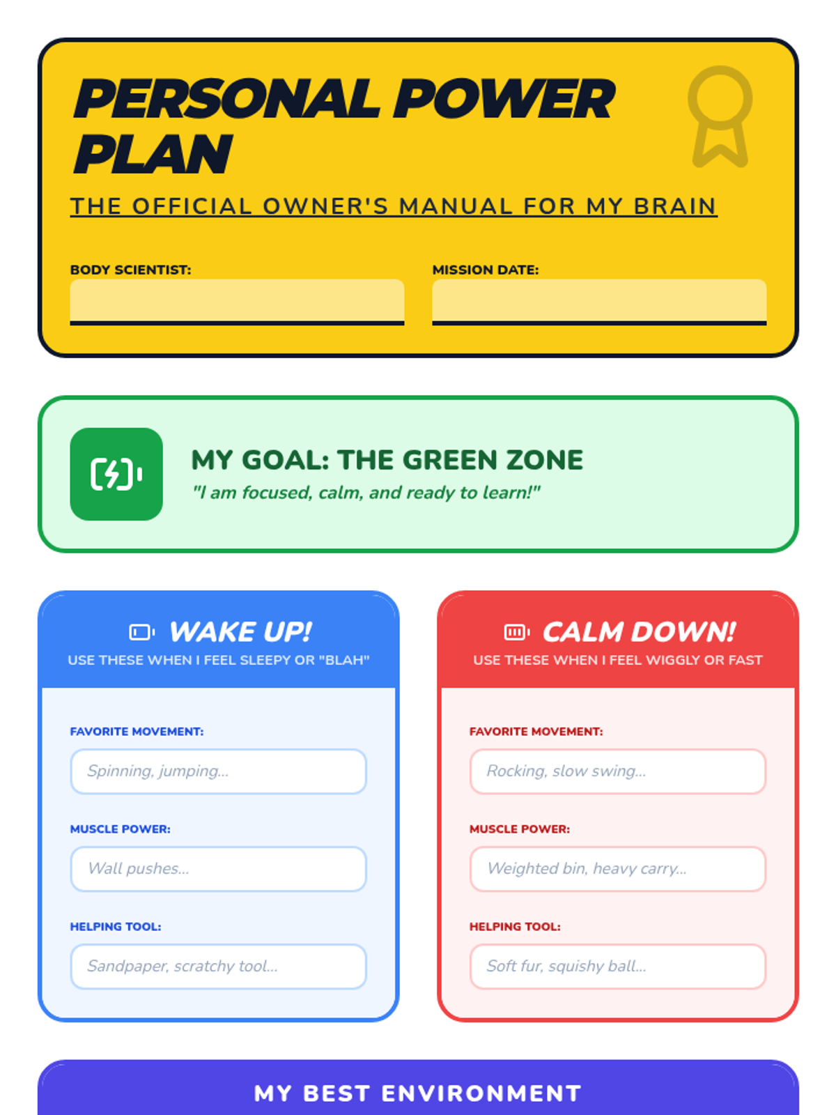 A 5-lesson workshop sequence where 2nd-grade students systematically explore vestibular, proprioceptive, tactile, auditory, and visual sensory inputs. Students act as 'body scientists' to evaluate how different tools and activities affect their regulation, culminating in a personalized 'Personal Power Plan' sensory diet.