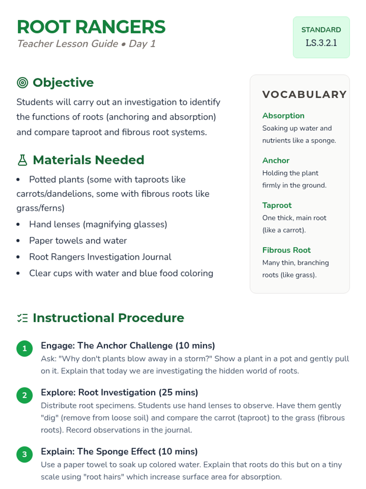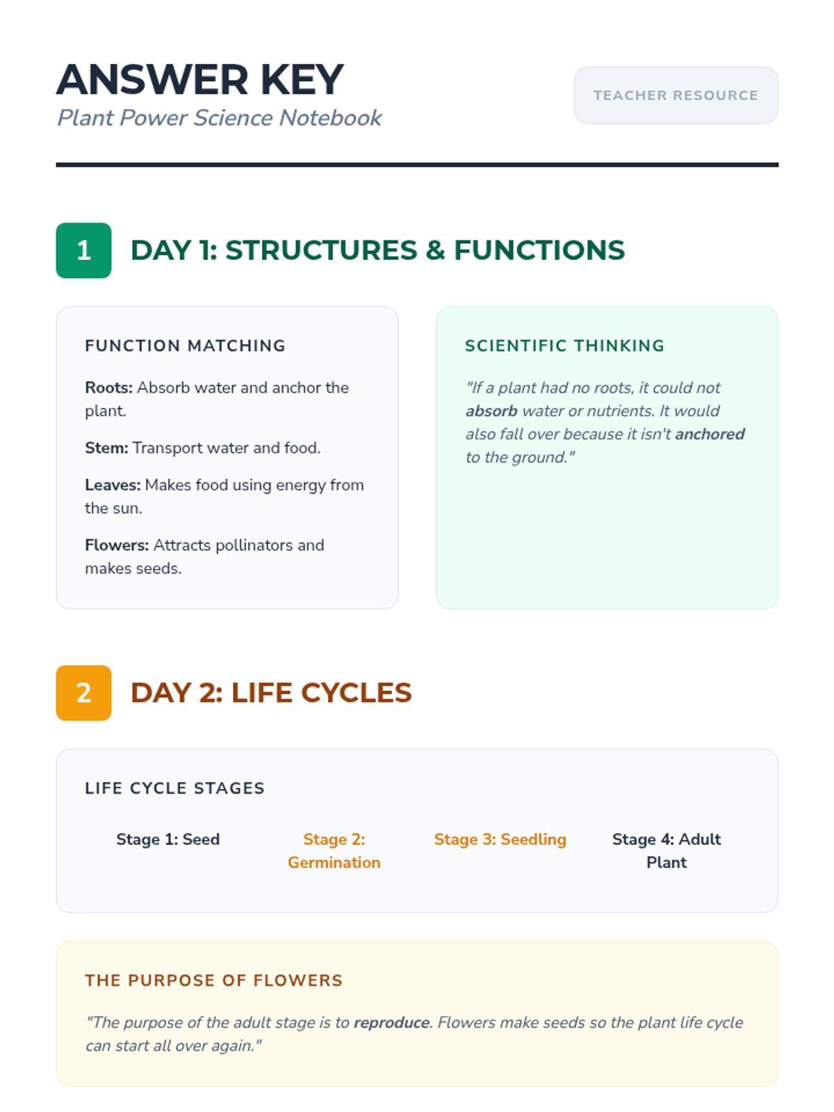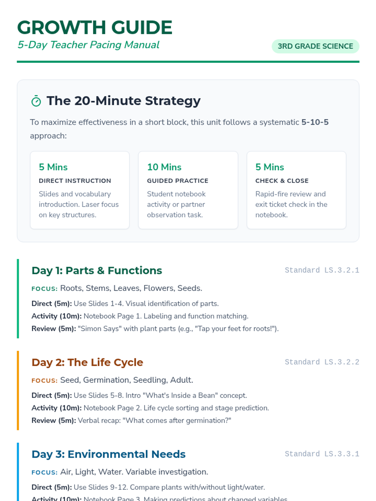 A comprehensive 3rd-grade science sequence exploring how plants grow, survive, and interact with their environment through systematic 20-minute daily lessons.