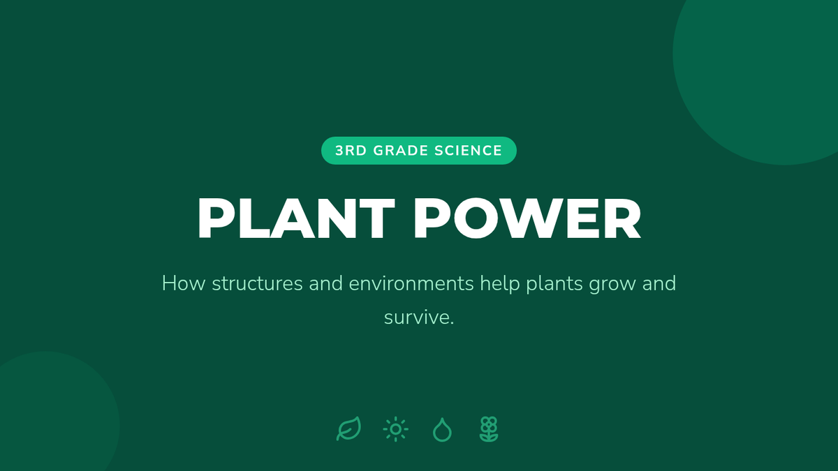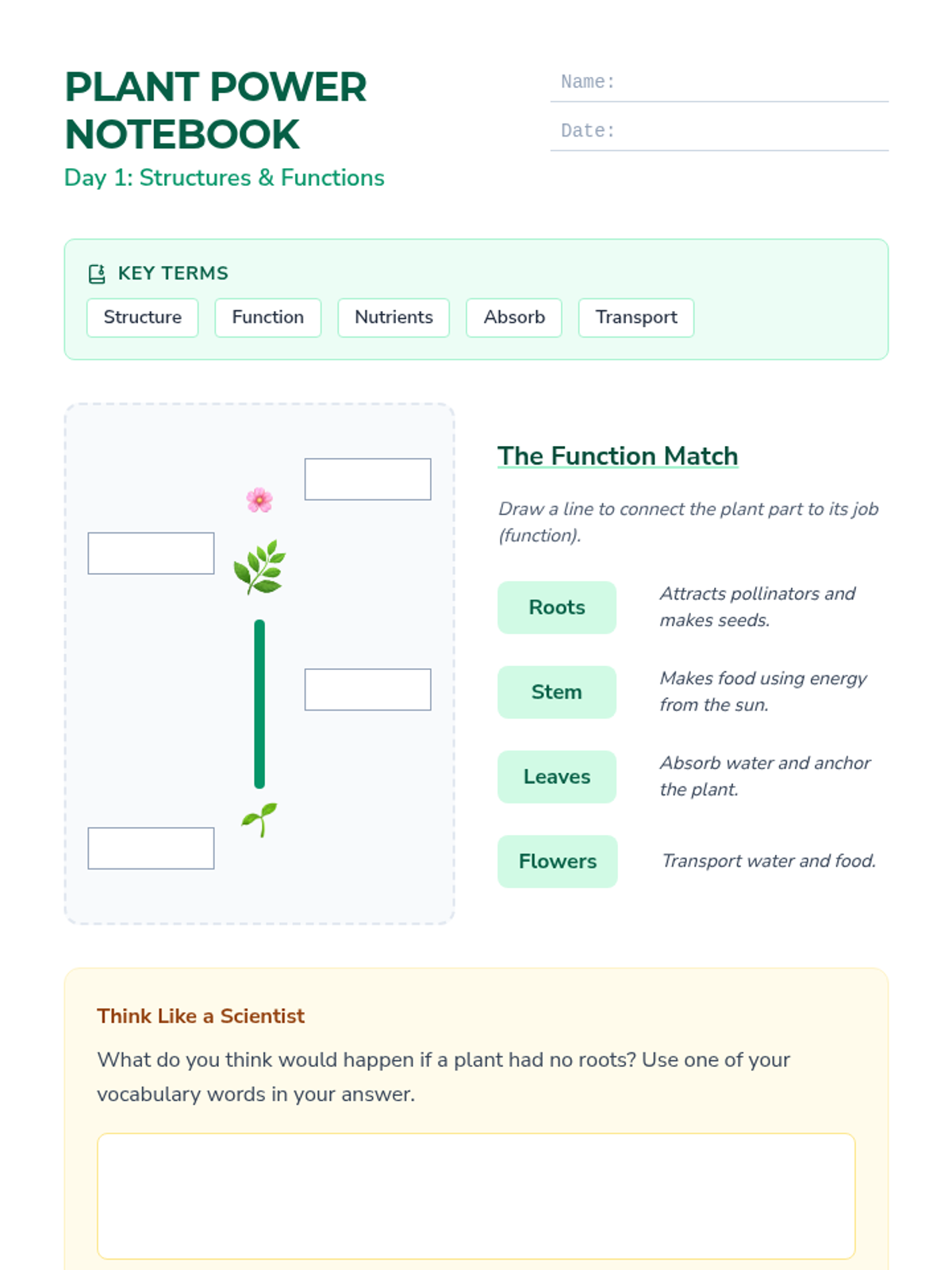 A 5-day unit for 3rd grade students exploring how plant structures like roots, stems, leaves, and flowers function together to ensure survival and growth. Students engage in hands-on investigations and observations to understand botanical systems.
