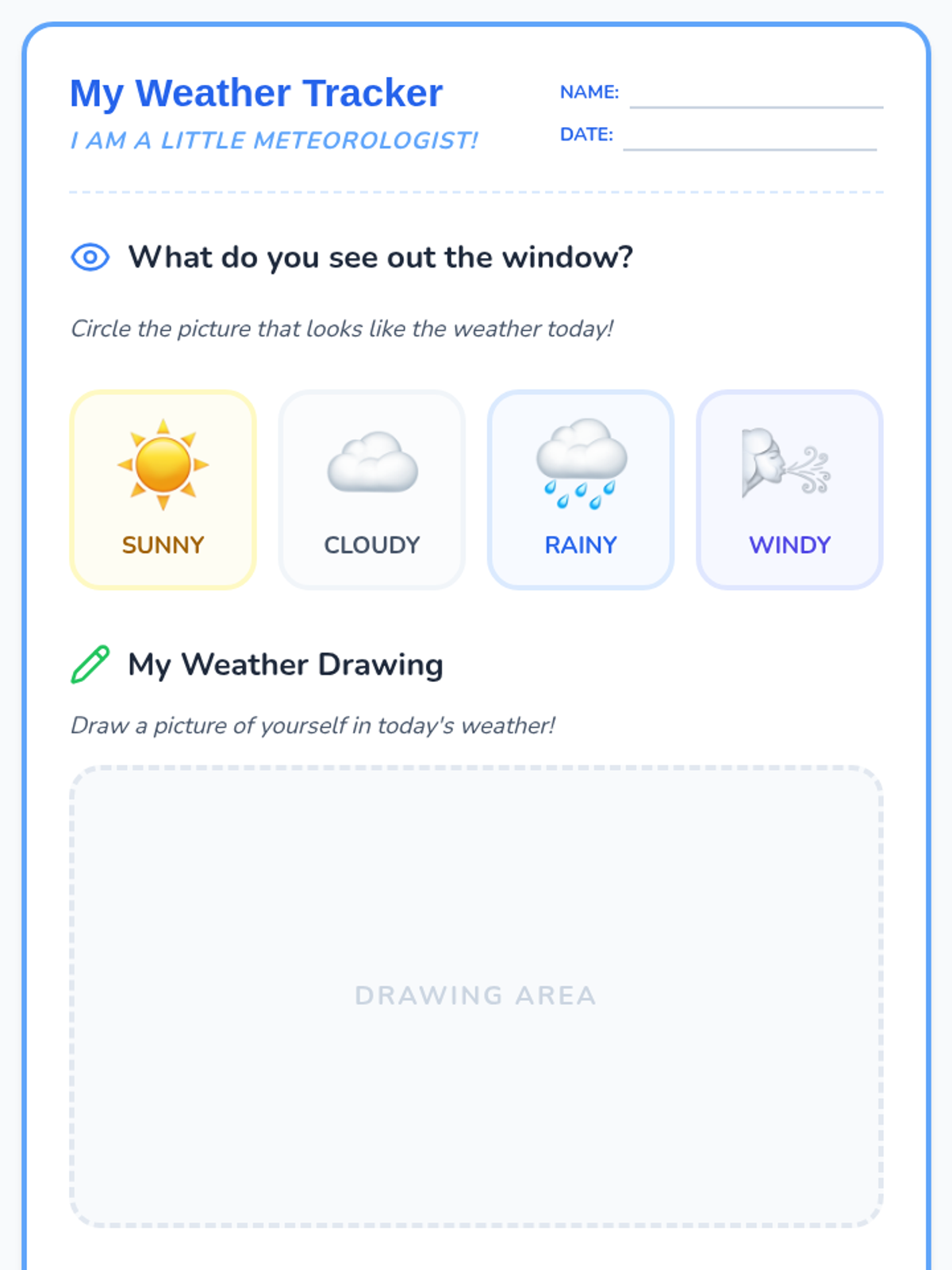A comprehensive Pre-K exploration of weather types and seasonal changes through observation, hands-on experiments, and creative activities. Students will learn to identify common weather patterns and understand how the environment changes throughout the year.