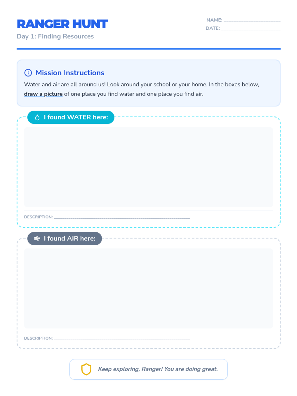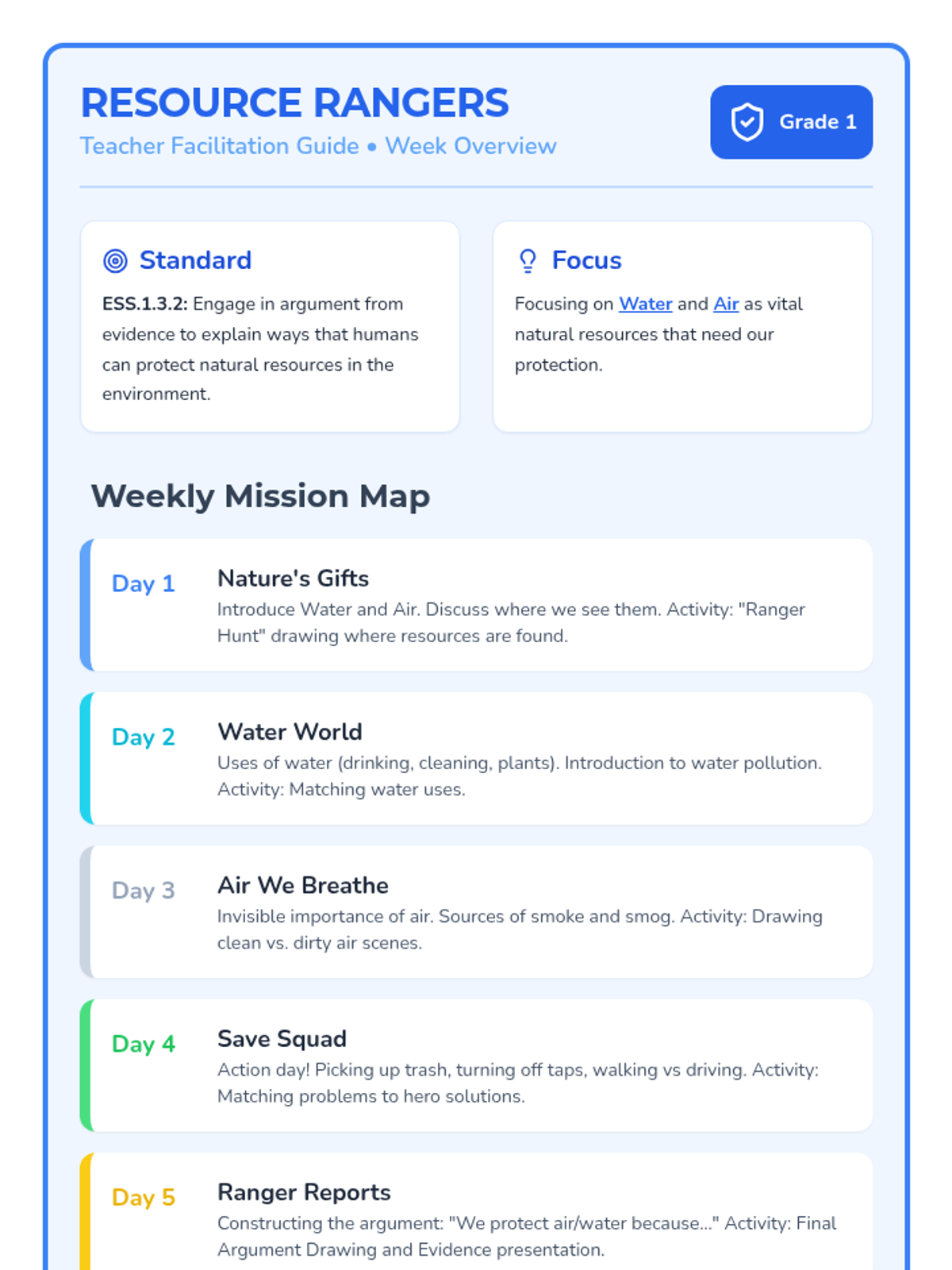 A comprehensive one-week unit for 1st grade students focused on identifying water and air as natural resources and learning how to protect them through evidence-based arguments. Students transform into 'Resource Rangers' to investigate, observe, and defend our planet's vital resources.