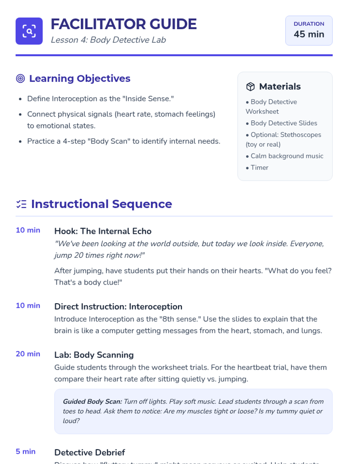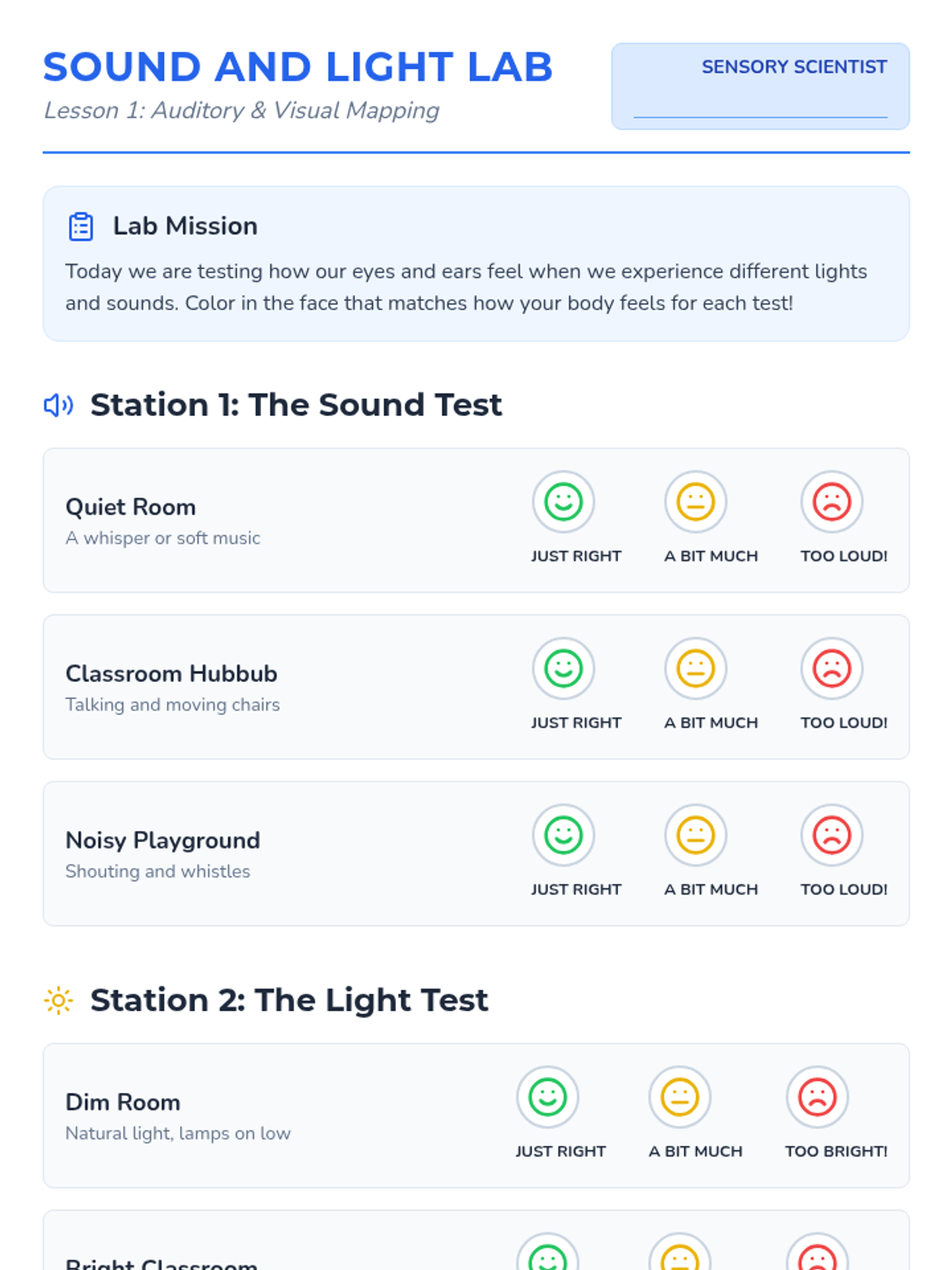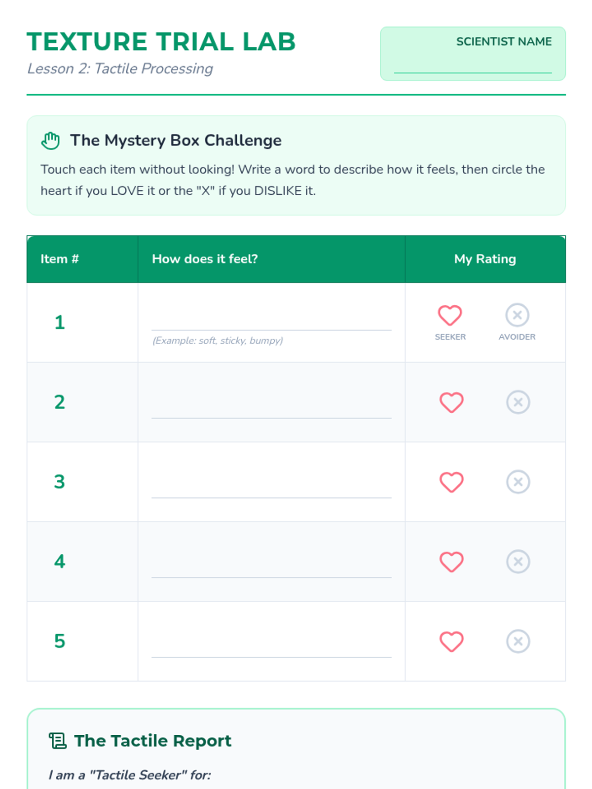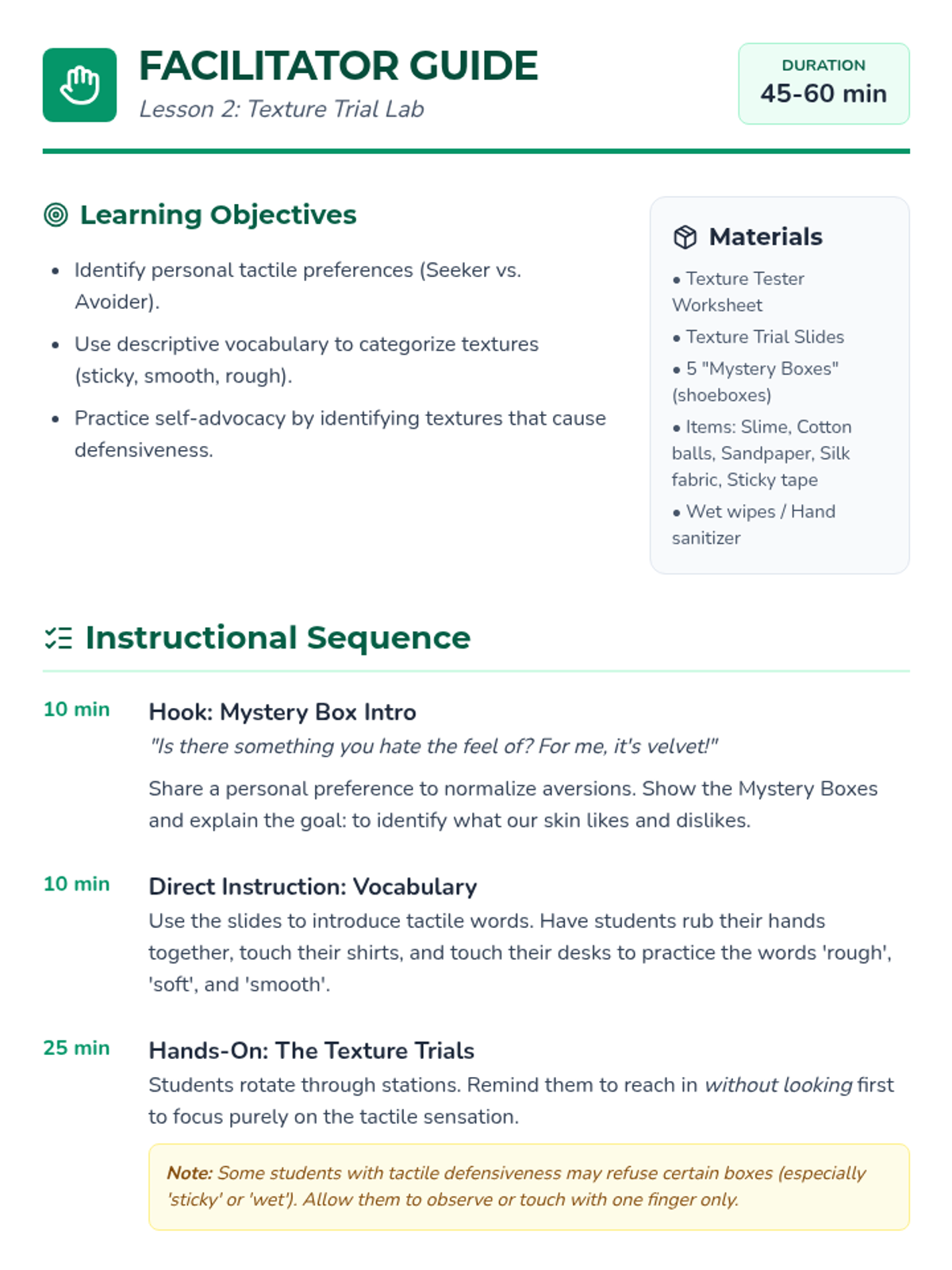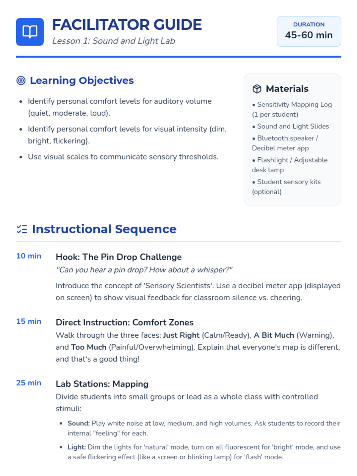 A comprehensive 5-lesson unit for 2nd-grade students to explore and identify their unique sensory preferences, thresholds, and needs across seven sensory systems. Students act as 'Sensory Scientists' to build a personal profile that helps them and their support systems understand how to stay regulated and ready to learn.