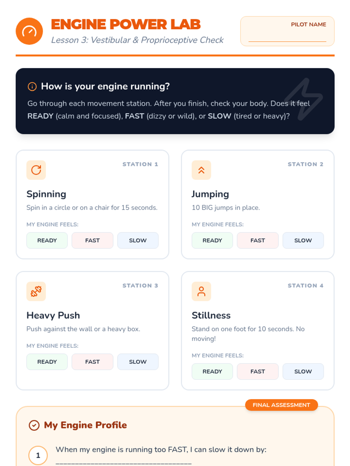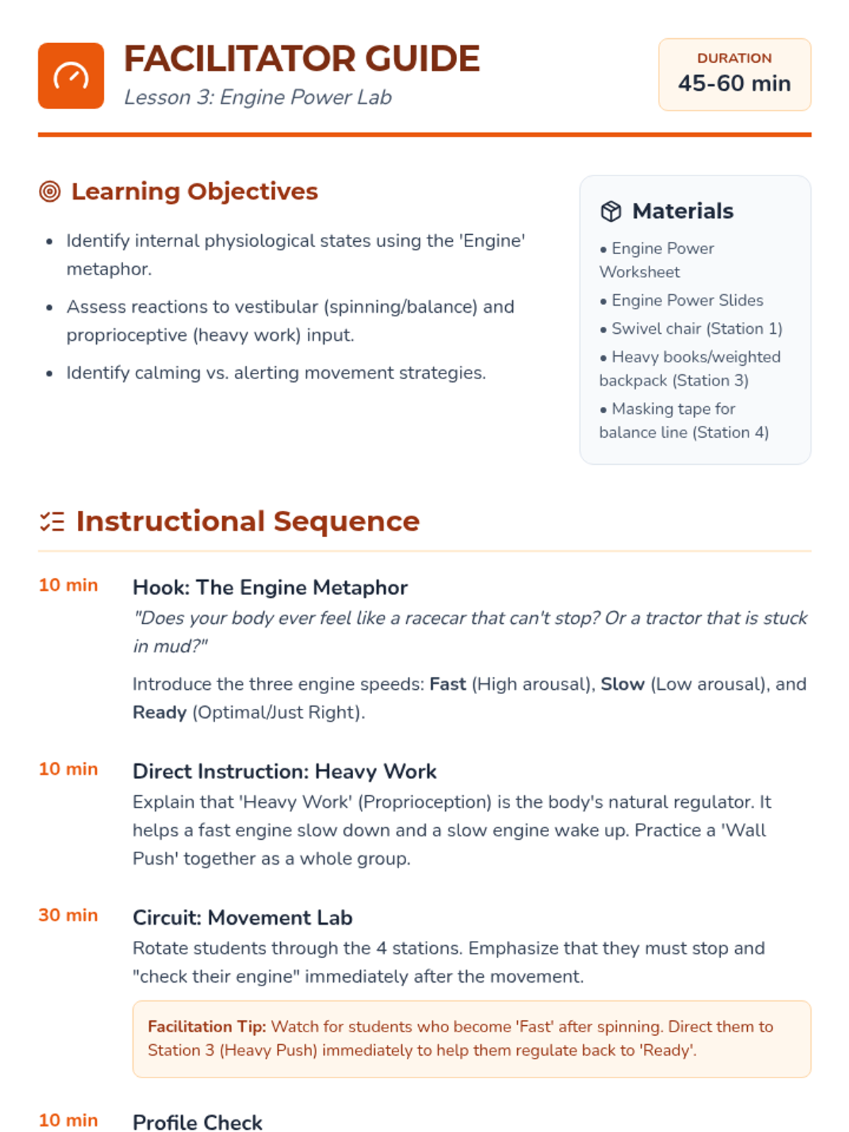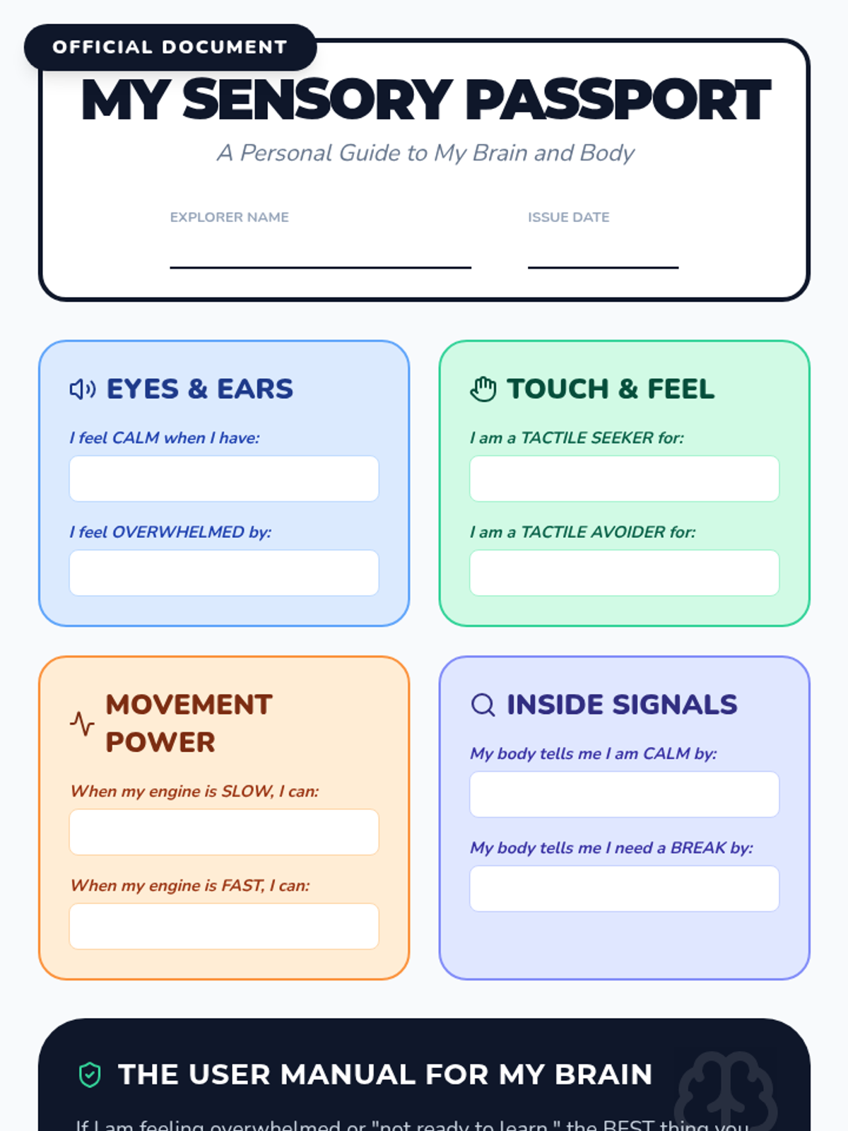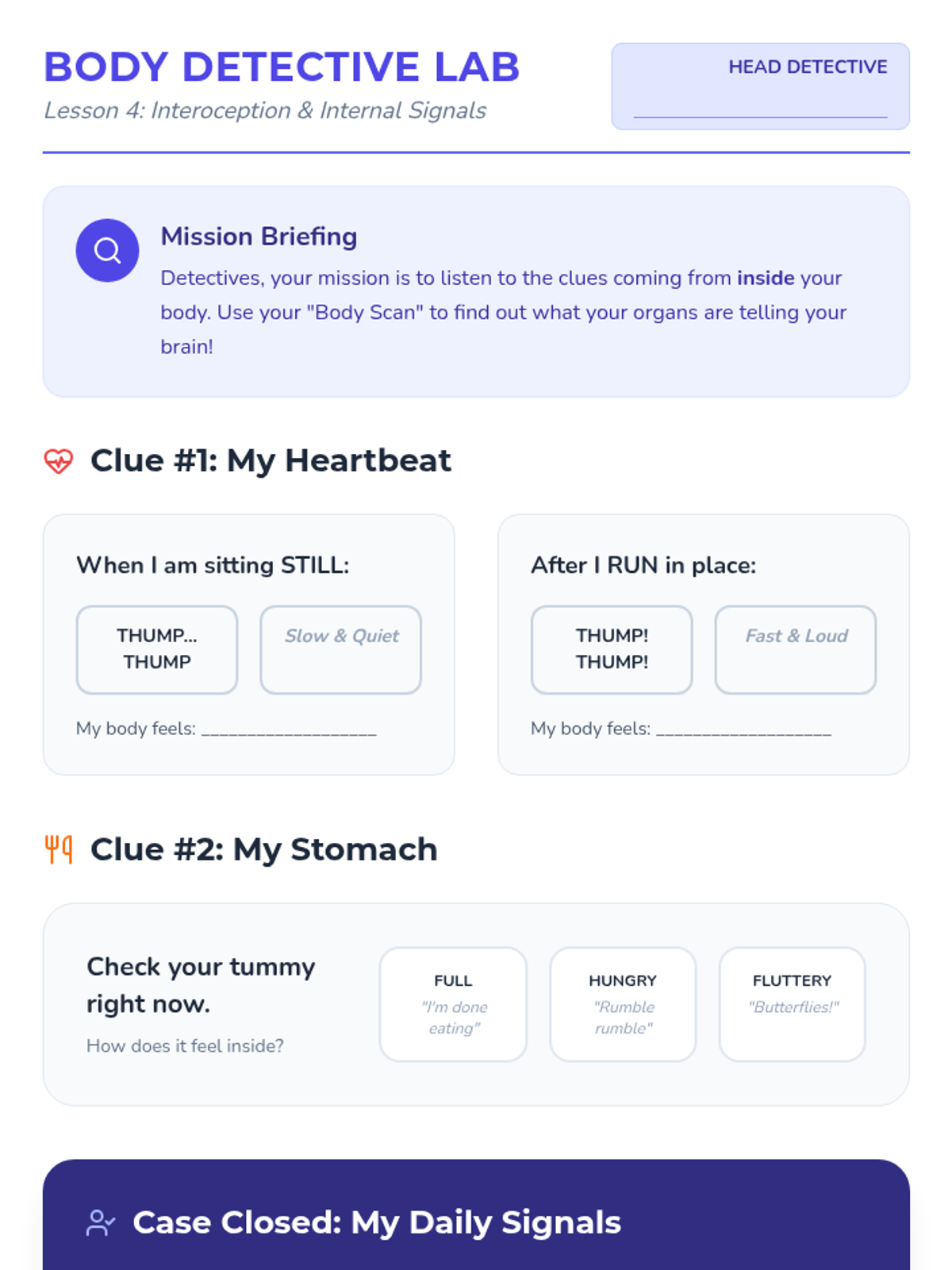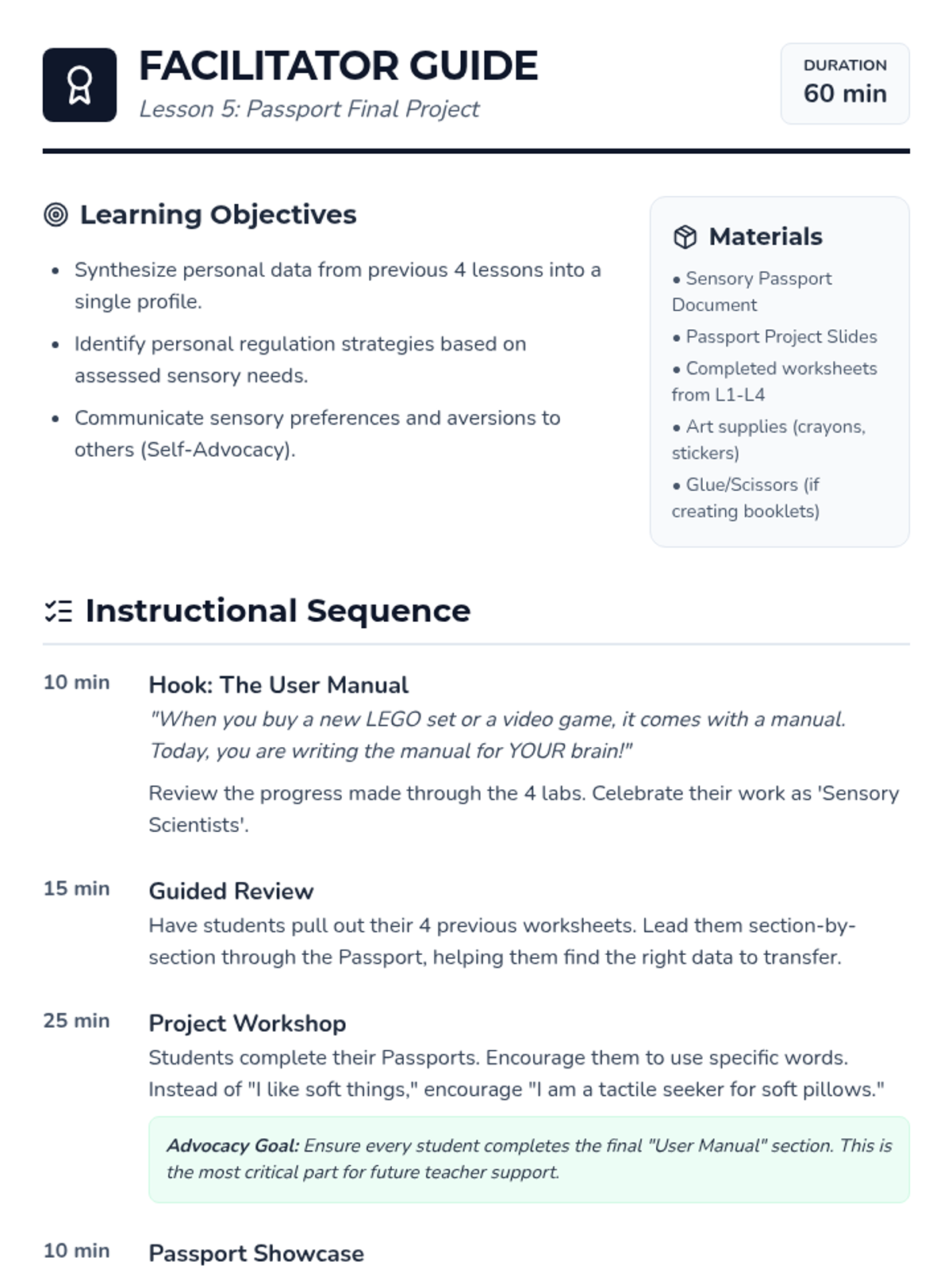 A comprehensive 5-lesson unit for 2nd-grade students to explore and identify their unique sensory preferences, thresholds, and needs across seven sensory systems. Students act as 'Sensory Scientists' to build a personal profile that helps them and their support systems understand how to stay regulated and ready to learn.