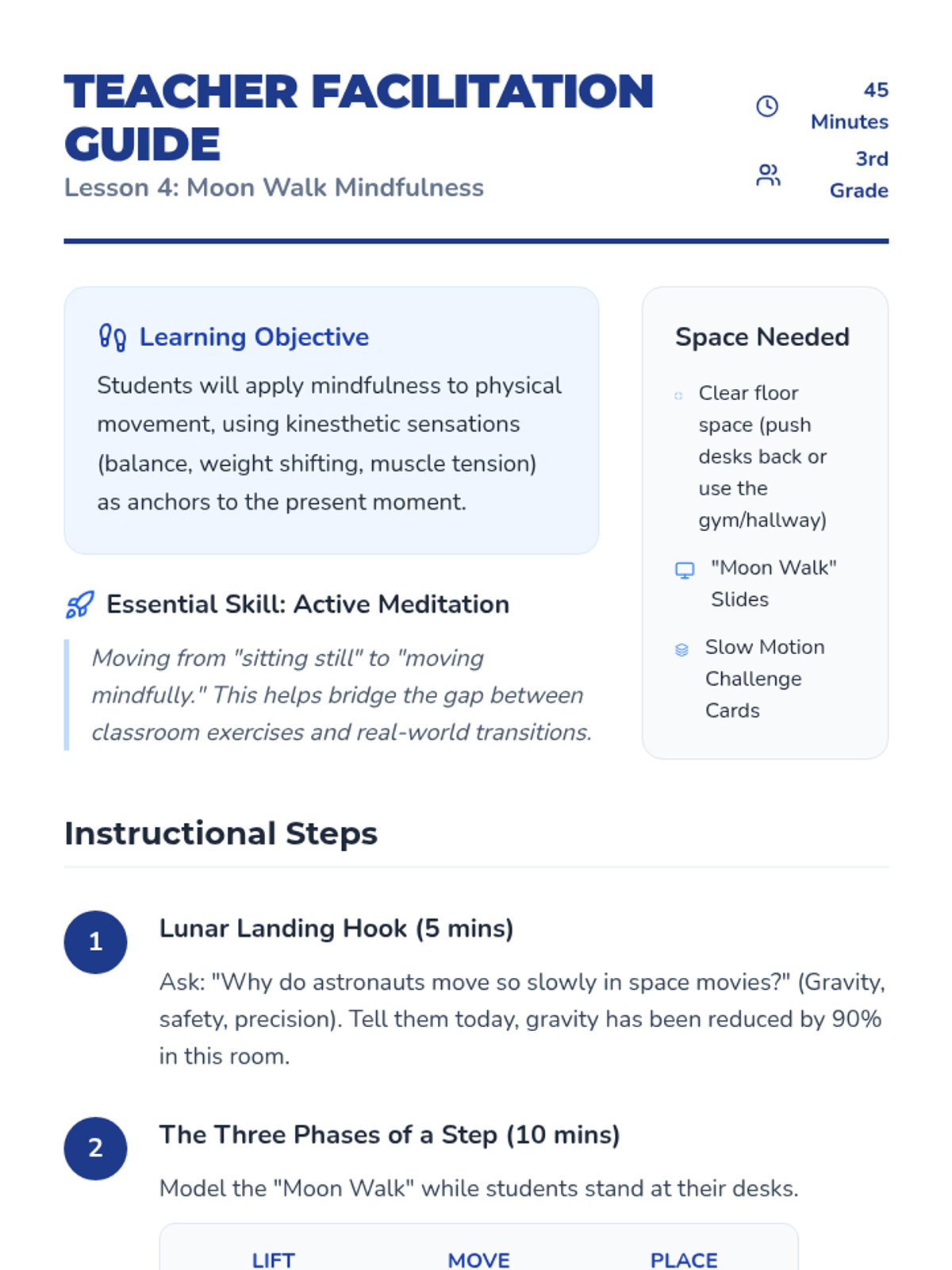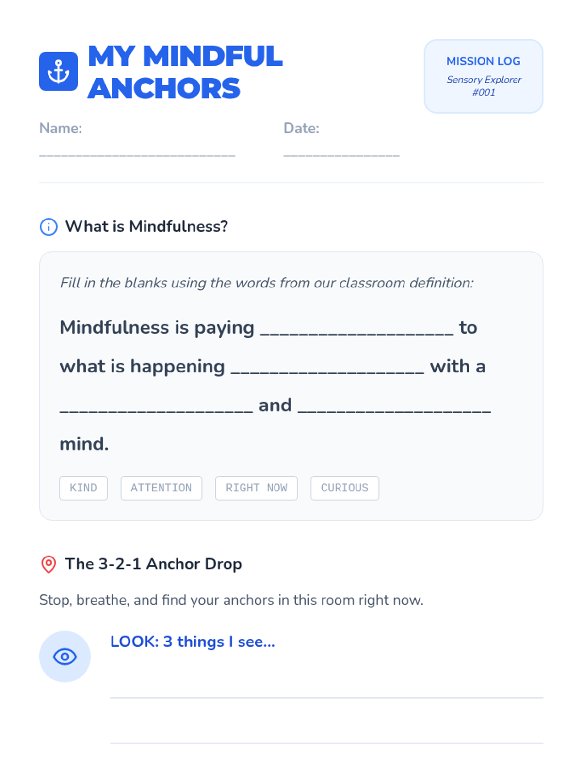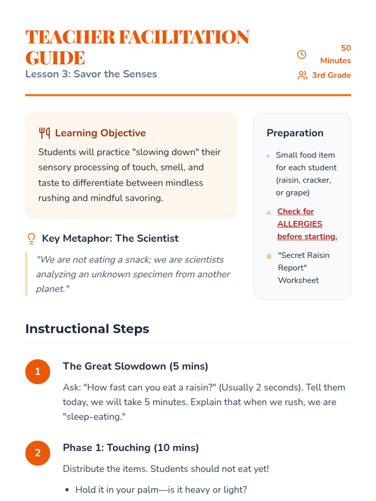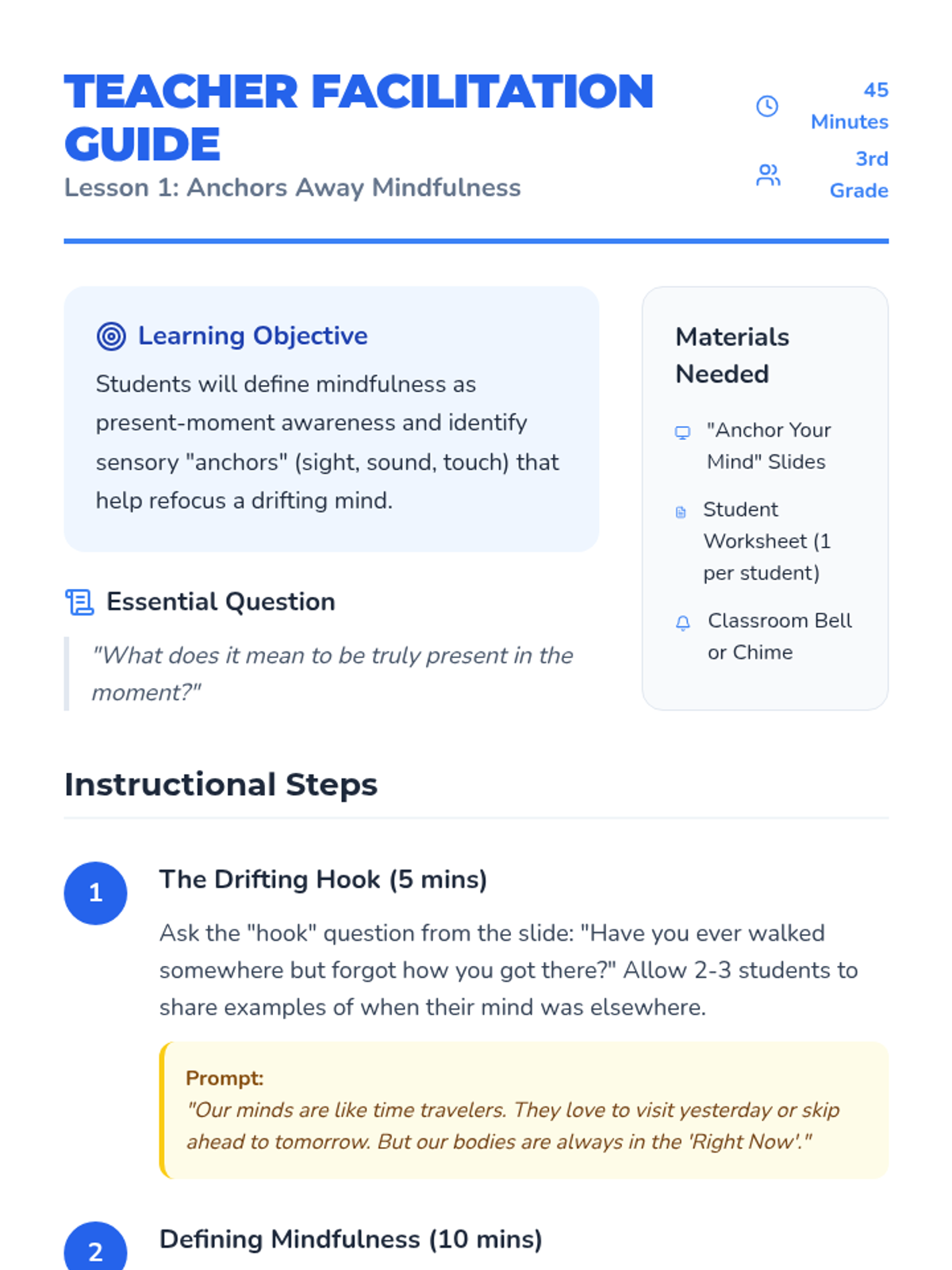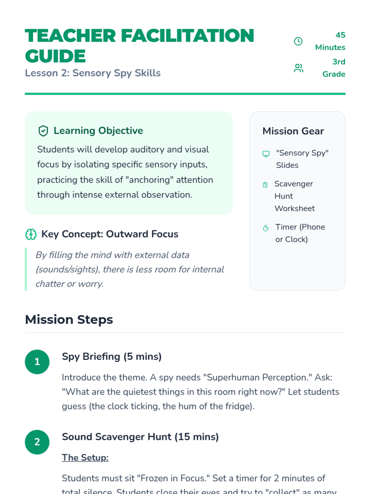 This 3rd-grade sequence teaches mindfulness through sensory awareness. Students learn to use their senses as 'anchors' to stay present, progressing from external observation (sight, sound, touch, taste) to internal metacognition (observing thoughts).