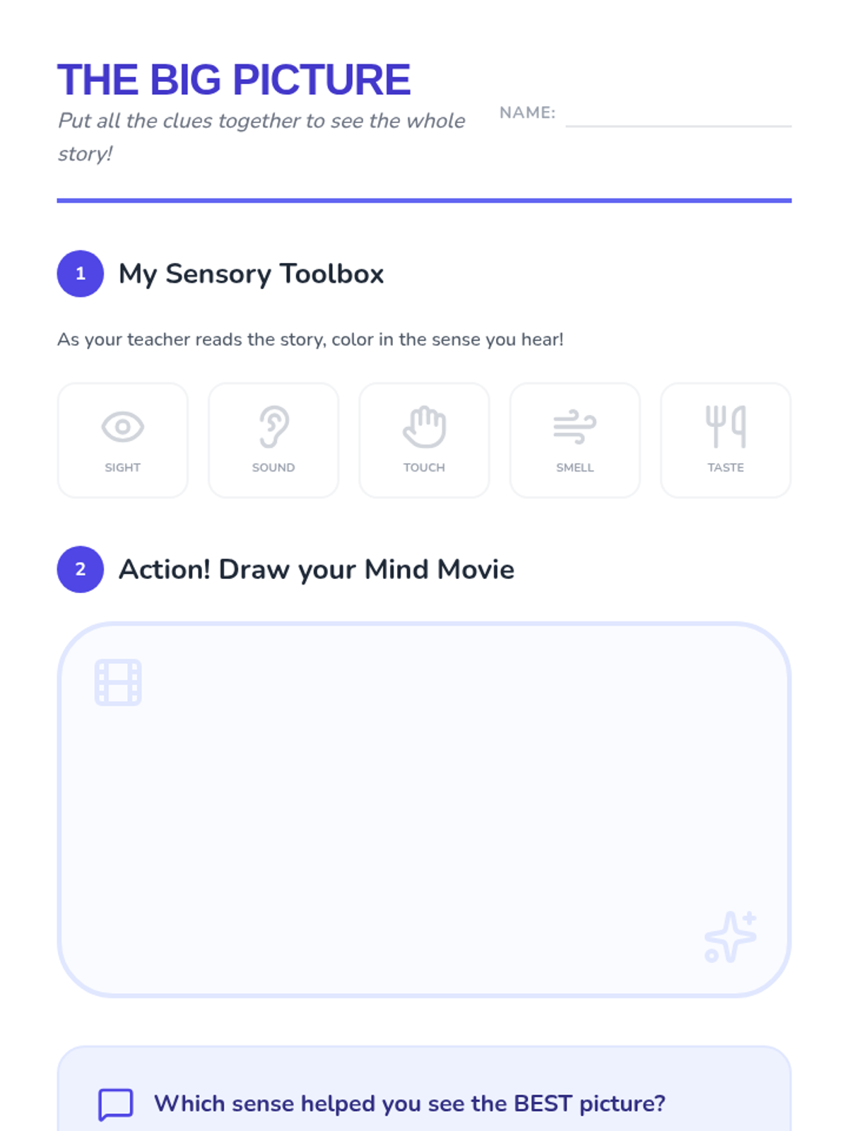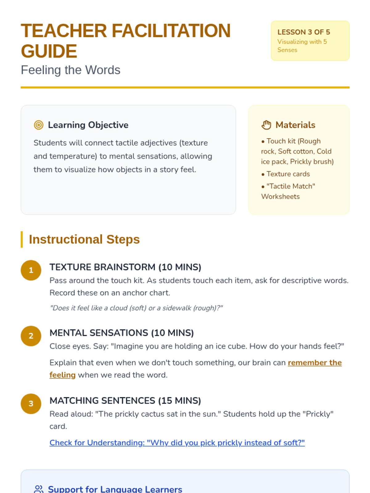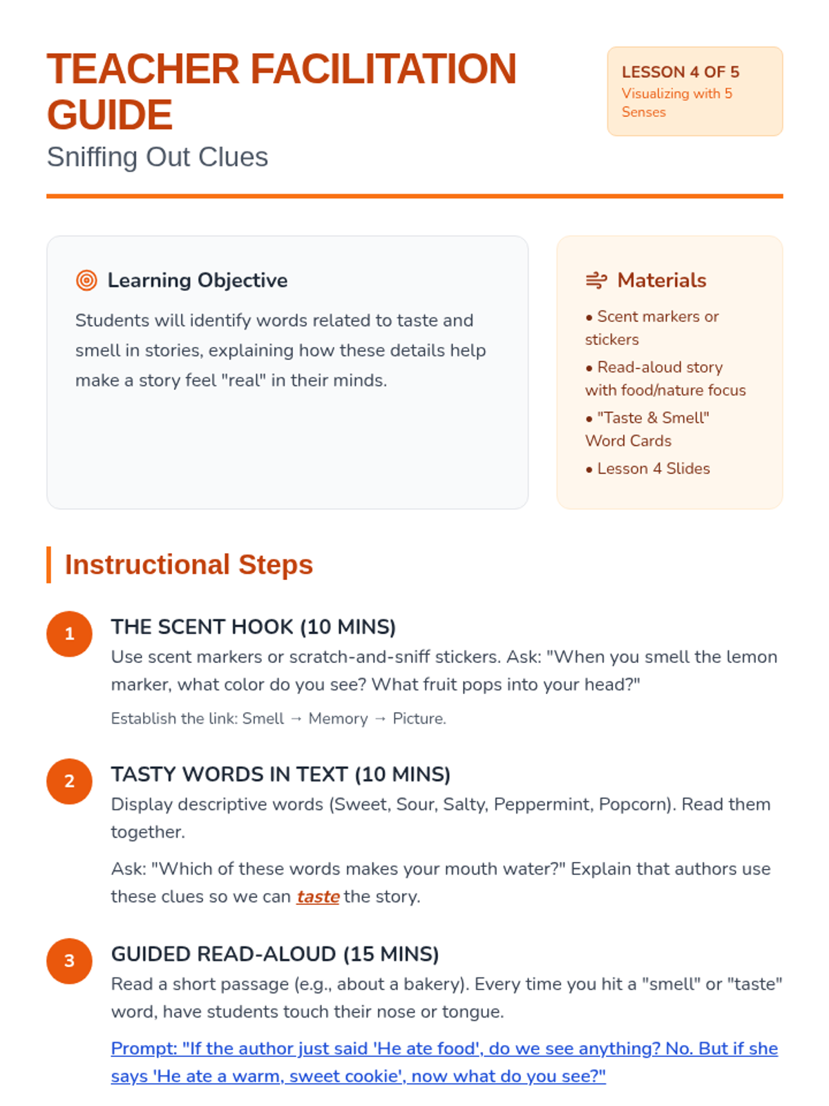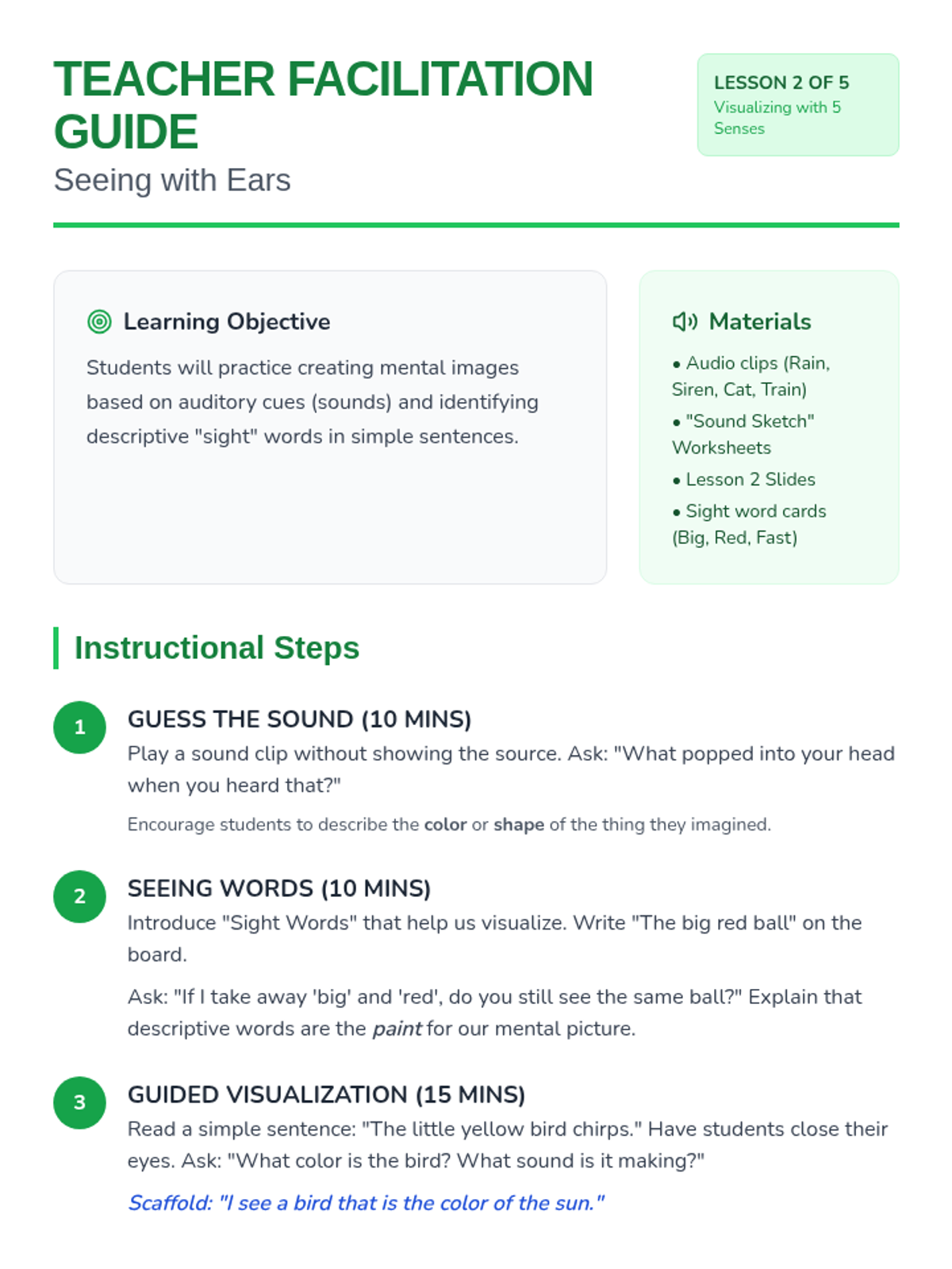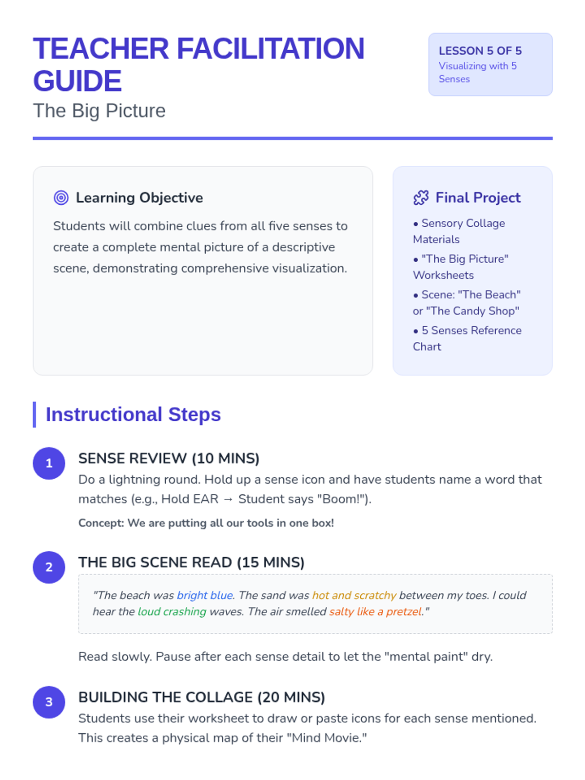 A foundational sequence for 1st-grade students needing academic support to develop visualization skills by anchoring mental imagery in the five senses. Students move from concrete sensory experiences to abstract text-based visualization.