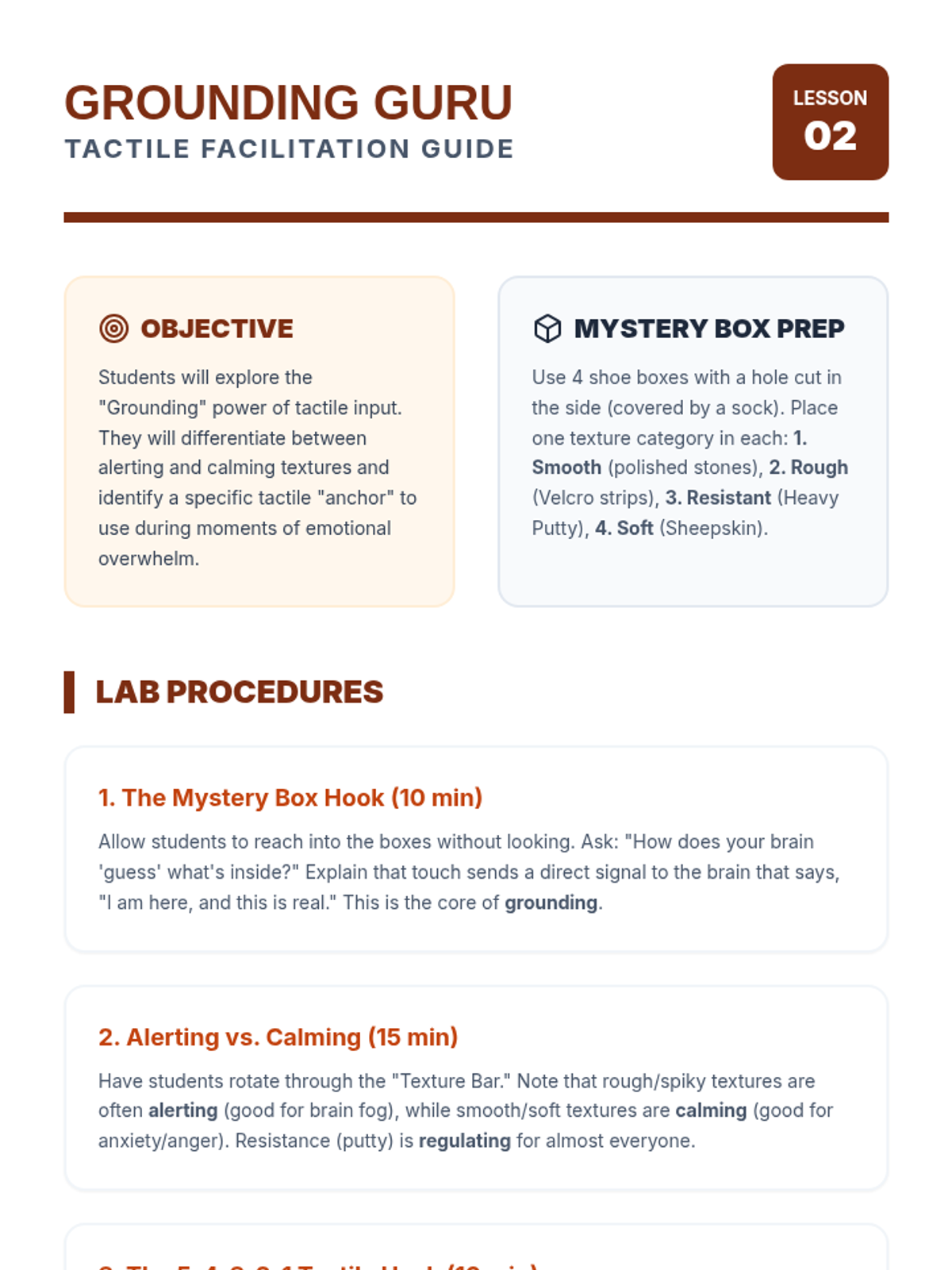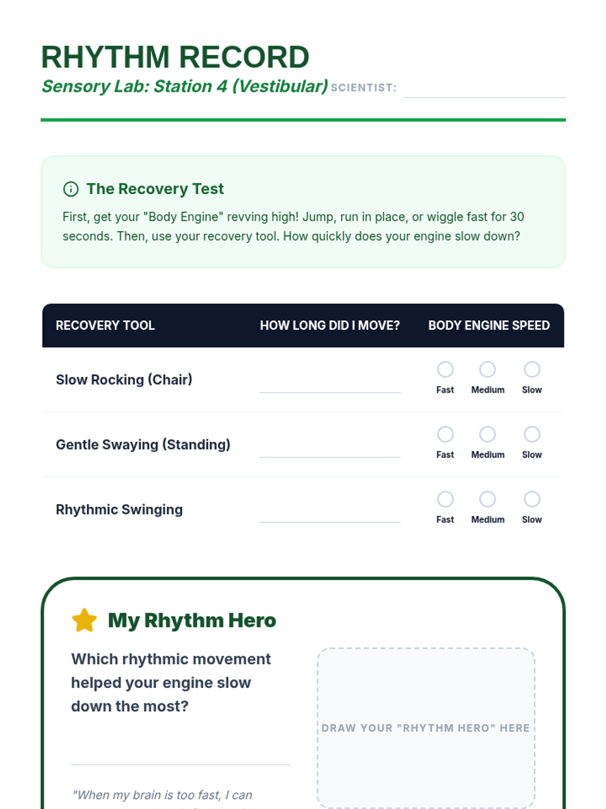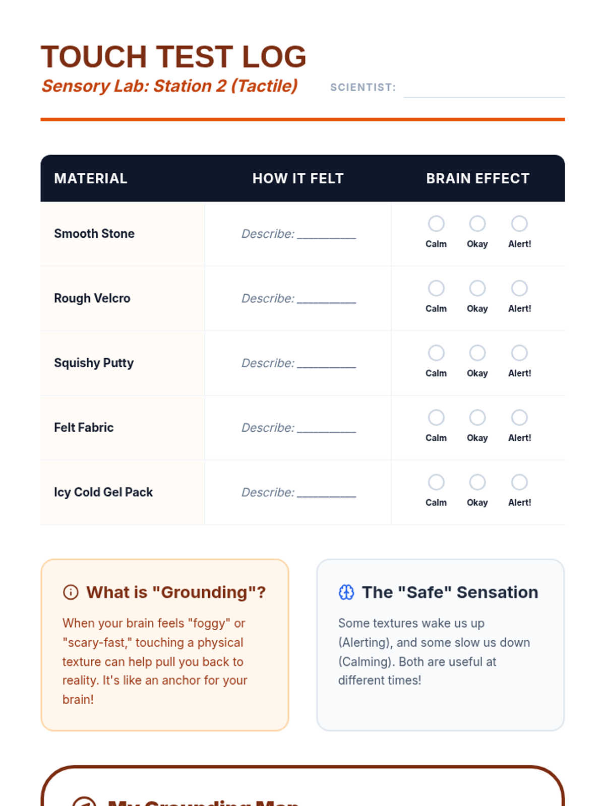 An inquiry-based laboratory experience where 3rd-grade students experiment with auditory, tactile, visual, and vestibular inputs to discover personalized tools for sensory regulation and dysregulation recovery.