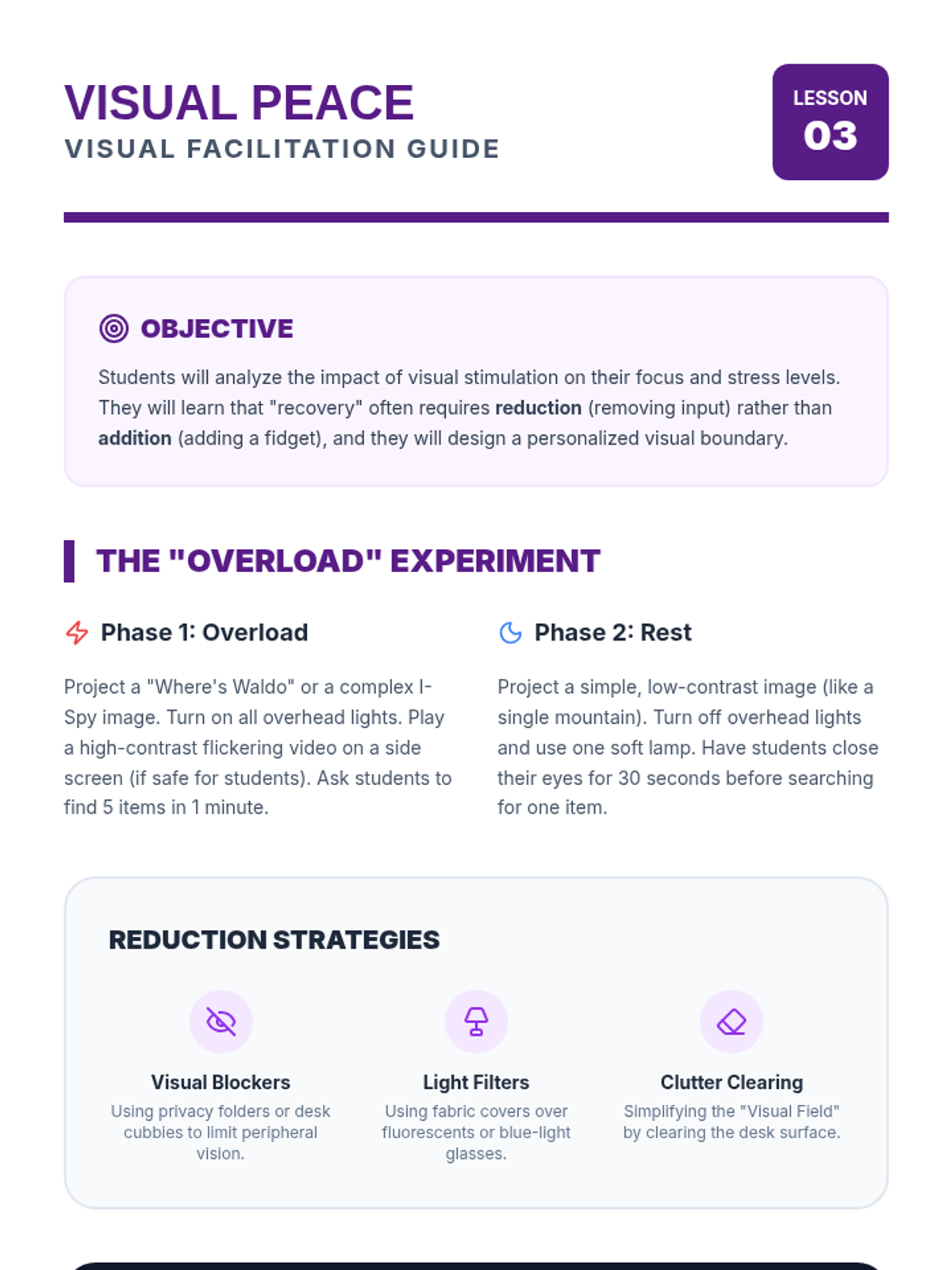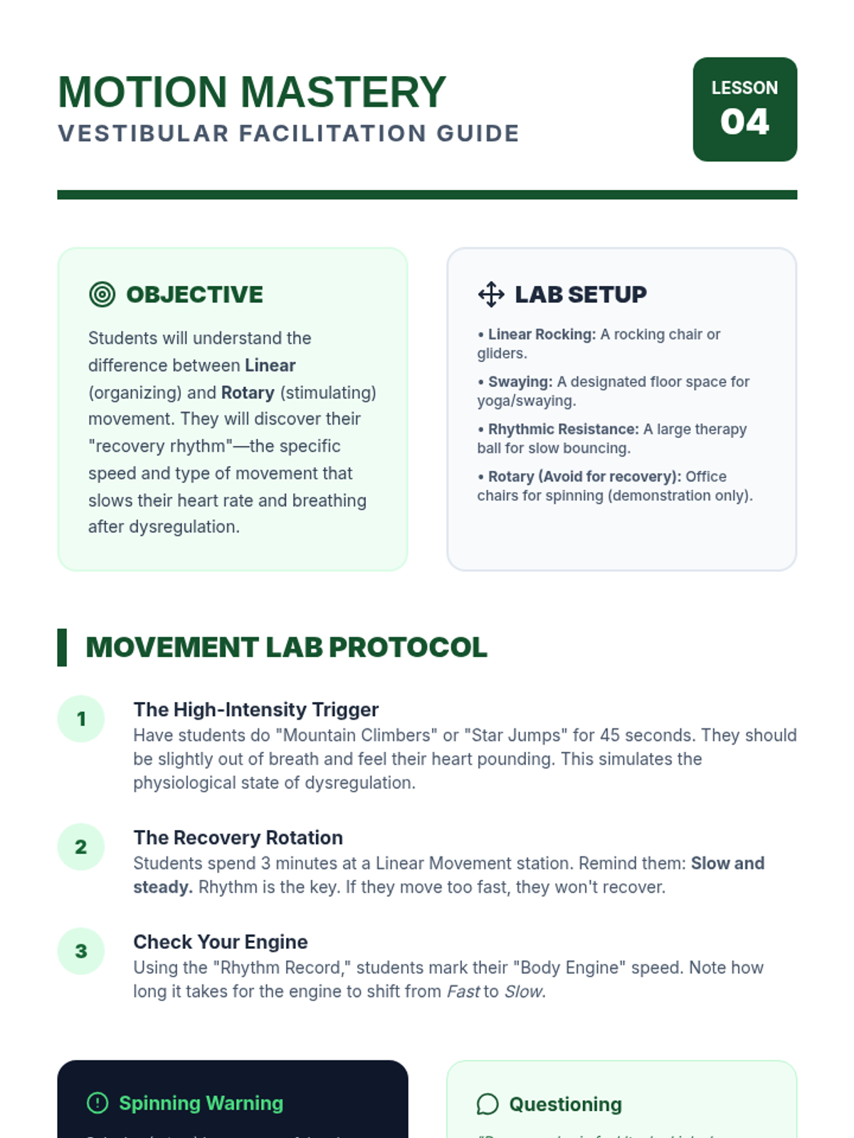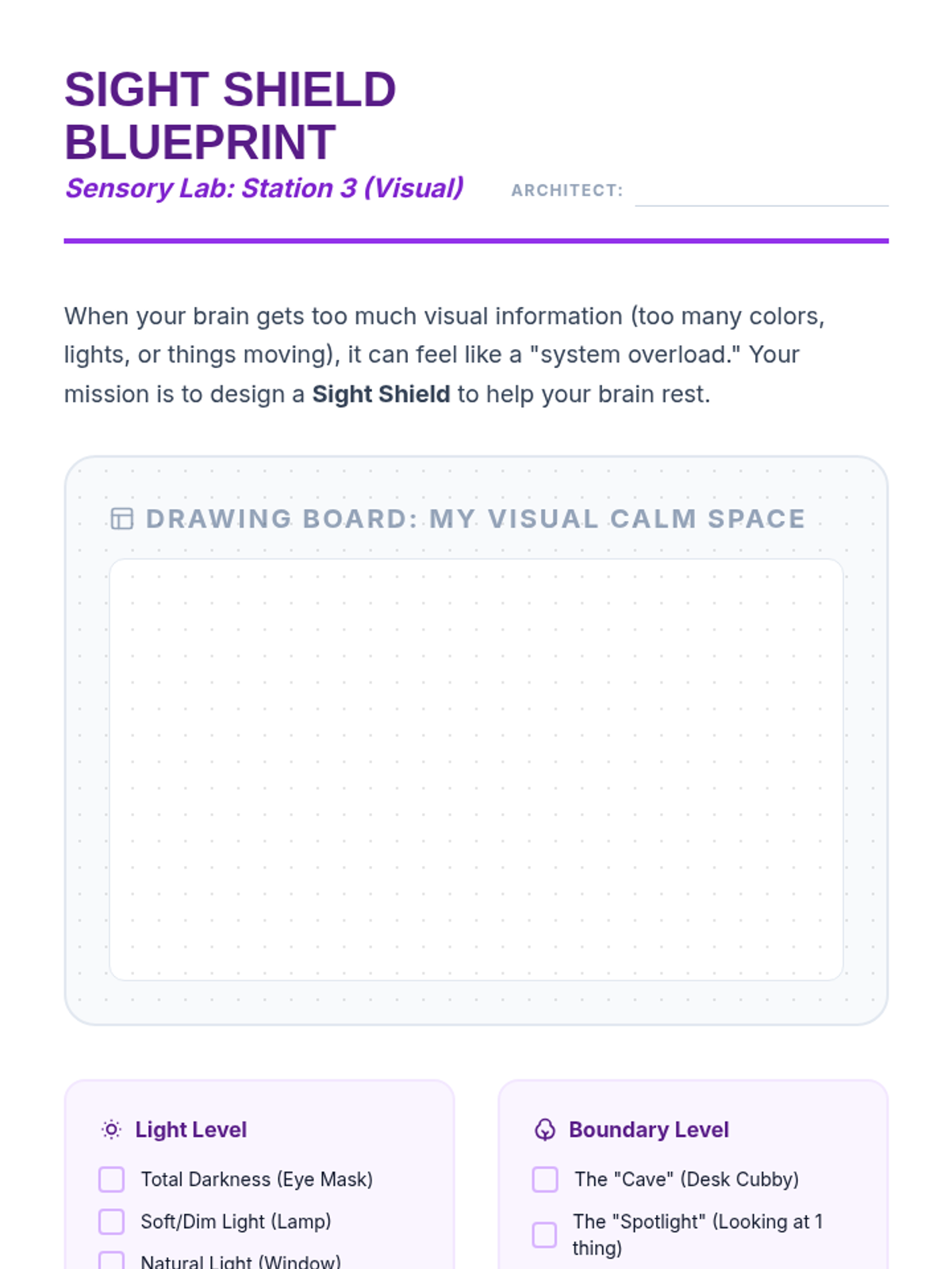 An inquiry-based laboratory experience where 3rd-grade students experiment with auditory, tactile, visual, and vestibular inputs to discover personalized tools for sensory regulation and dysregulation recovery.