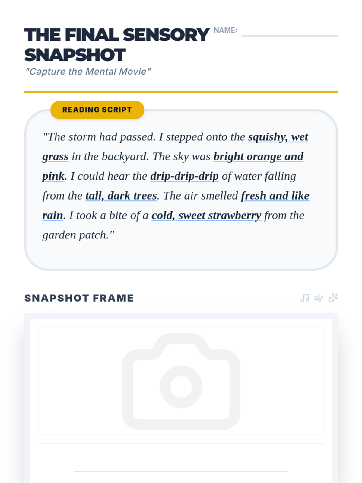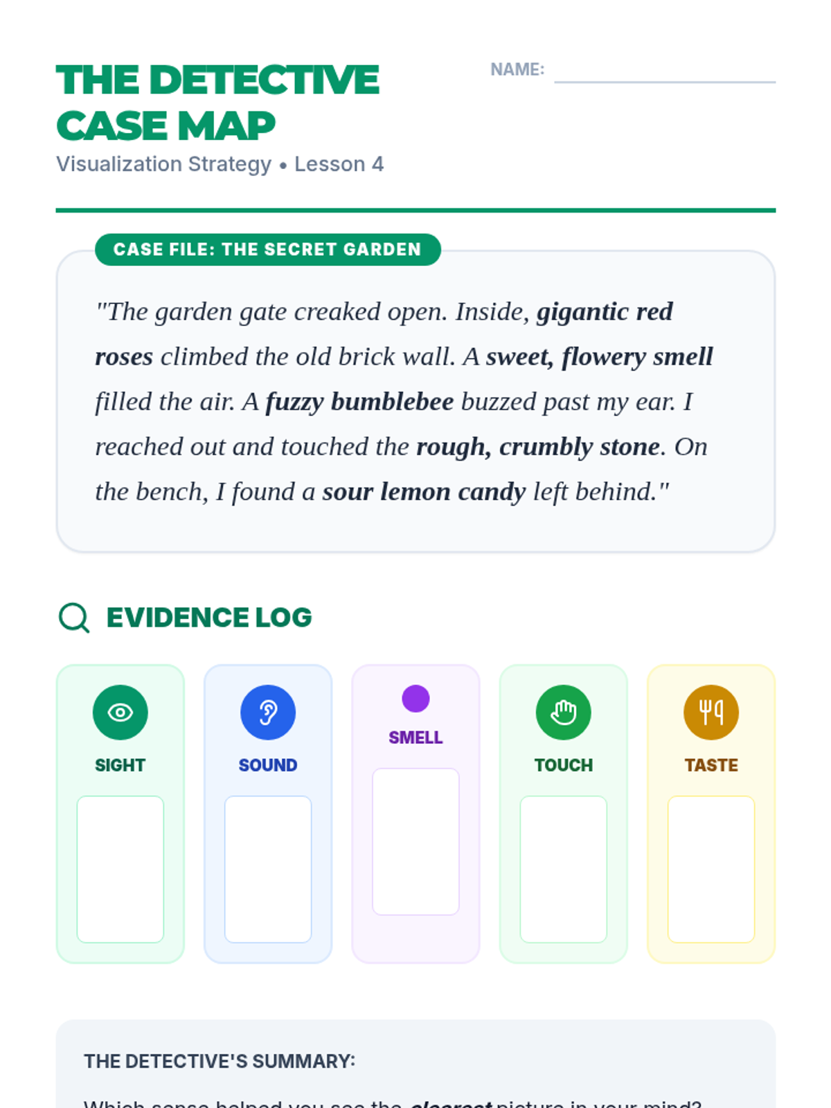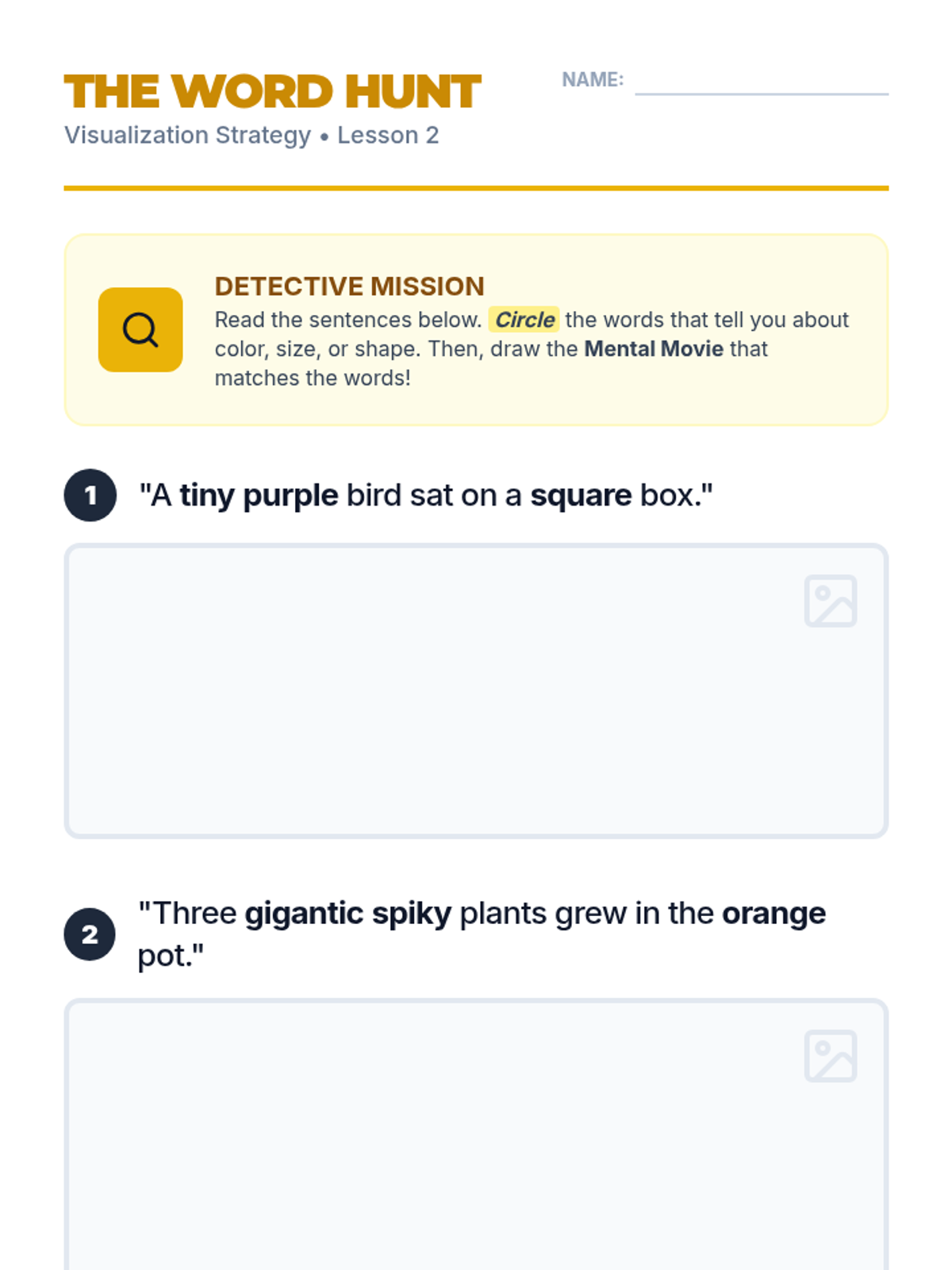 This sequence introduces 2nd-grade students to visualization strategies by connecting sensory details in text to 'mental movies.' Students progress from simple visual imagery to multi-sensory mental pictures that support reading comprehension and recall.