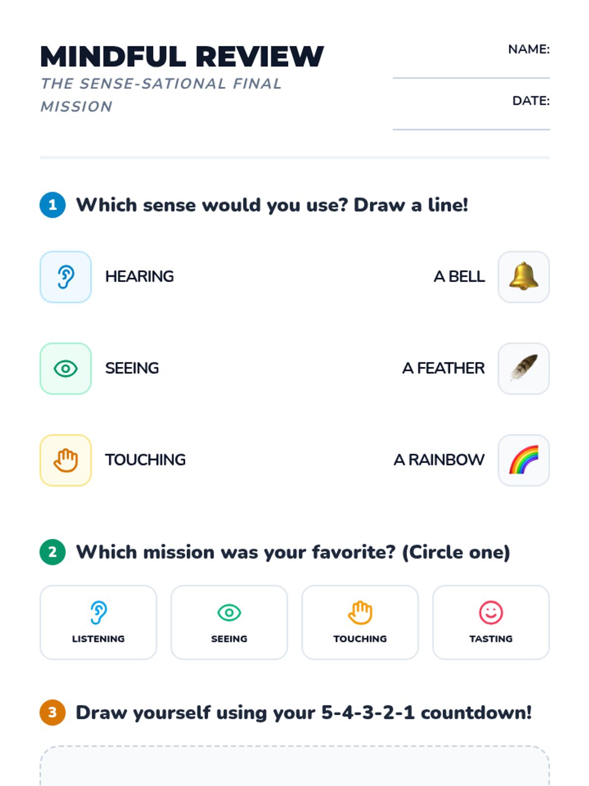 A mindfulness sequence for 1st graders focused on sensory processing. Students learn to anchor themselves in the present moment through sight, sound, and touch, moving from internal thoughts to external observations using the 5-4-3-2-1 grounding technique.