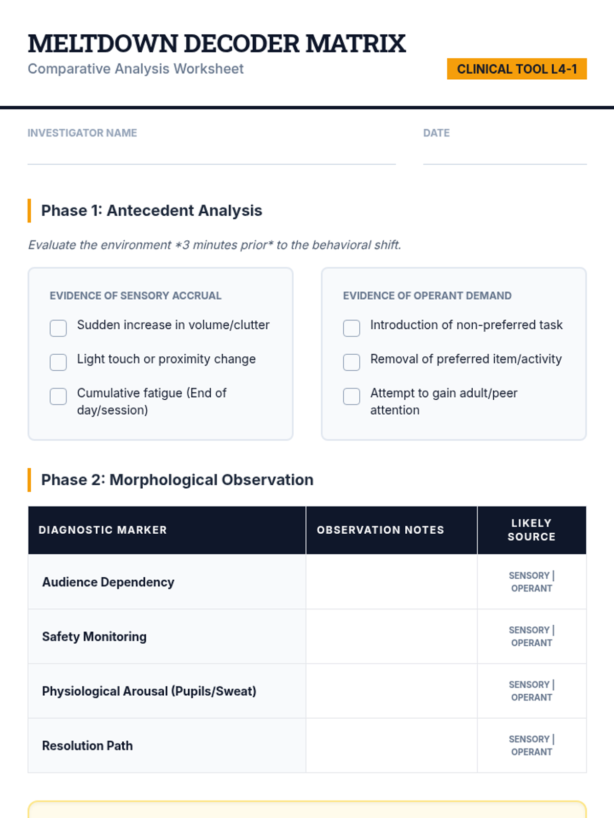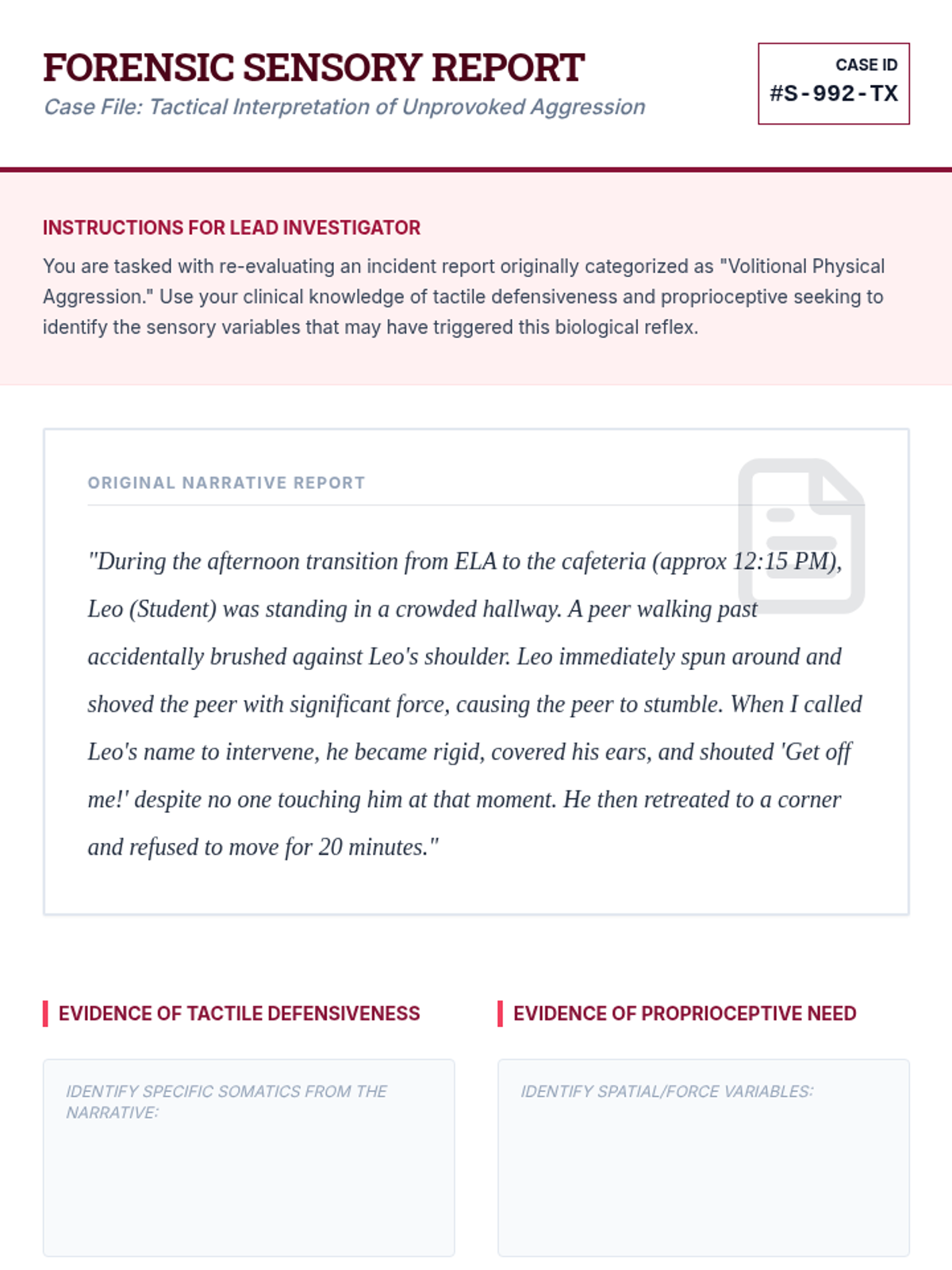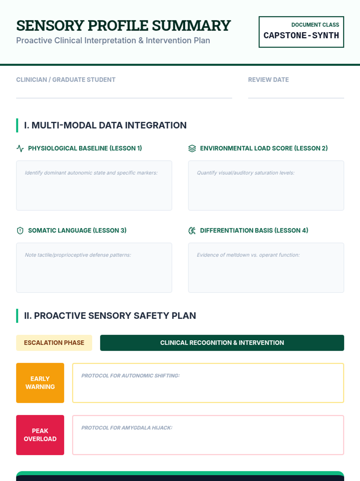 An advanced graduate-level sequence exploring the neurobiological mechanisms of sensory overload, focusing on identification through physiological markers, environmental analysis, and behavioral differentiation. Students will move from theory to practical clinical application for neurodivergent populations.