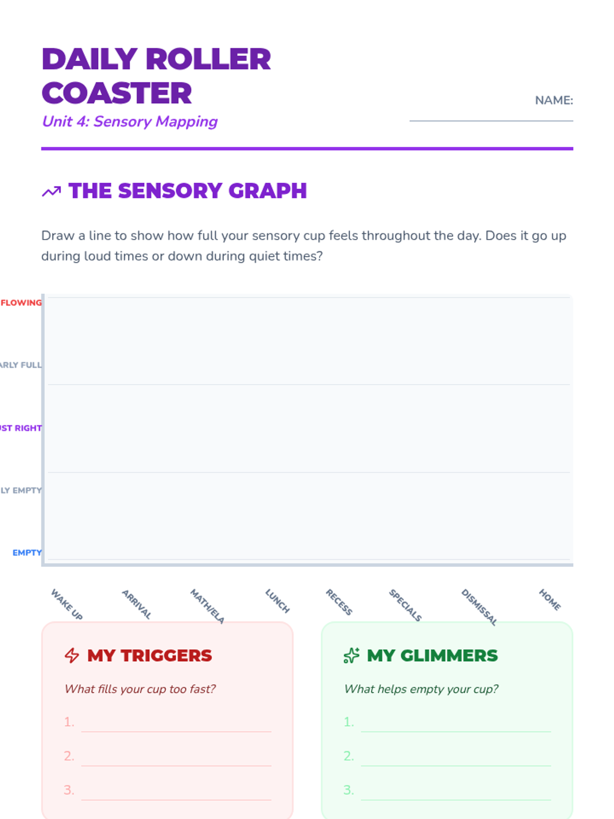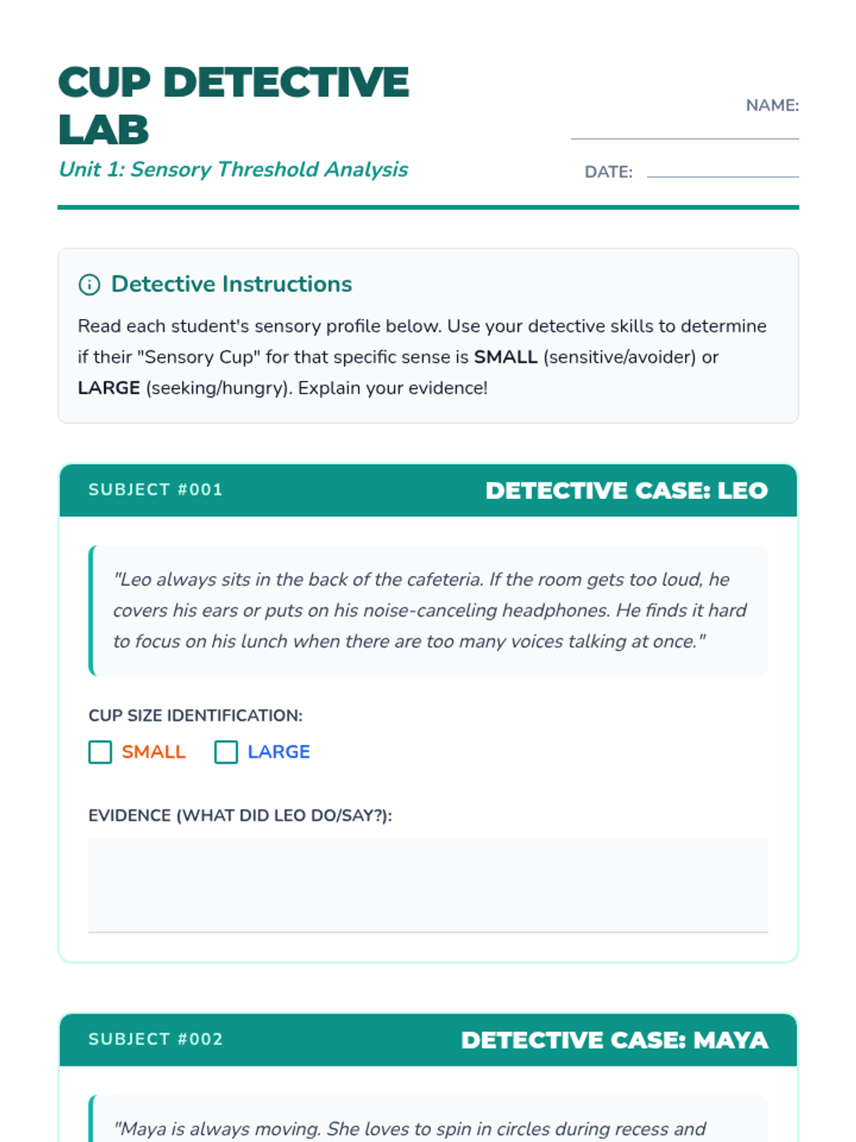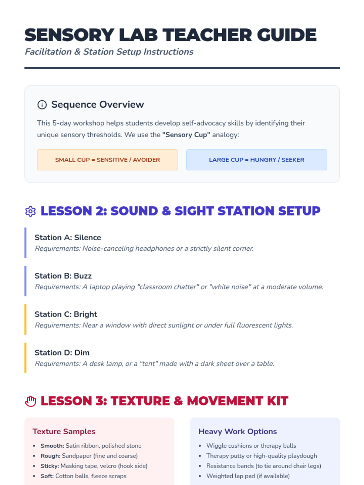 A workshop-style sequence for 4th graders to explore their unique sensory thresholds and preferences. Using the 'Sensory Cup' analogy, students investigate their reactions to auditory, visual, tactile, and proprioceptive inputs to develop a personalized sensory profile.