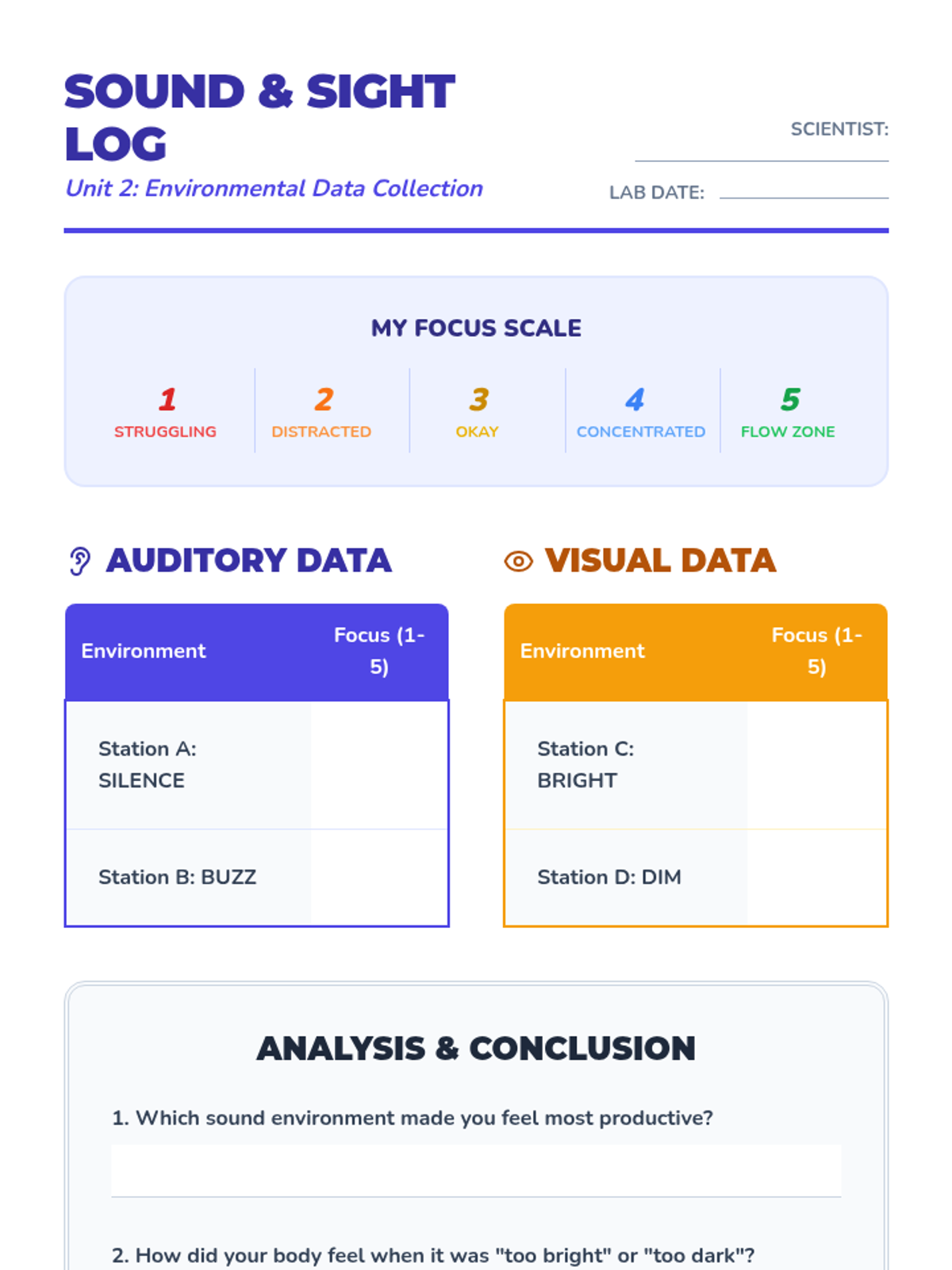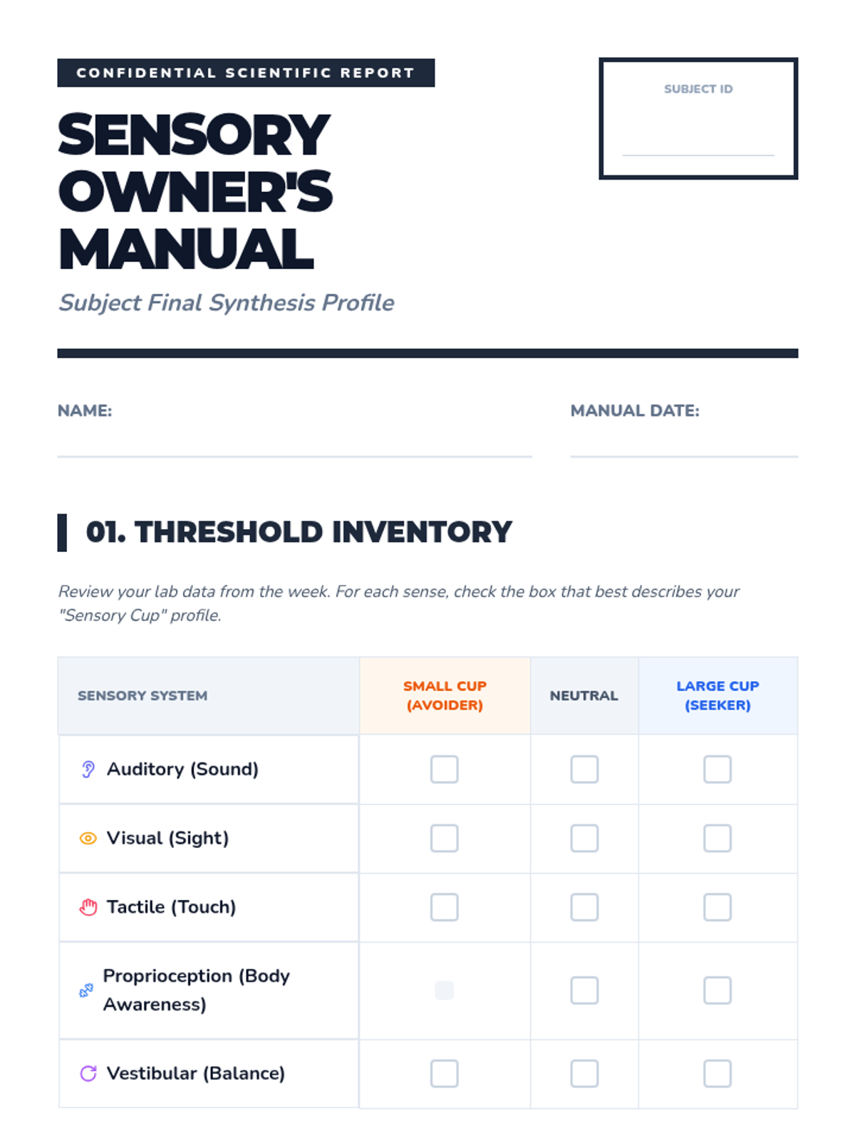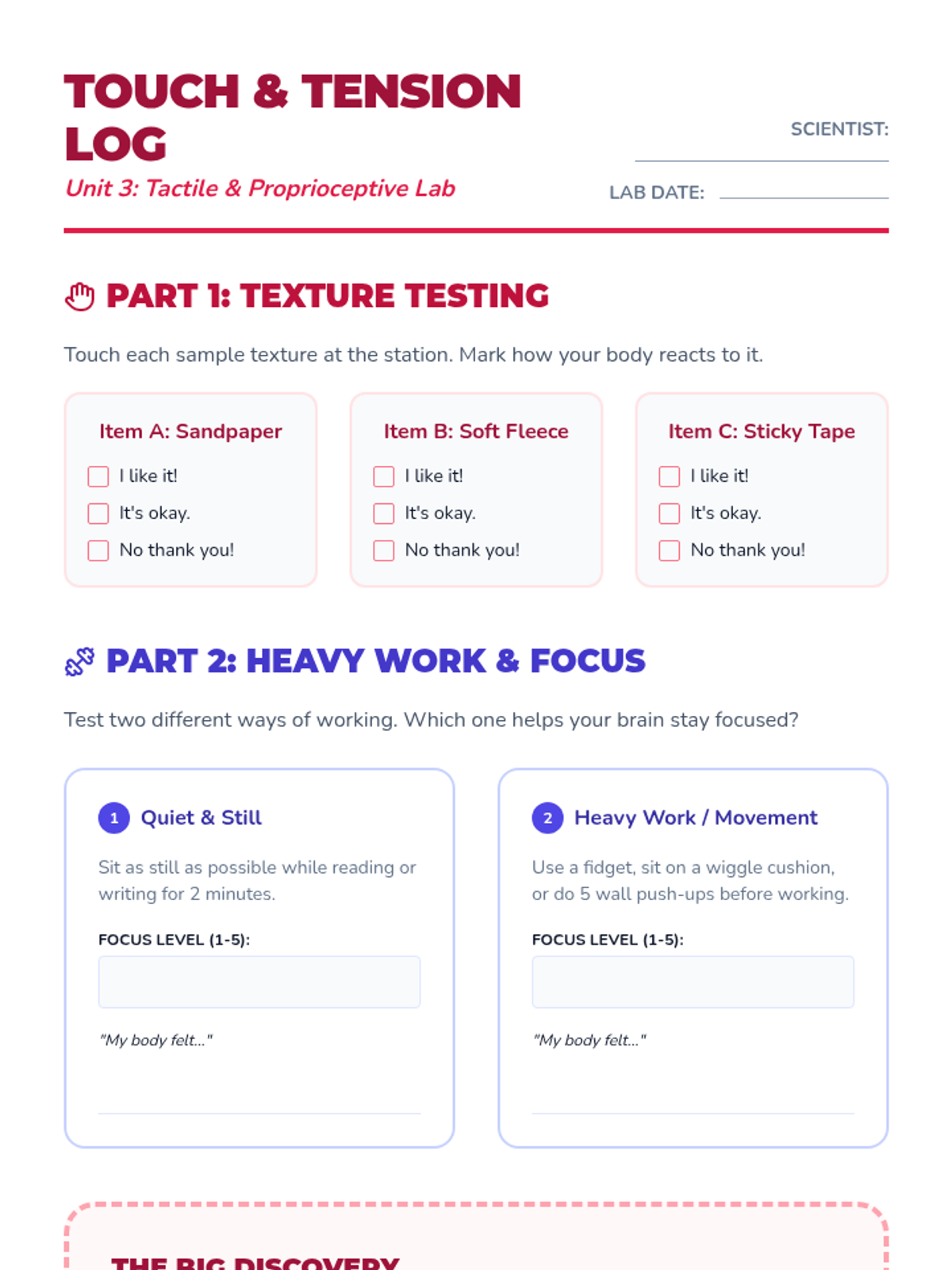 A workshop-style sequence for 4th graders to explore their unique sensory thresholds and preferences. Using the 'Sensory Cup' analogy, students investigate their reactions to auditory, visual, tactile, and proprioceptive inputs to develop a personalized sensory profile.