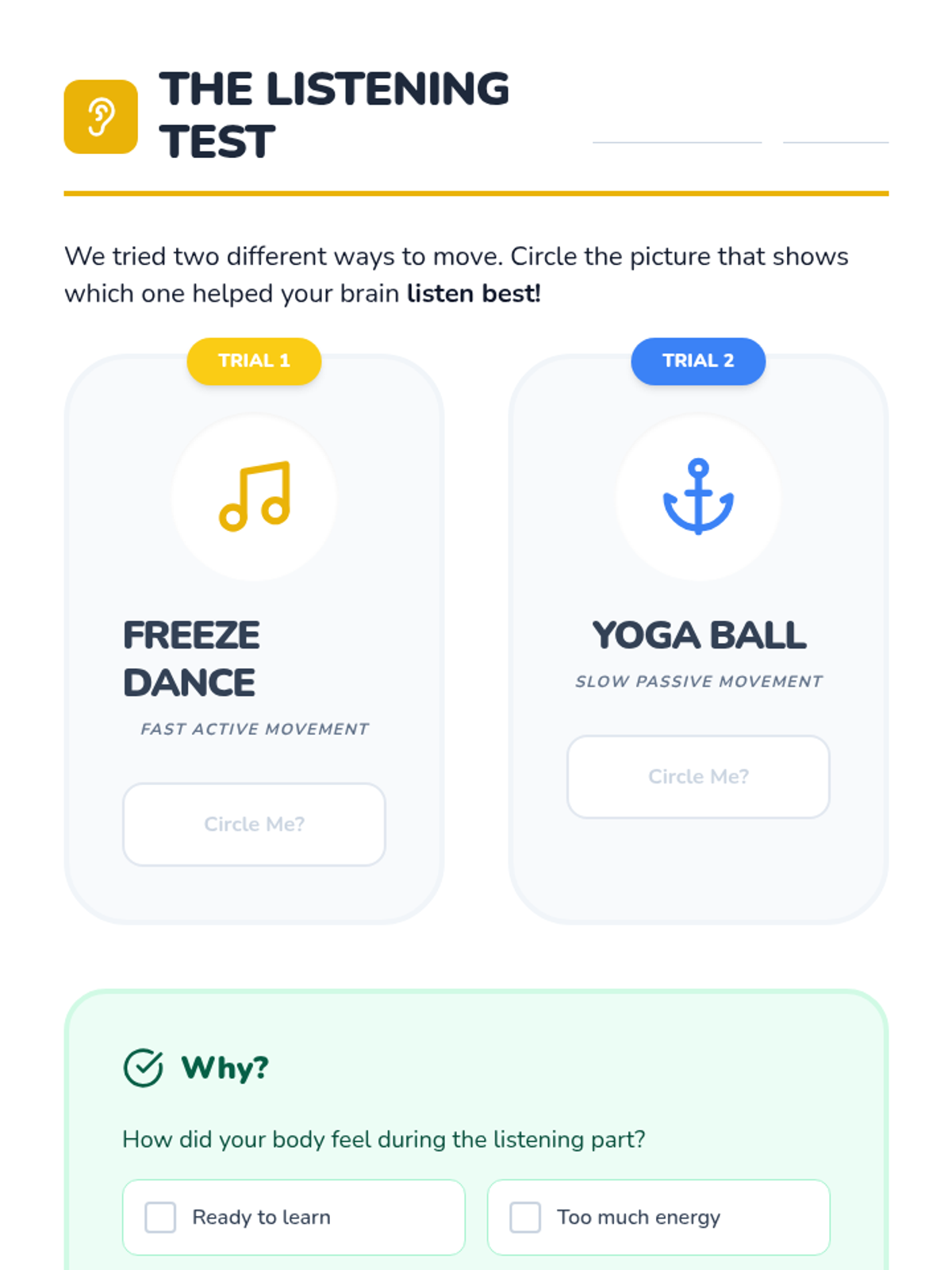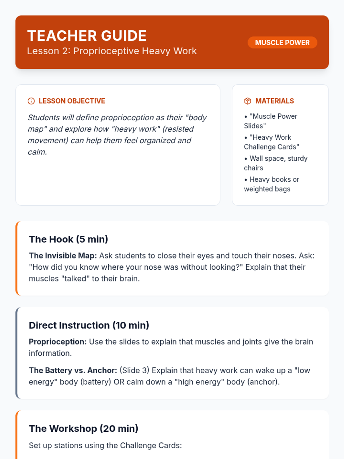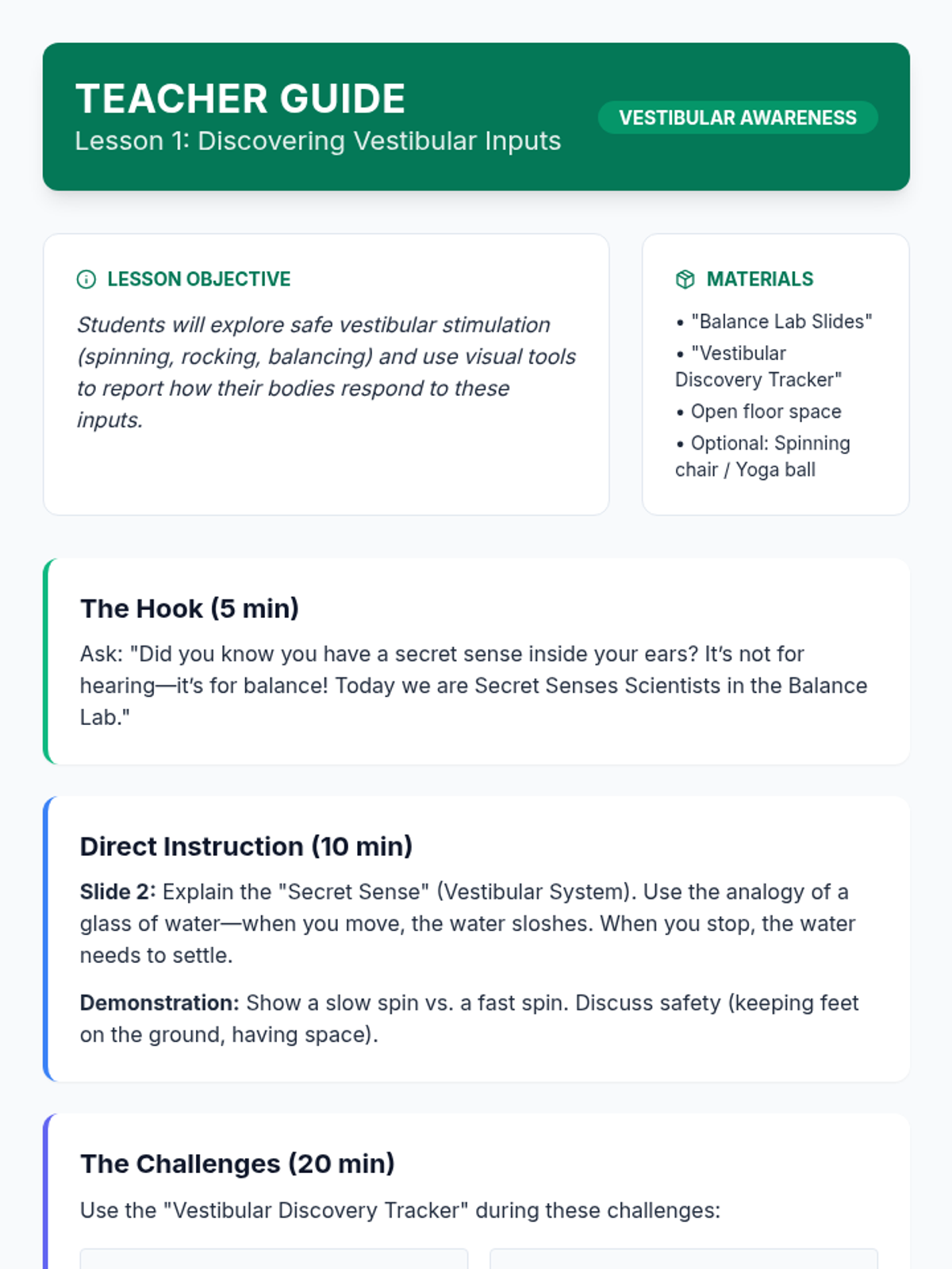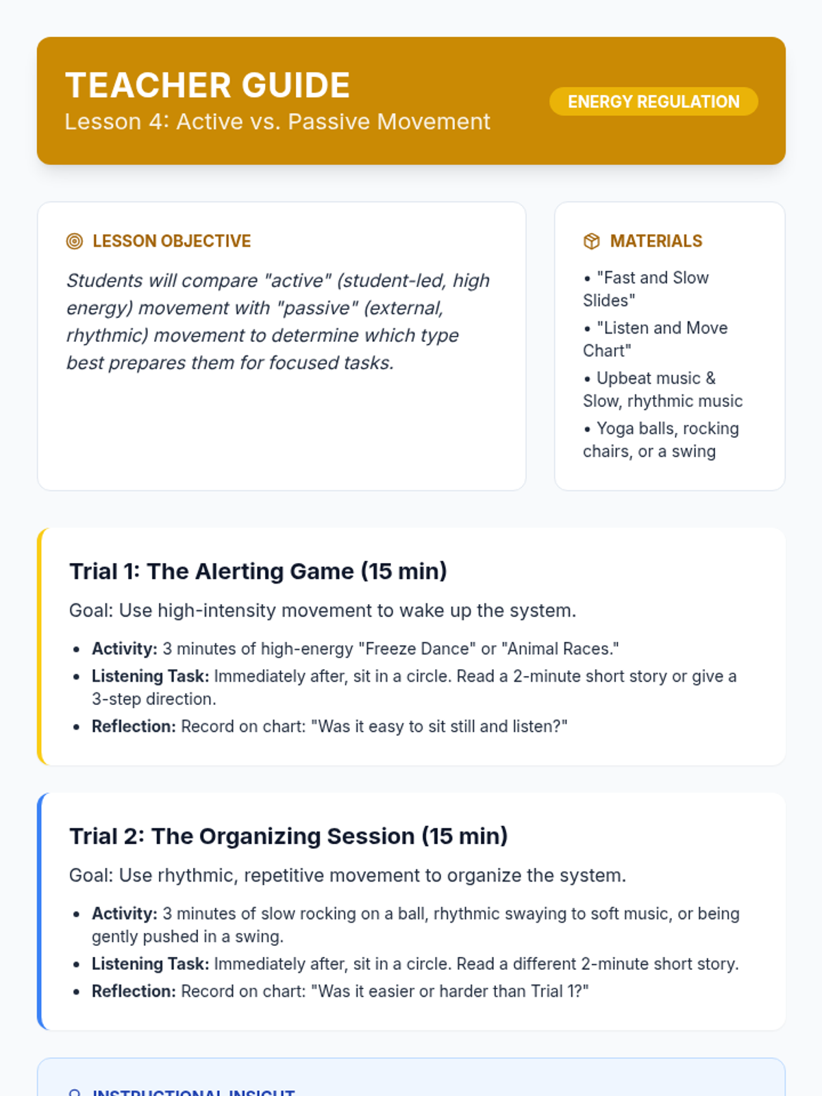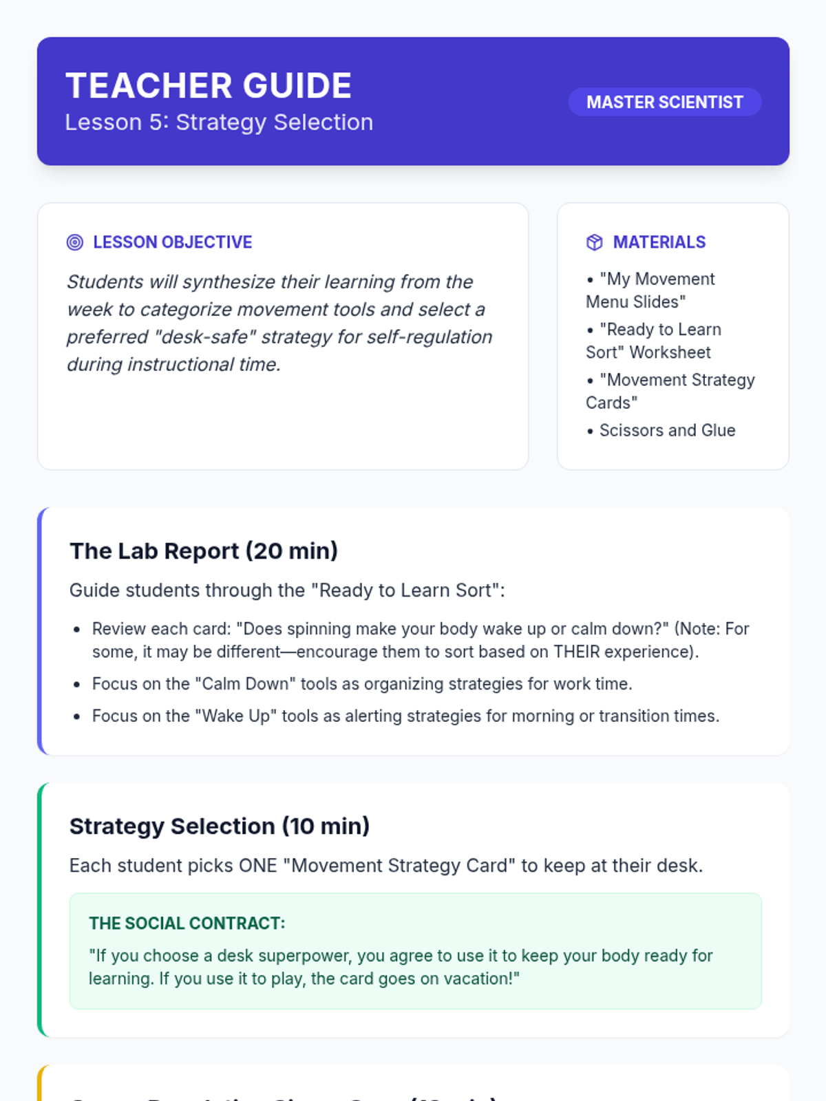 A 5-lesson sequence for 1st-grade students focusing on identifying vestibular and proprioceptive sensory preferences. Students explore movement, heavy work, and spatial awareness to determine which strategies help them stay regulated and 'ready to learn'.