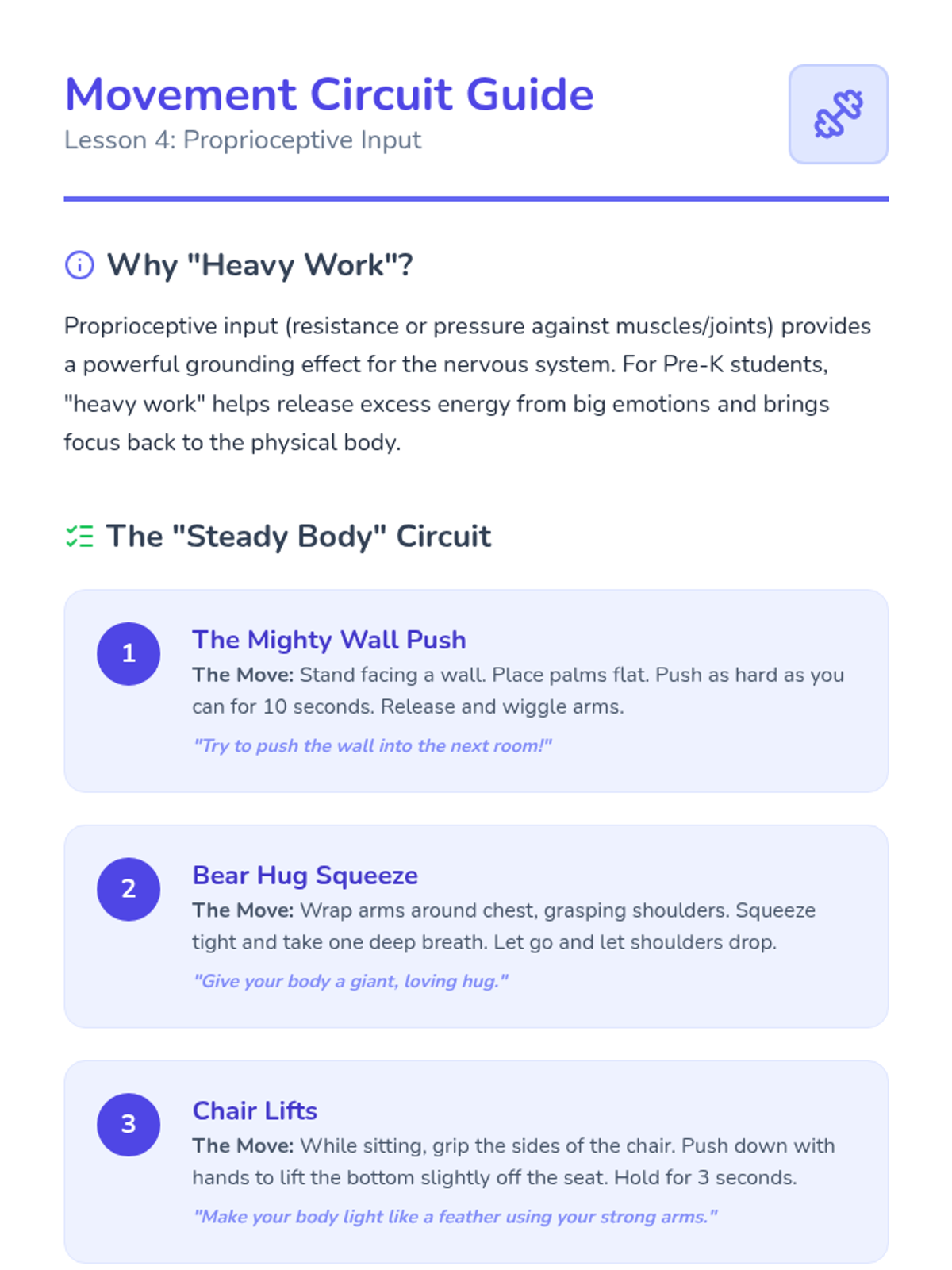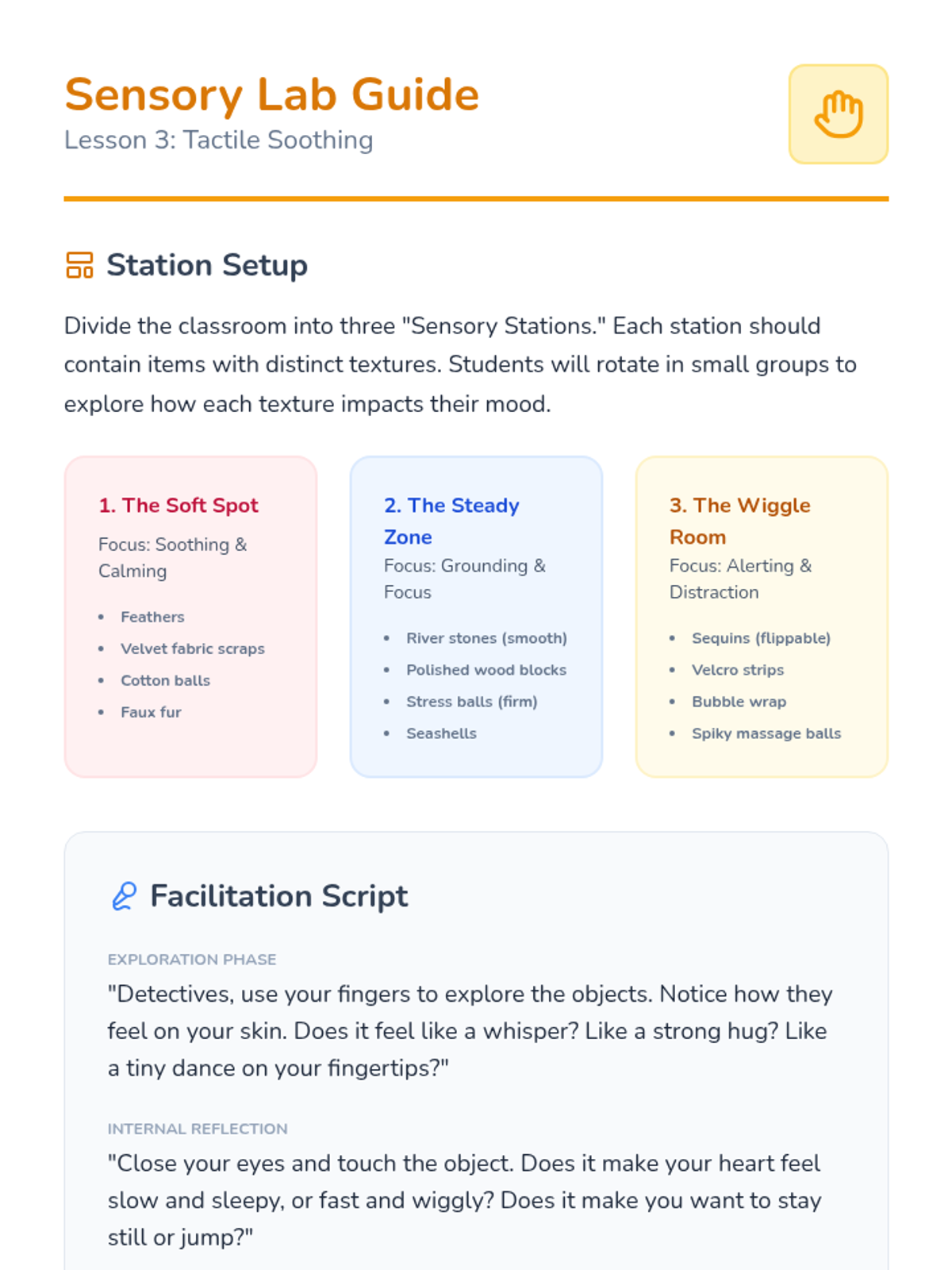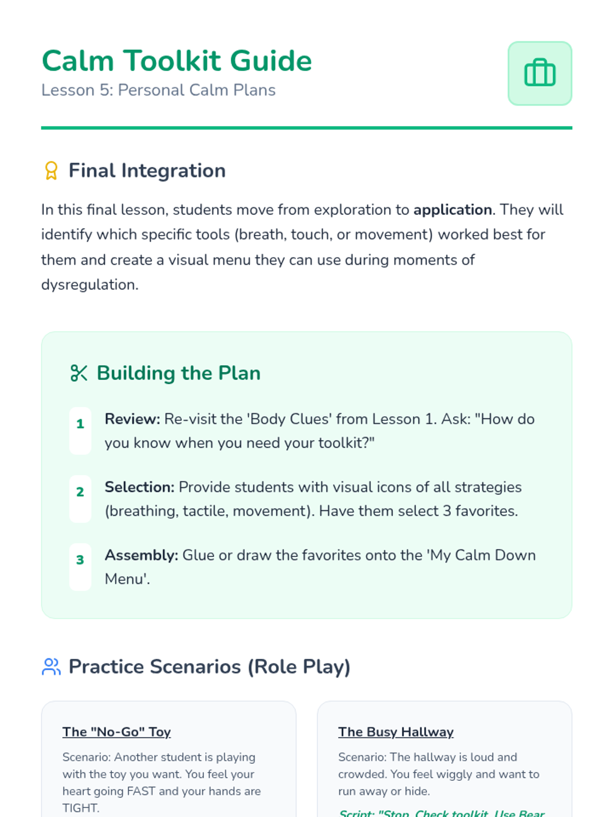 A 5-lesson sequence for Pre-K students to learn interoception, deep breathing, tactile soothing, and proprioceptive grounding. The sequence culminates in students creating a personalized 'Calm Down Plan' visual menu.