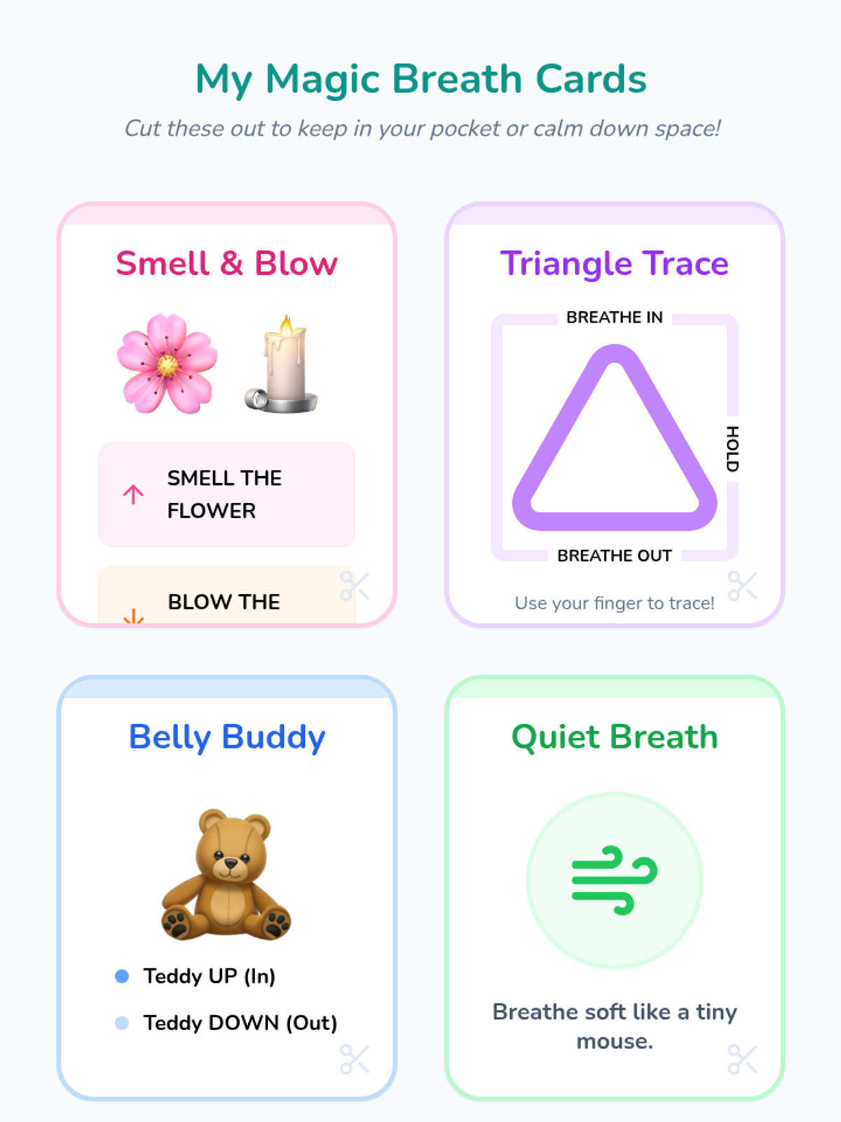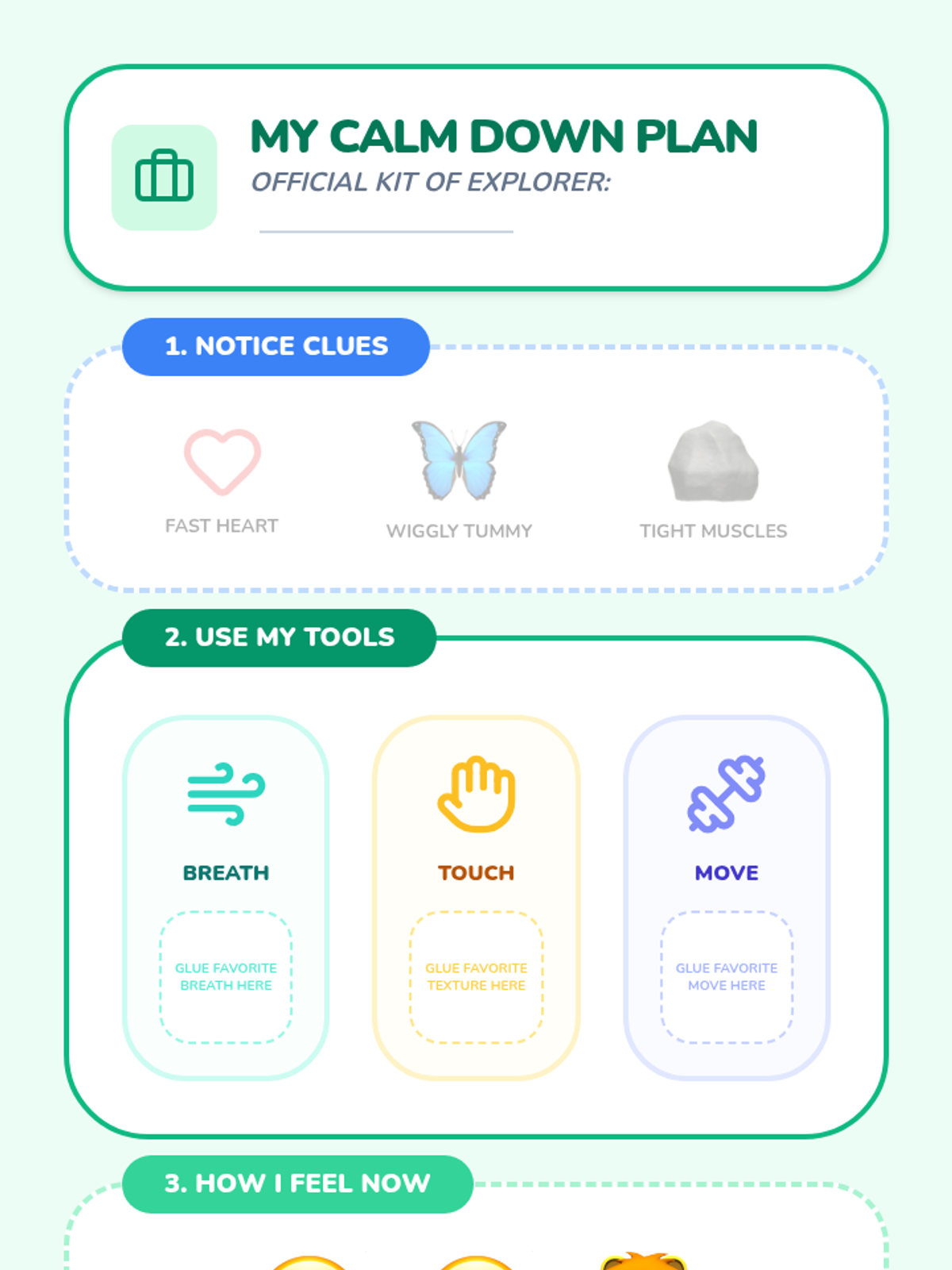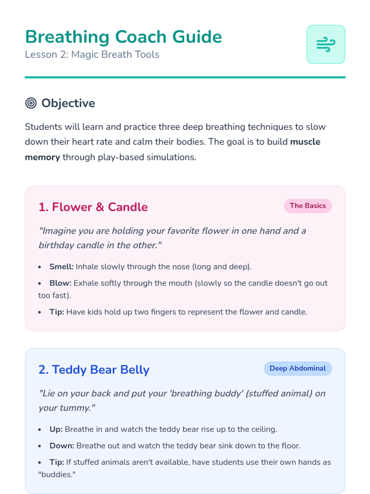A 5-lesson sequence for Pre-K students to learn interoception, deep breathing, tactile soothing, and proprioceptive grounding. The sequence culminates in students creating a personalized 'Calm Down Plan' visual menu.