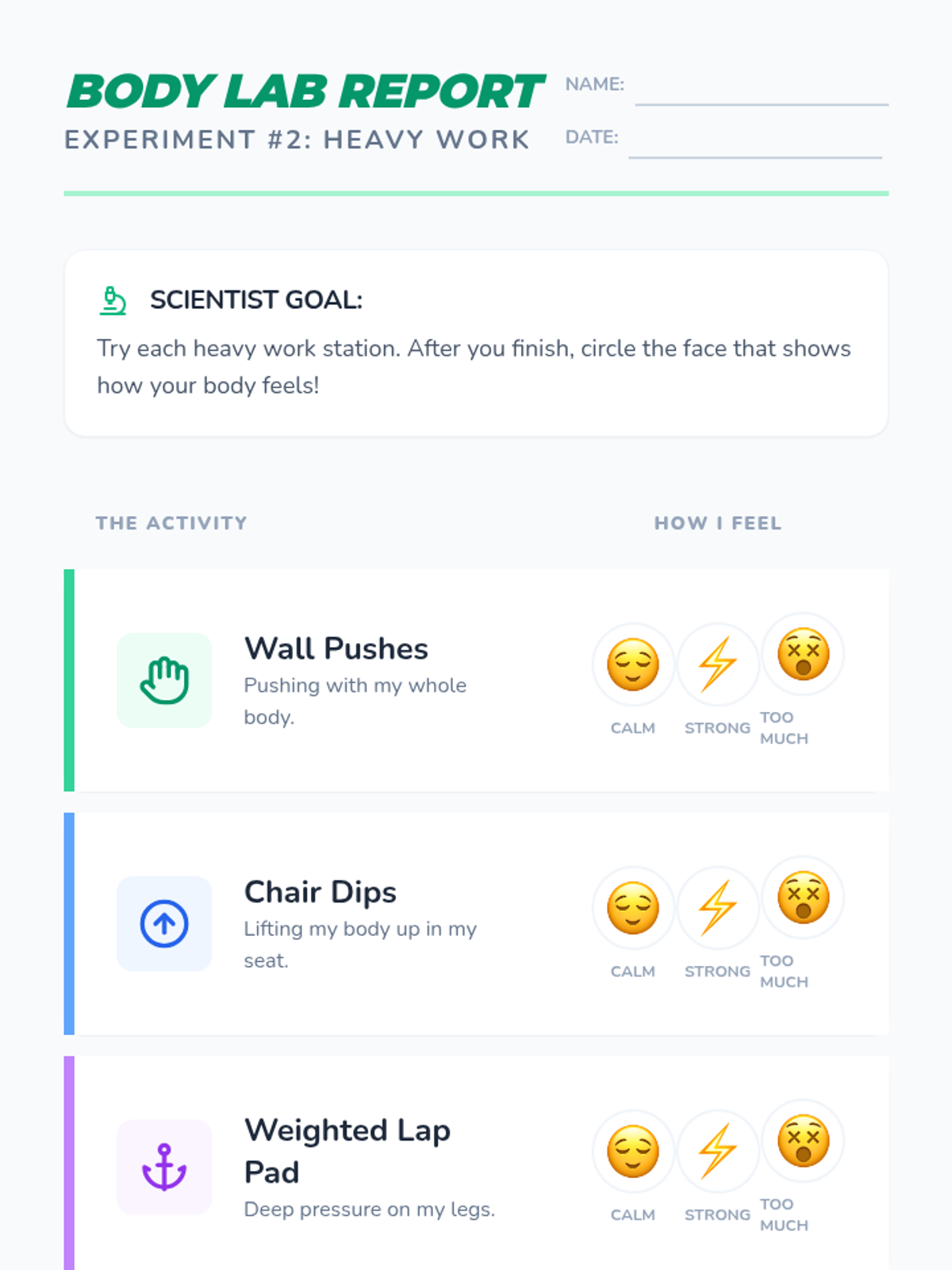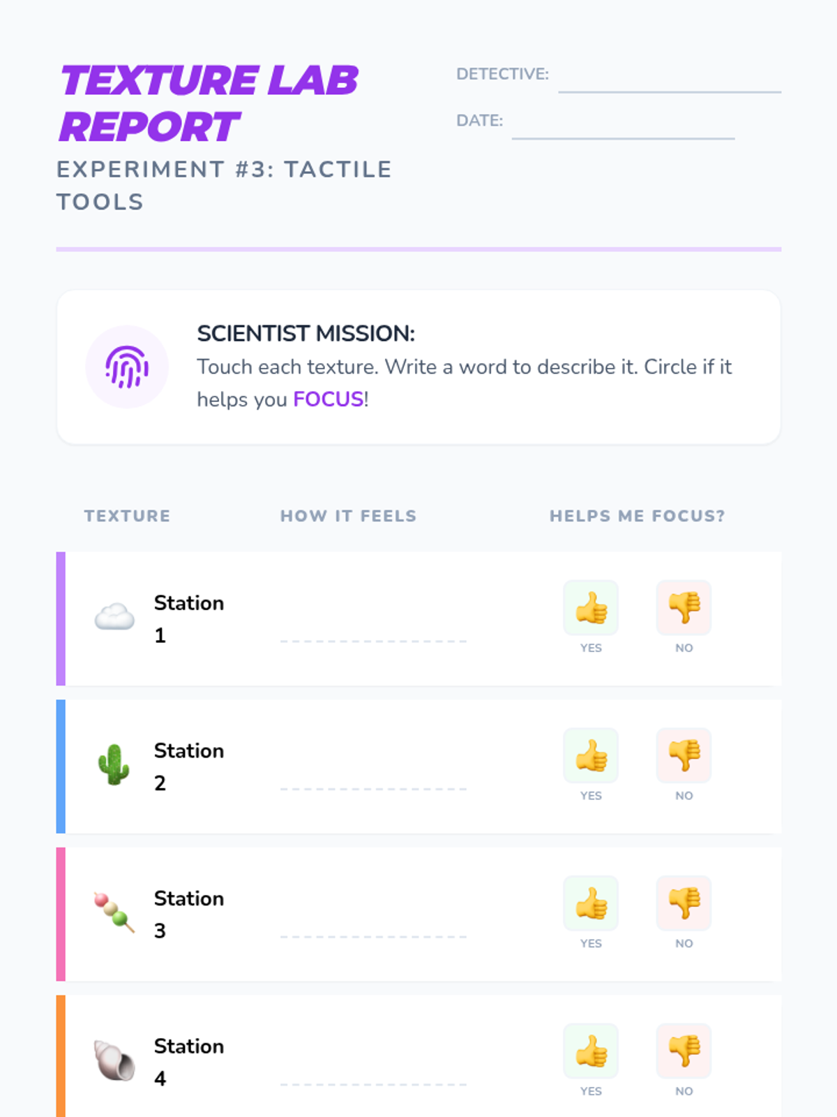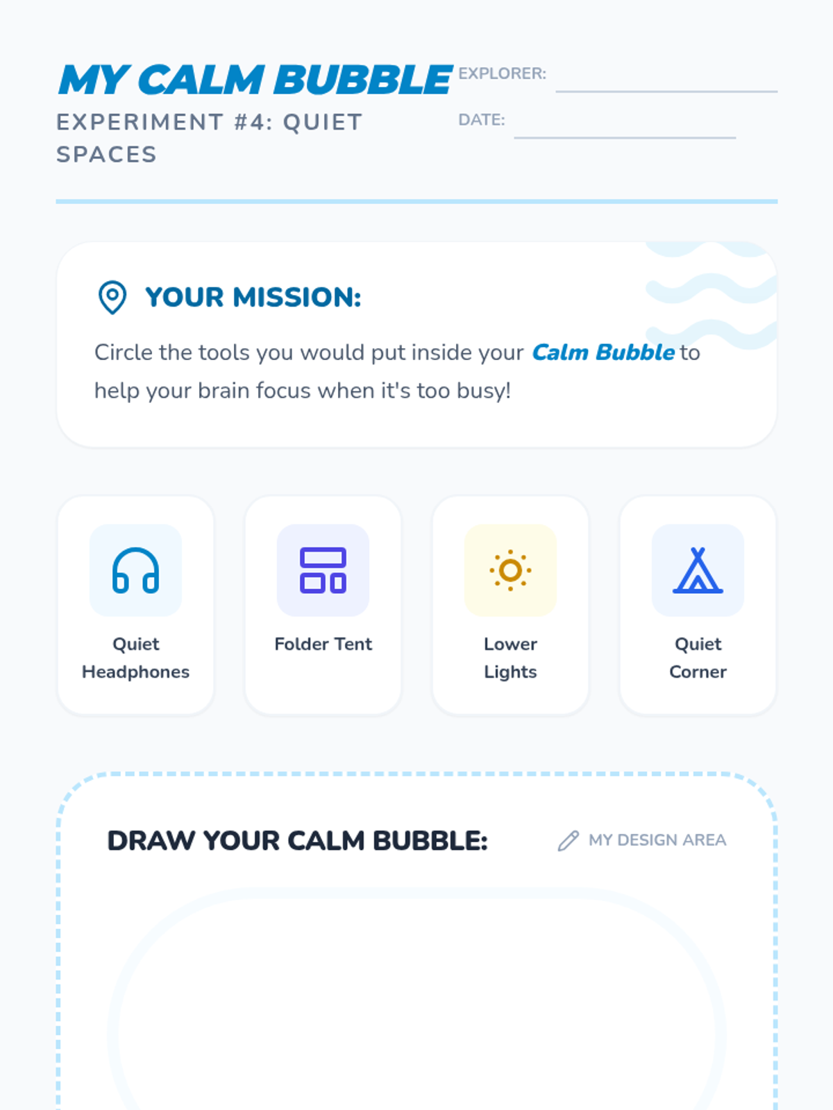 This inquiry-based sequence for 1st-grade students explores sensory tools as functional aids for dysregulation recovery. Students test proprioceptive, tactile, visual, and auditory inputs to build a personalized 'sensory menu' for returning to a calm state.