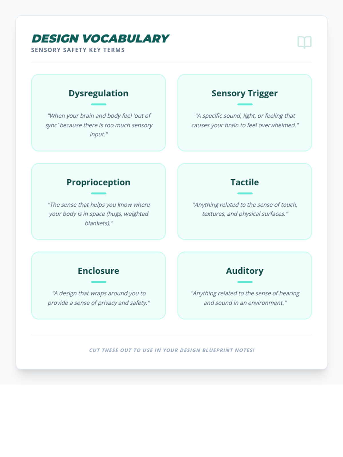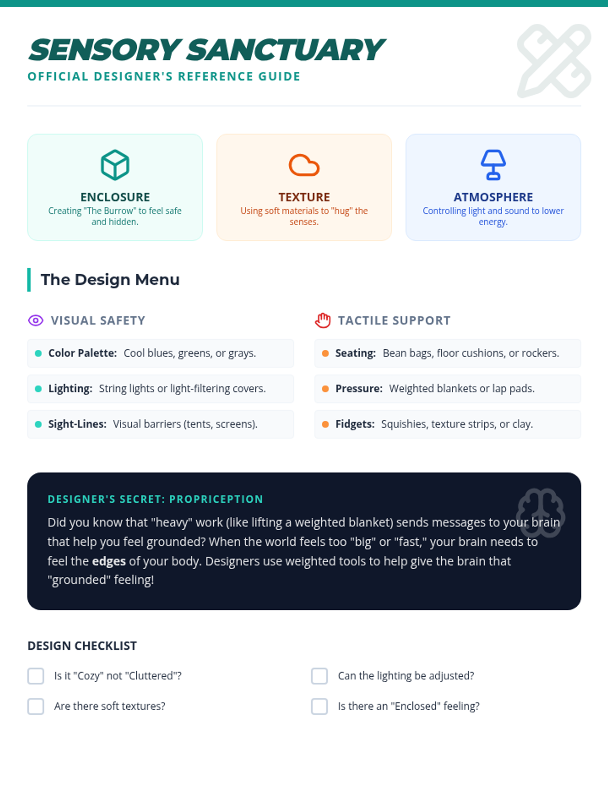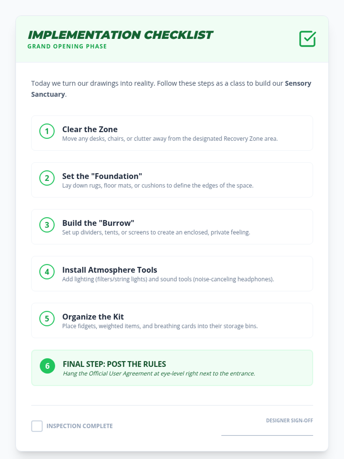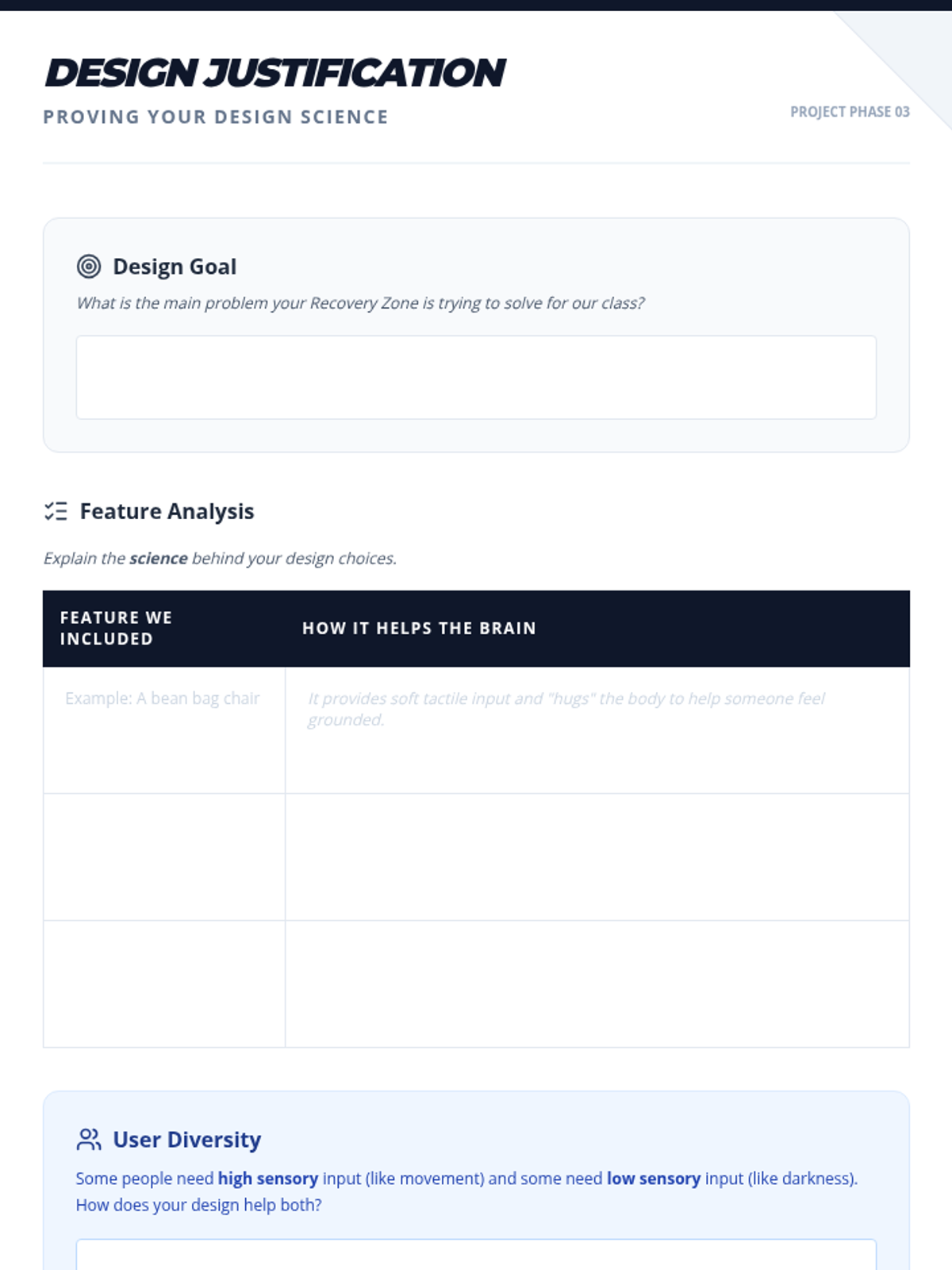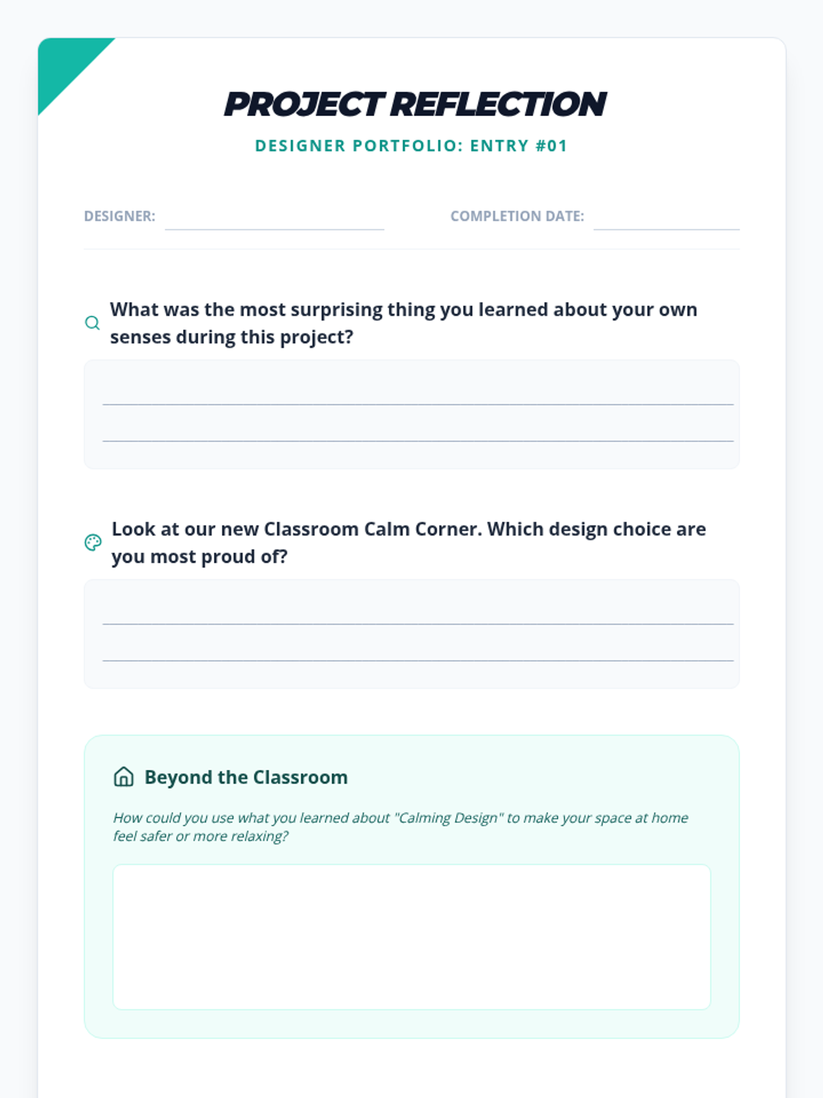 This project-based sequence empowers 4th-grade students to analyze their physical environment and design spaces that support sensory regulation. Acting as 'Interior Designers for the Brain,' students audit their surroundings, learn design principles for calming, and collaboratively build a classroom 'Calm Corner' for dysregulation recovery.